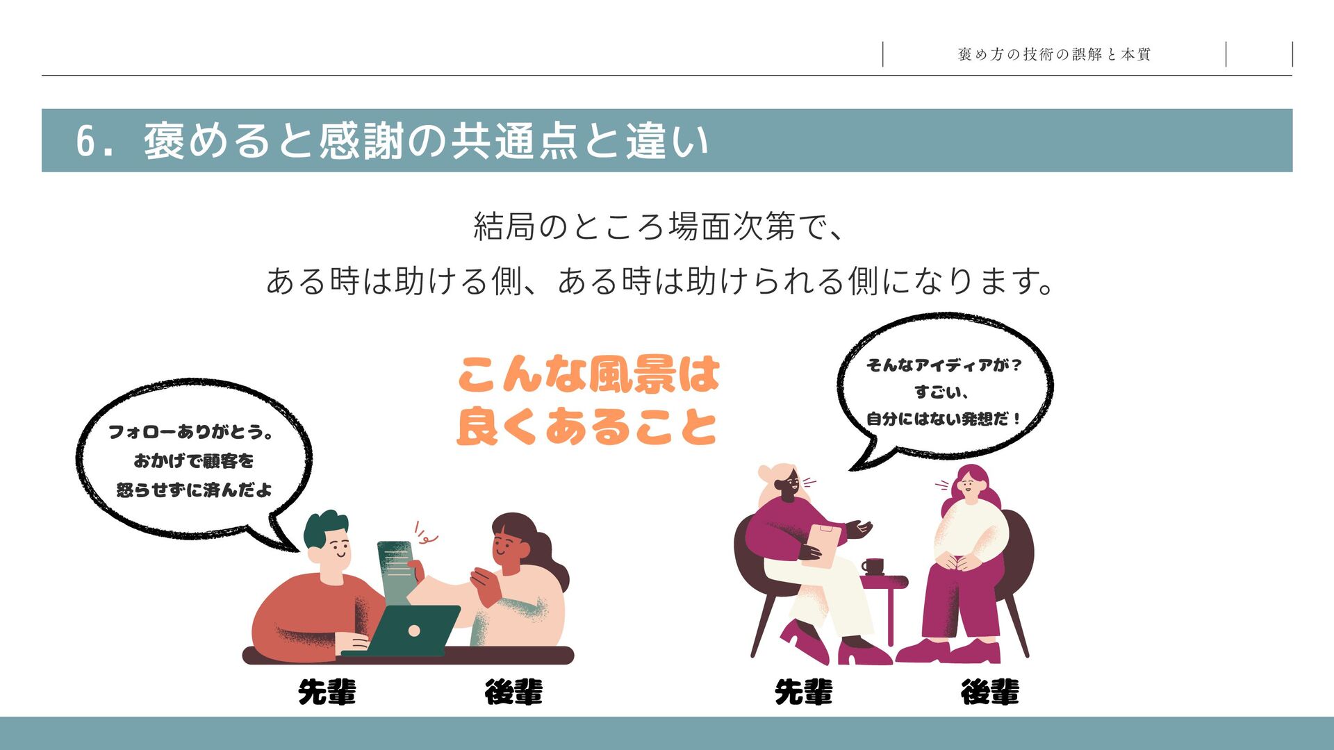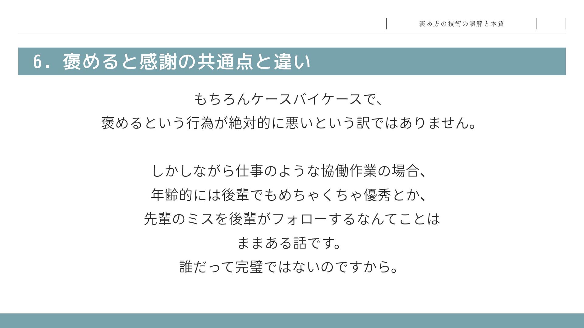 褒め方の技術の誤解と本質 もちろんケースバイケースで、 褒めるという行為が絶対的に悪いという訳ではありません。 しかしながら仕事のような協働作業の場合、 年齢的には後輩でもめちゃくちゃ優秀とか、 先輩のミスを後輩がフォローするなんてことは ままある話です。 誰だって完璧ではないのですから。 6. 褒めると感謝の共通点と違い