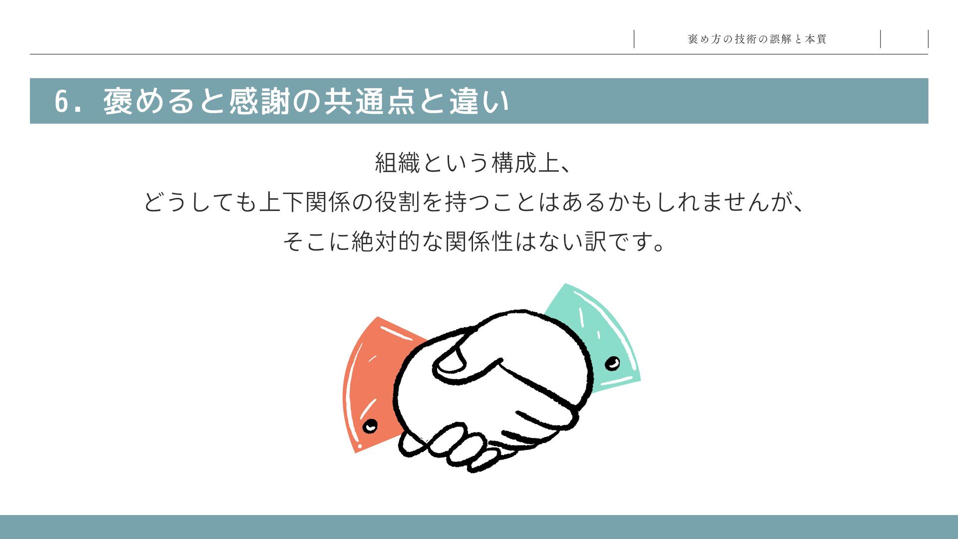 褒め方の技術の誤解と本質 組織という構成上、 どうしても上下関係の役割を持つことはあるかもしれませんが、 そこに絶対的な関係性はない訳です。 6. 褒めると感謝の共通点と違い