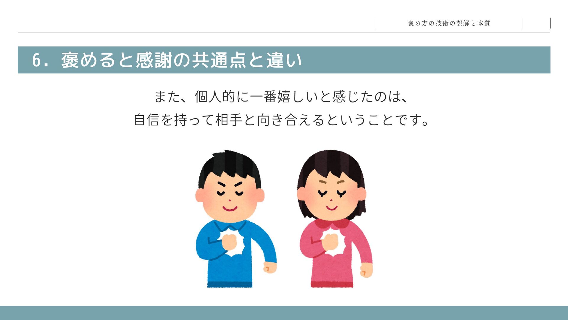褒め方の技術の誤解と本質 また、個人的に一番嬉しいと感じたのは、 自信を持って相手と向き合えるということです。 6. 褒めると感謝の共通点と違い
