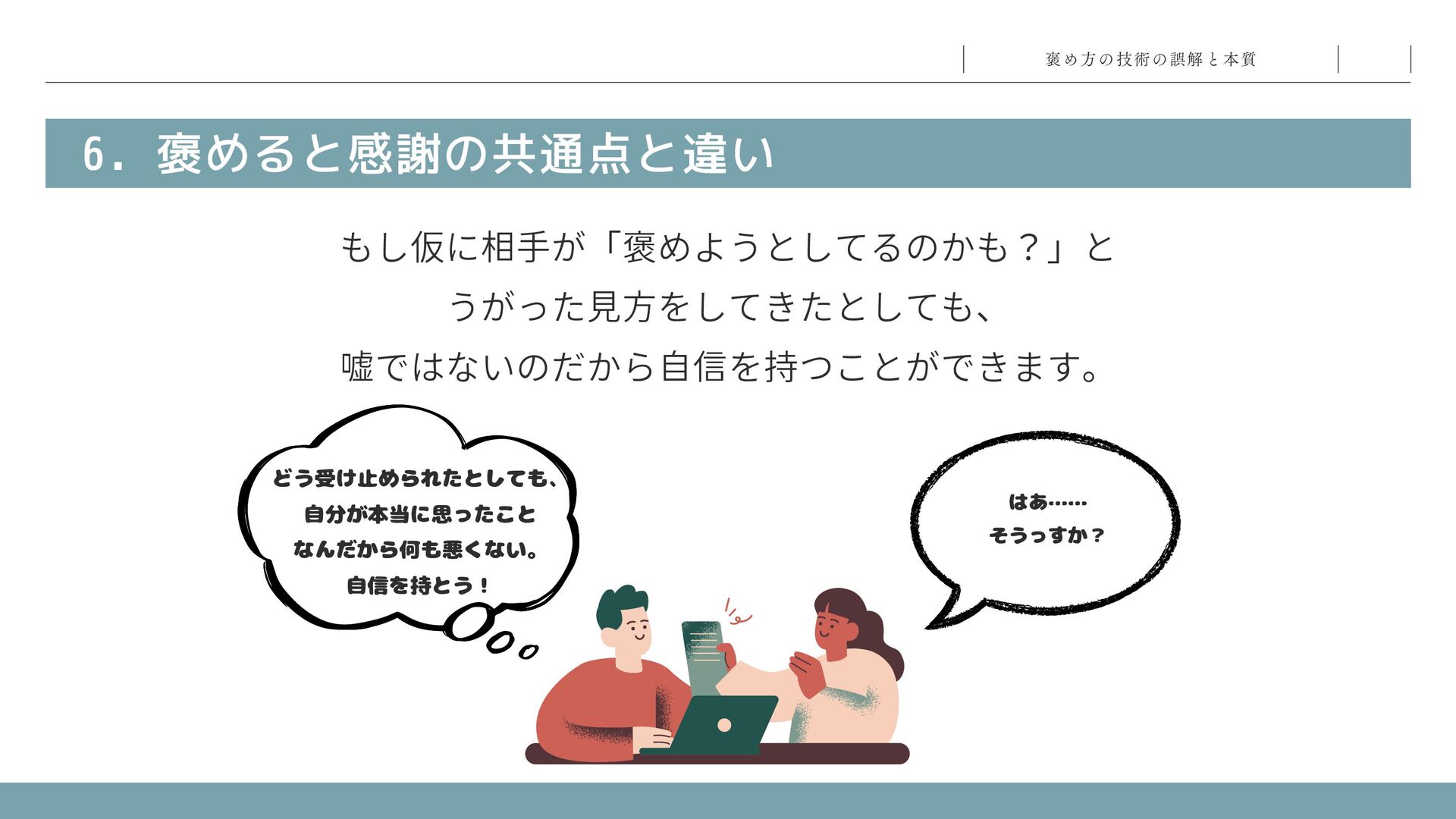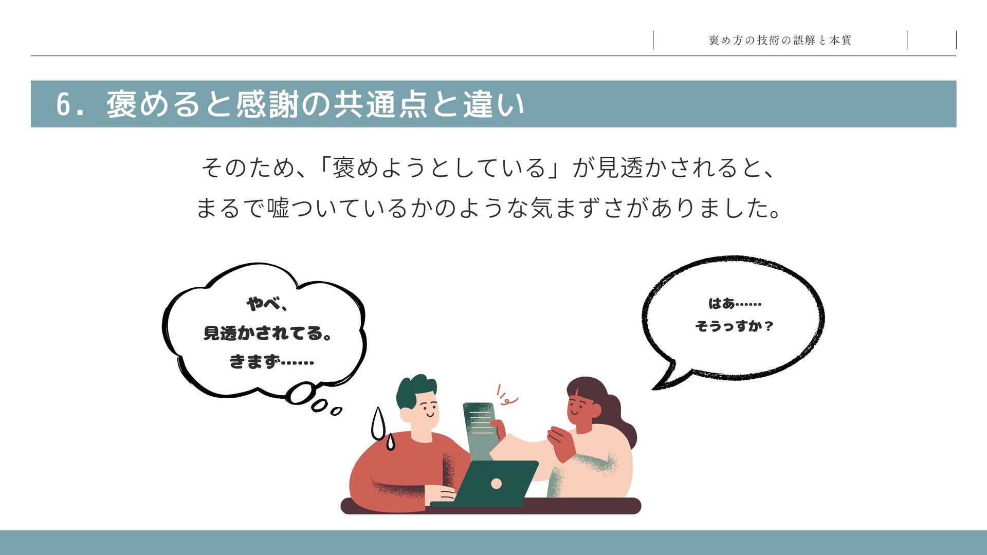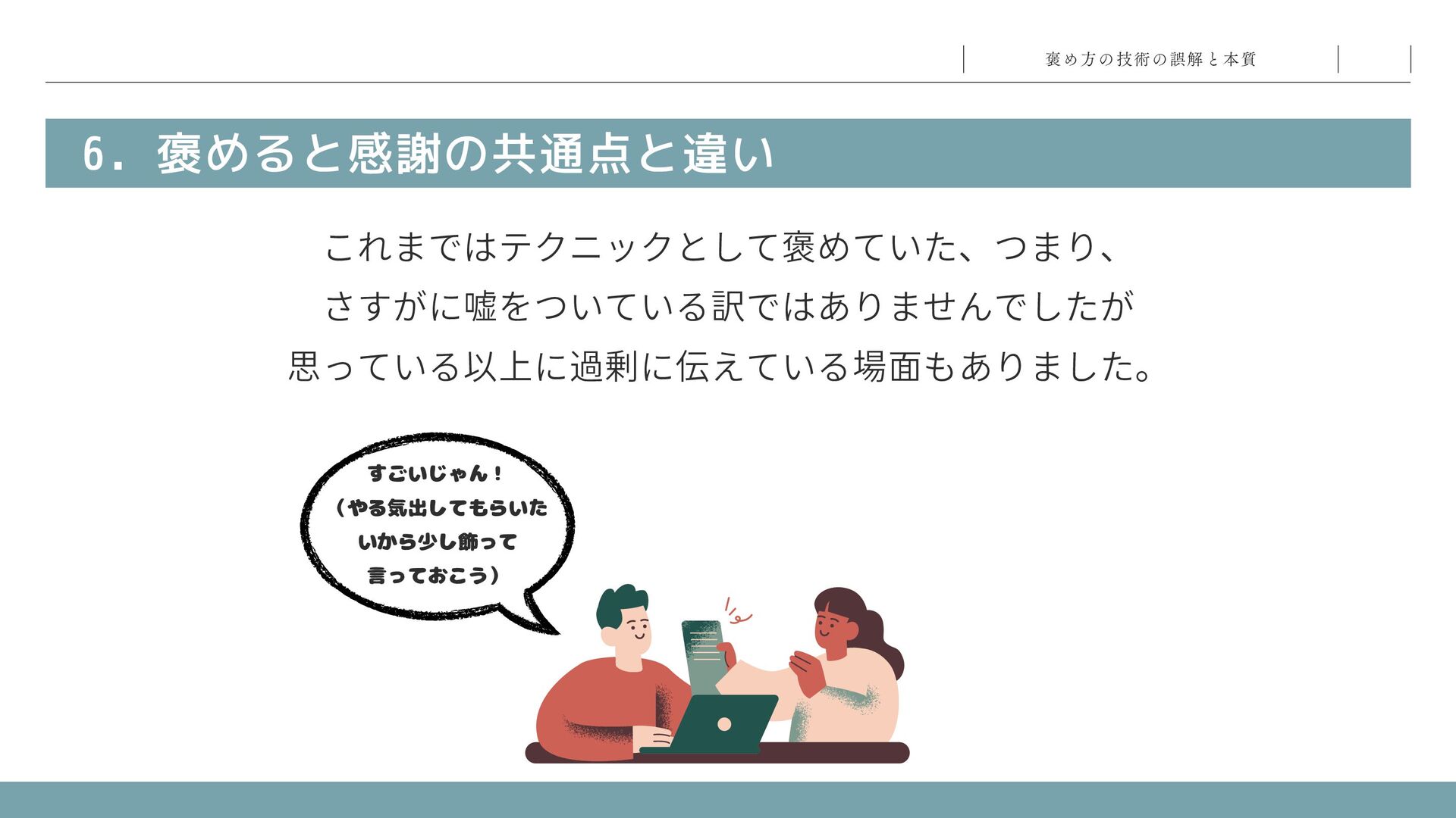 褒め方の技術の誤解と本質 これまではテクニックとして褒めていた、つまり、 さすがに嘘をついている訳ではありませんでしたが 思っている以上に過剰に伝えている場面もありました。 6. 褒めると感謝の共通点と違い すごいじゃん! (やる気出してもらいた いから少し飾って 言っておこう)