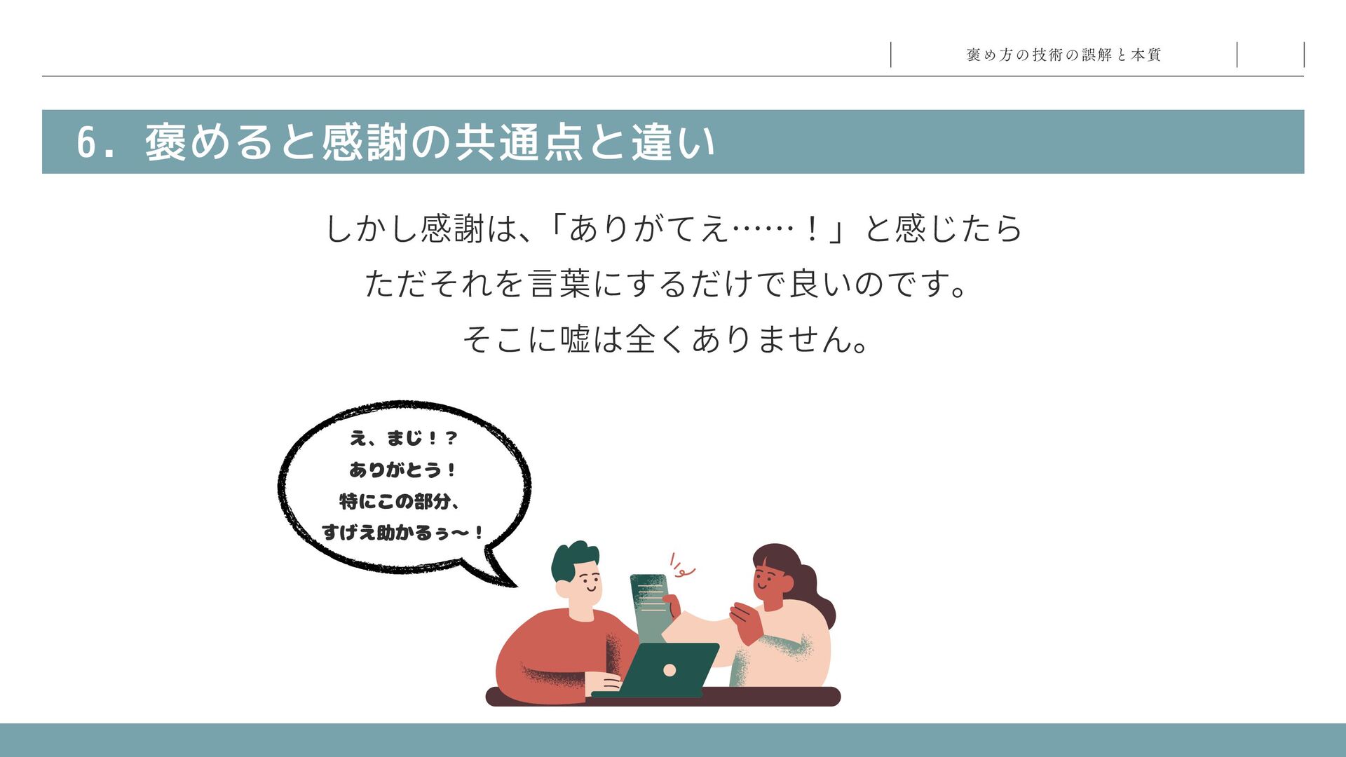 褒め方の技術の誤解と本質 しかし感謝は、 「ありがてえ……!」と感じたら ただそれを言葉にするだけで良いのです。 そこに嘘は全くありません。 6. 褒めると感謝の共通点と違い え、まじ!? ありがとう! 特にこの部分、