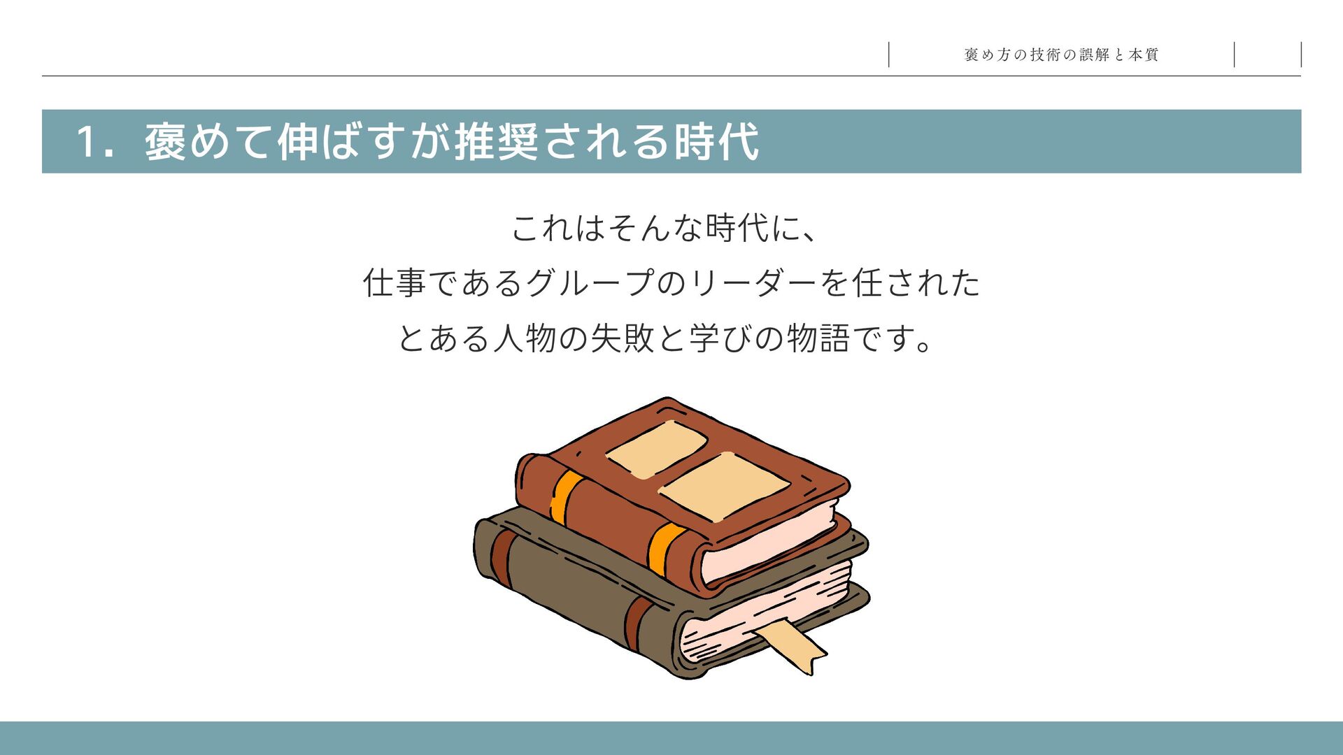 褒め方の技術の誤解と本質 1. 褒めて伸ばすが推奨される時代 これはそんな時代に、 仕事であるグループのリーダーを任された とある人物の失敗と学びの物語です。