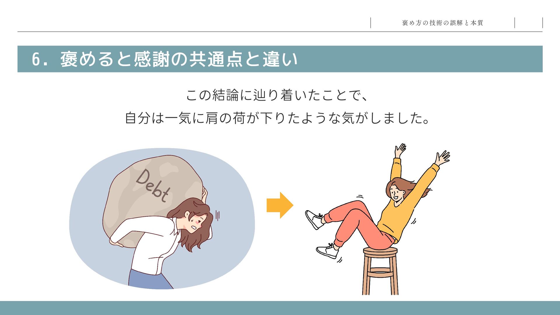 褒め方の技術の誤解と本質 この結論に辿り着いたことで、 自分は一気に肩の荷が下りたような気がしました。 6. 褒めると感謝の共通点と違い