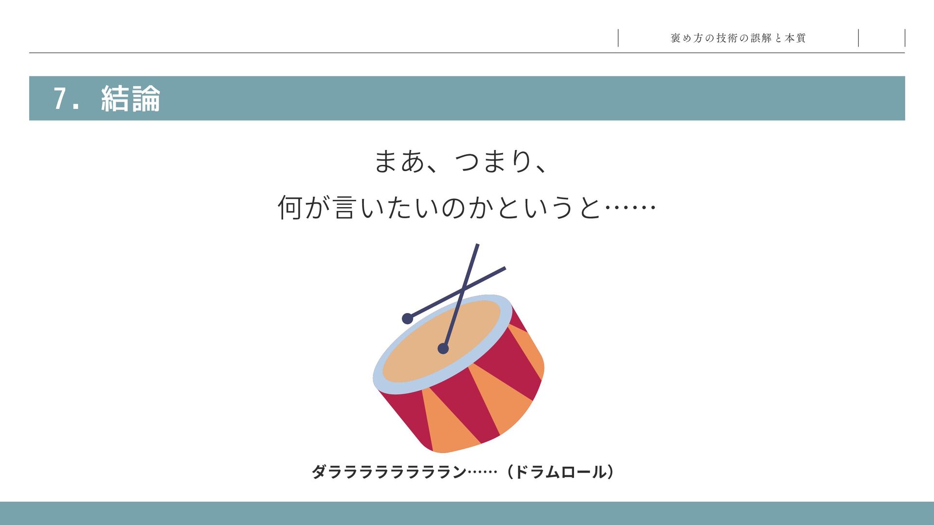 褒め方の技術の誤解と本質 まあ、つまり、 何が言いたいのかというと…… 7. 結論 ダララララララララン……(ドラムロール)