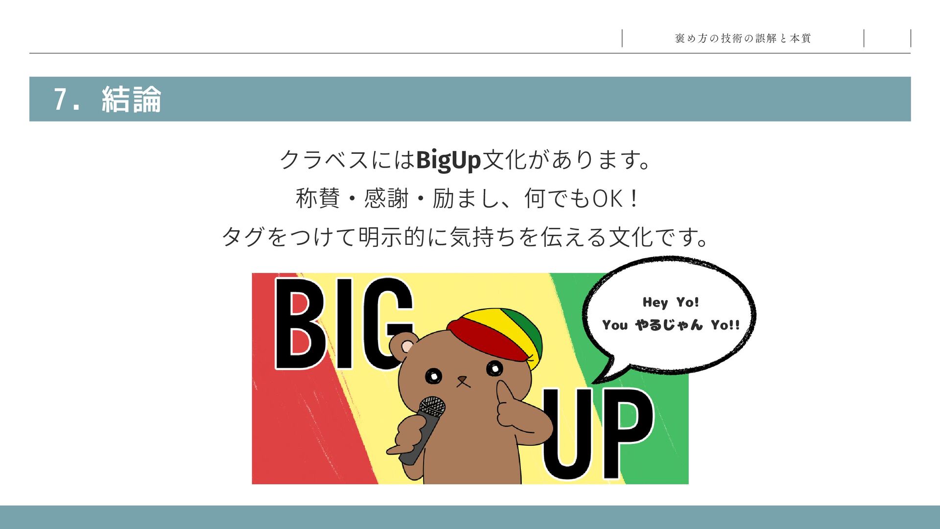 褒め方の技術の誤解と本質 クラベスにはBigUp文化があります。 称賛・感謝・励まし、何でもOK! タグをつけて明示的に気持ちを伝える文化です。 7. 結論 Hey Yo! You やるじゃん
