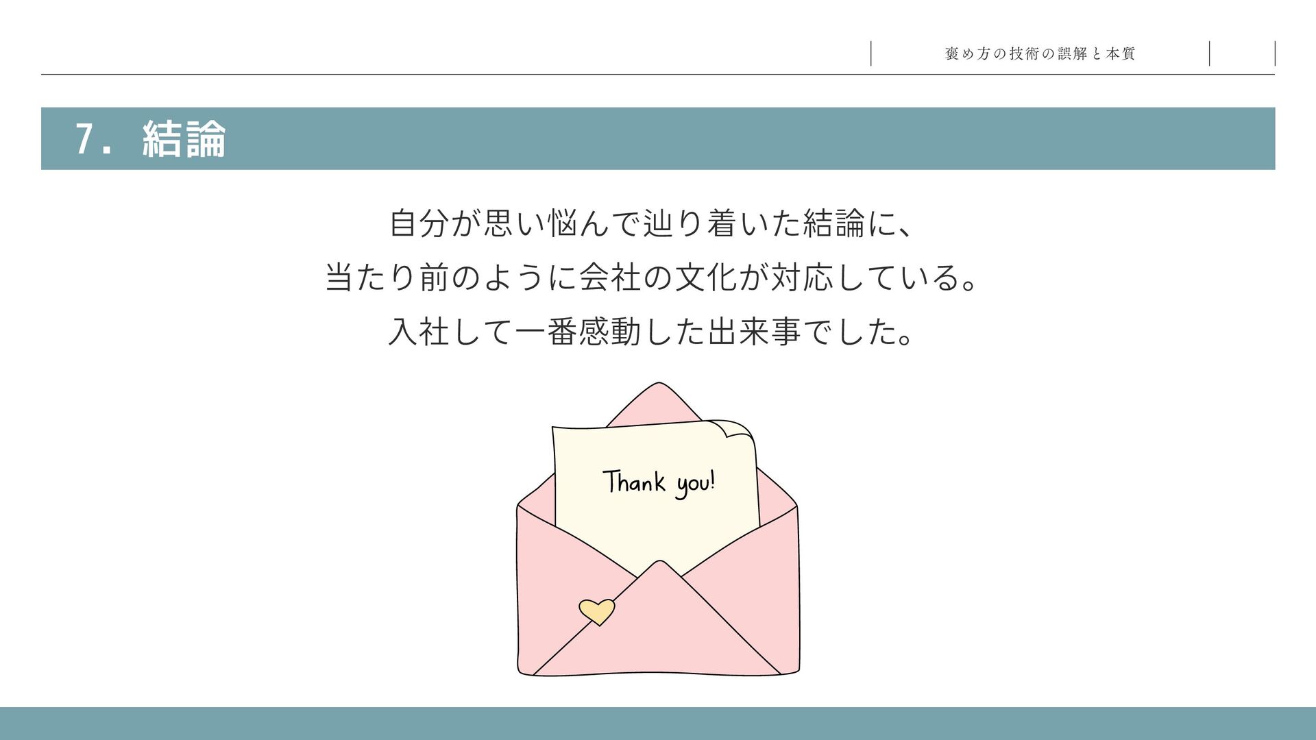 褒め方の技術の誤解と本質 自分が思い悩んで辿り着いた結論に、 当たり前のように会社の文化が対応している。 入社して一番感動した出来事でした。 7. 結論