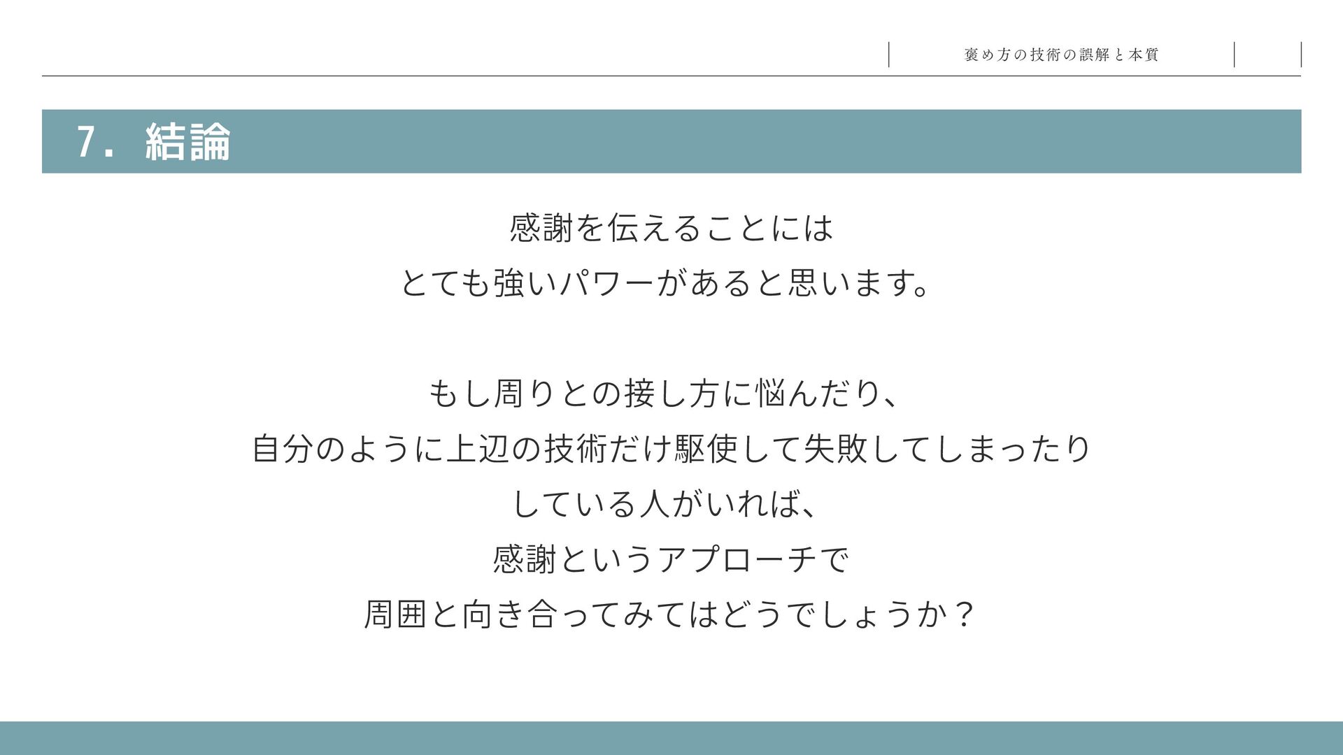 褒め方の技術の誤解と本質 感謝を伝えることには とても強いパワーがあると思います。 もし周りとの接し方に悩んだり、 自分のように上辺の技術だけ駆使して失敗してしまったり している人がいれば、 感謝というアプローチで 周囲と向き合ってみてはどうでしょうか? 7. 結論