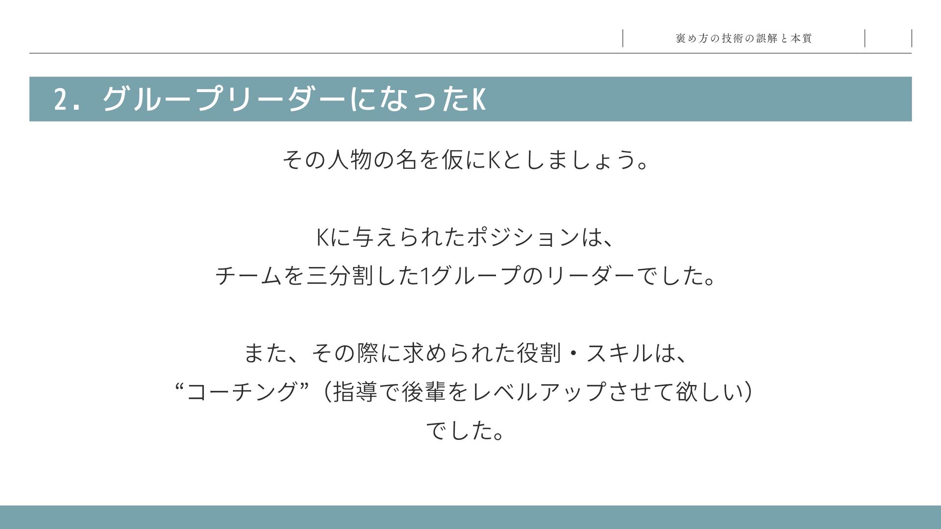 褒め方の技術の誤解と本質 2. グループリーダーになったK その人物の名を仮にKとしましょう。 Kに与えられたポジションは、 チームを三分割した1グループのリーダーでした。 また、その際に求められた役割・スキルは、 “コーチング”(指導で後輩をレベルアップさせて欲しい) でした。