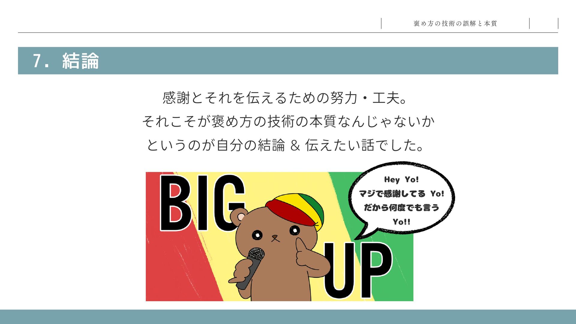 褒め方の技術の誤解と本質 感謝とそれを伝えるための努力・工夫。 それこそが褒め方の技術の本質なんじゃないか というのが自分の結論 & 伝えたい話でした。 7. 結論 Hey Yo!