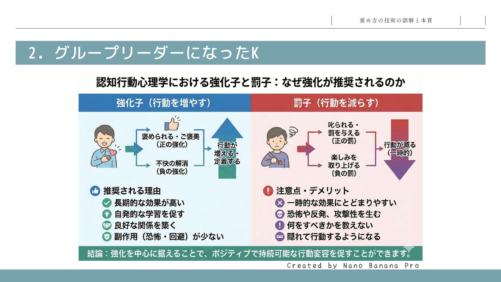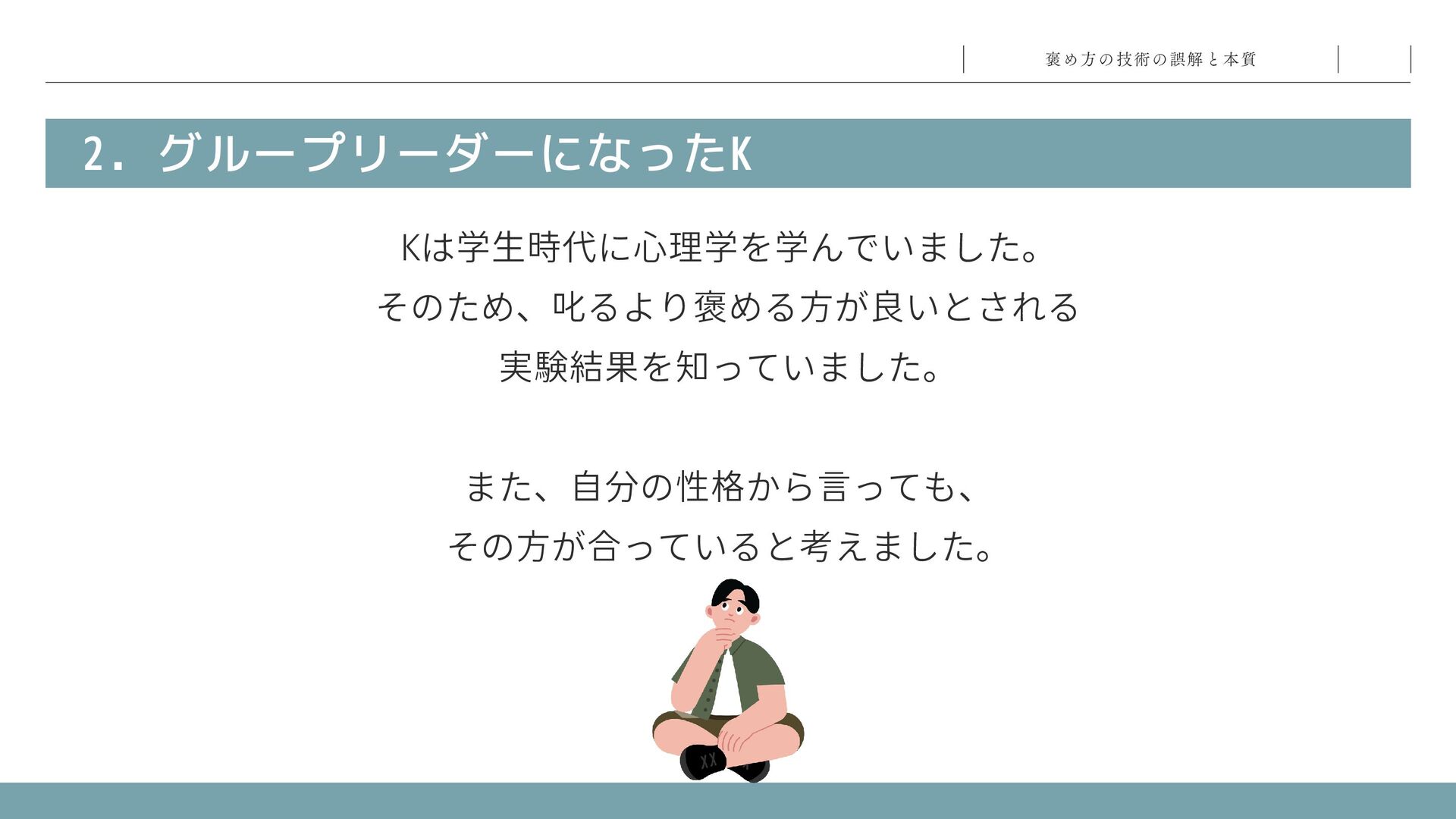 褒め方の技術の誤解と本質 Kは学生時代に心理学を学んでいました。 そのため、叱るより褒める方が良いとされる 実験結果を知っていました。 また、自分の性格から言っても、 その方が合っていると考えました。 2. グループリーダーになったK
