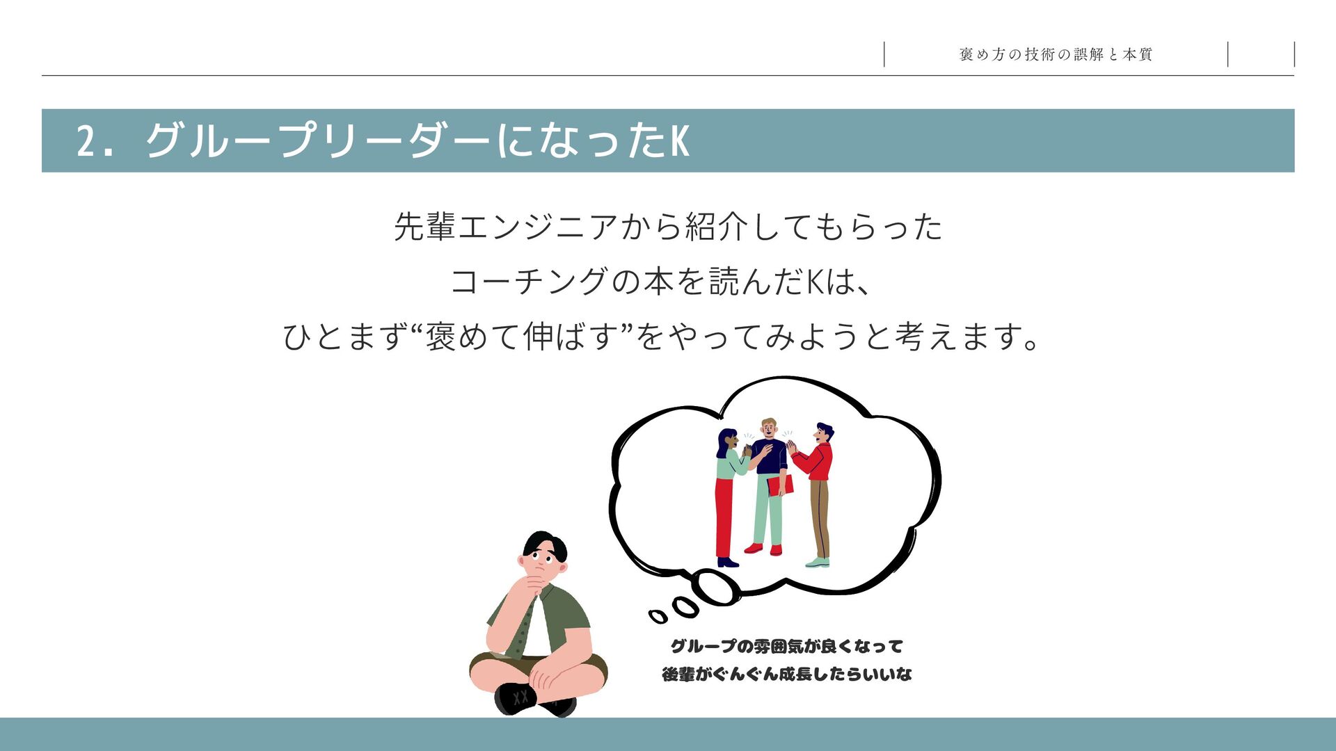 褒め方の技術の誤解と本質 2. グループリーダーになったK 先輩エンジニアから紹介してもらった コーチングの本を読んだKは、 ひとまず“褒めて伸ばす”をやってみようと考えます。 グループの雰囲気が良くなって 後輩がぐんぐん成長したらいいな
