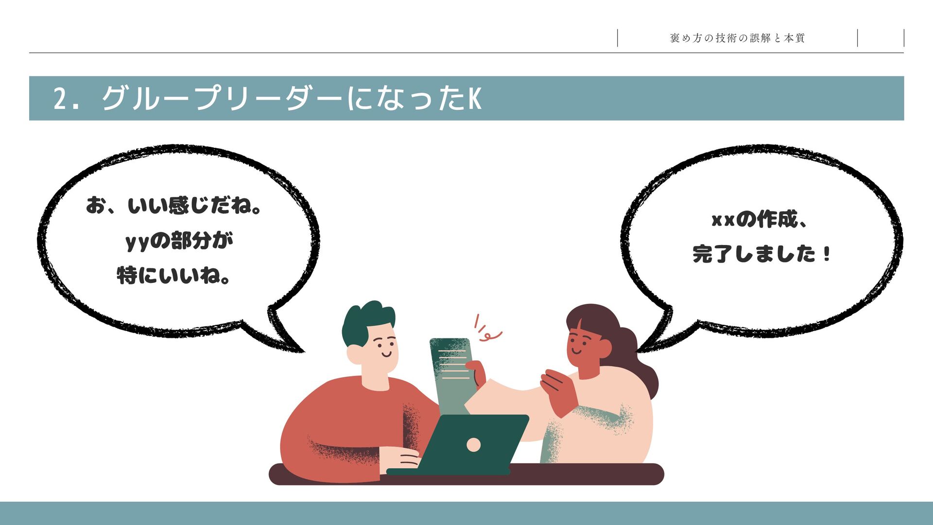 褒め方の技術の誤解と本質 2. グループリーダーになったK xxの作成、 完了しました! お、いい感じだね。 yyの部分が 特にいいね。