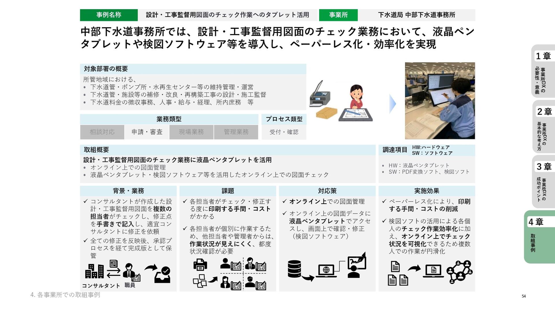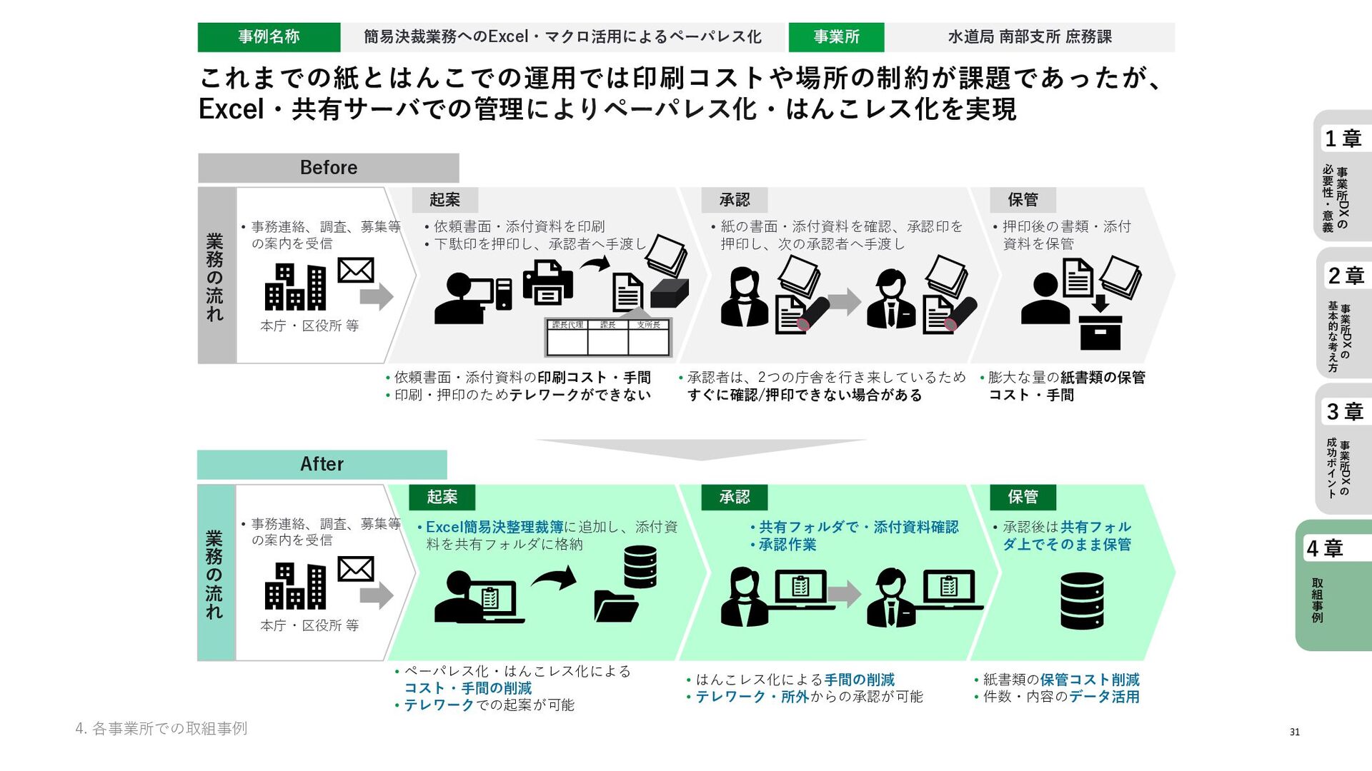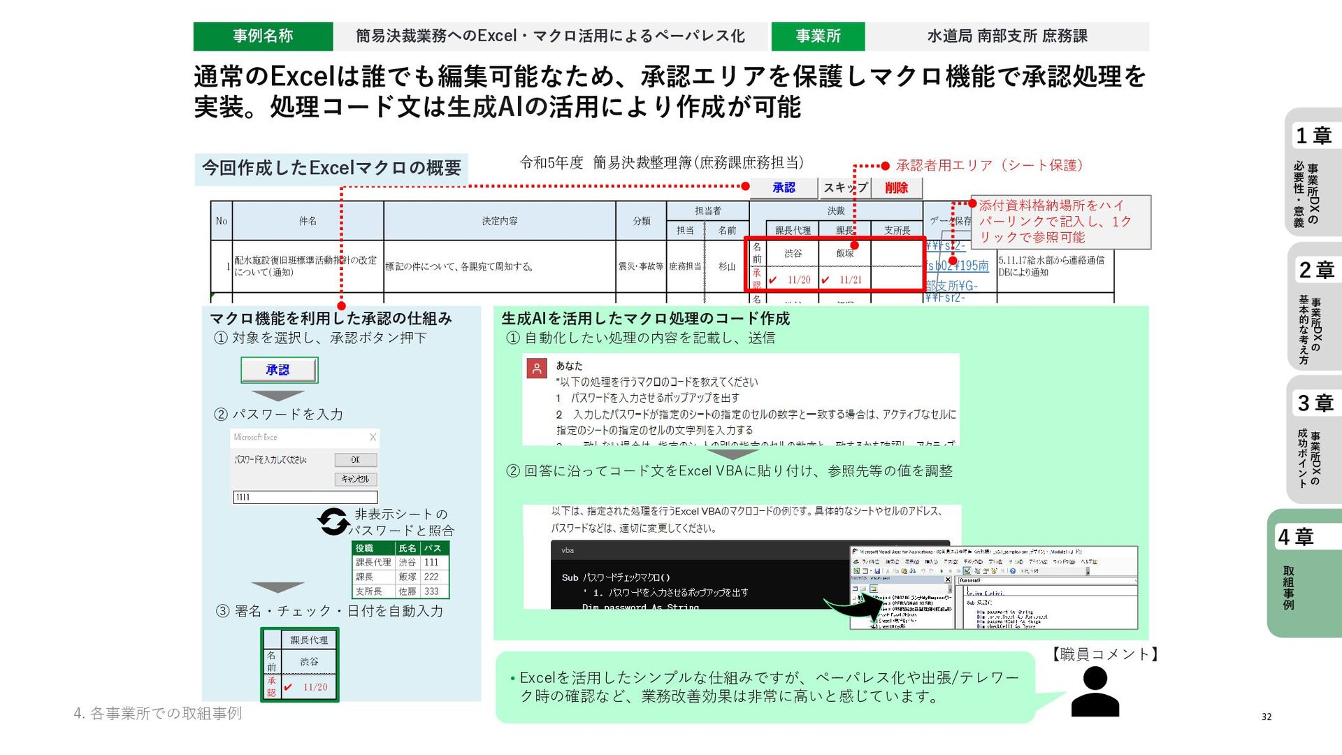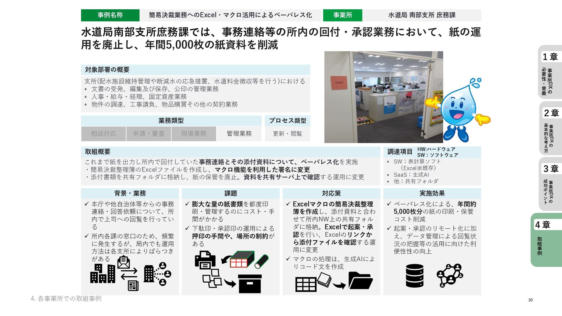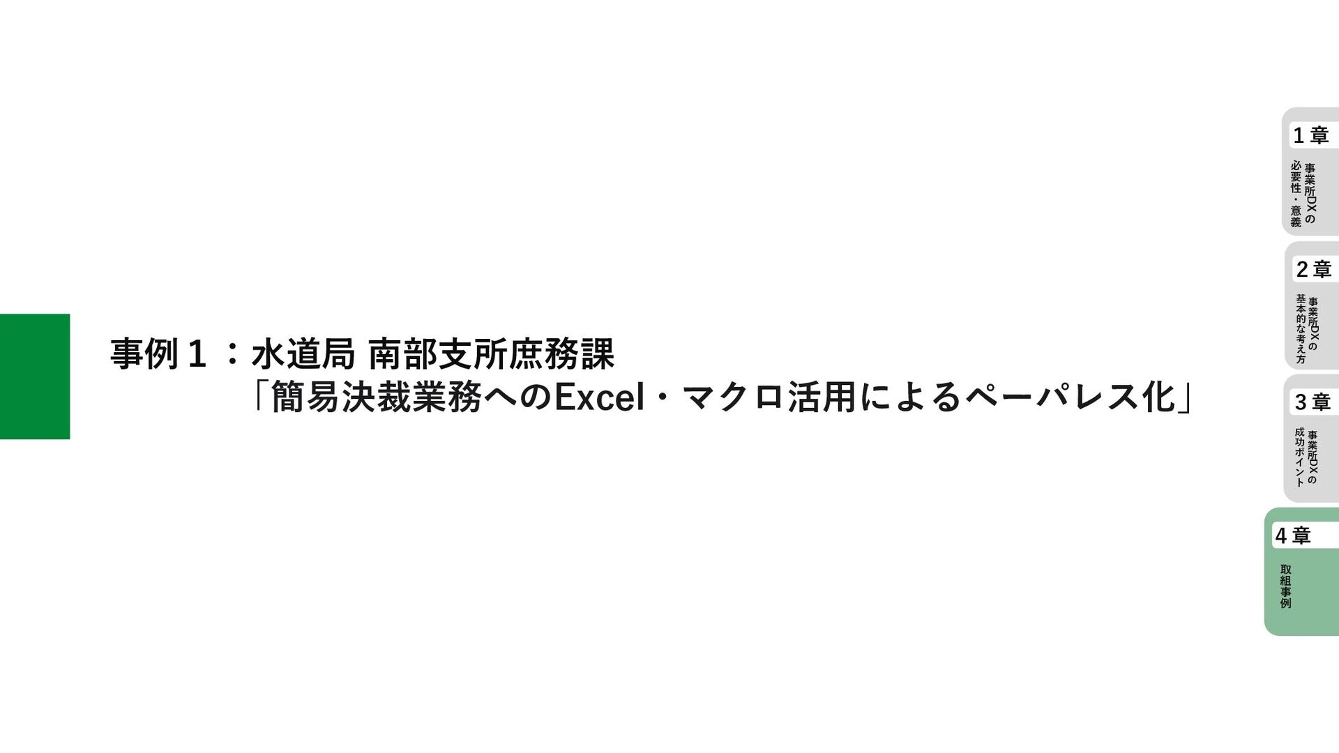 がある これまで紙を出力し所内で回付していた事務連絡とその添付資料について、ペーパレス化を実施 ・簡易決裁整理簿のExcelファイルを作成し、マクロ機能を利用した署名に変更 ・添付書類を共有フォルダに格納し、紙の保管を廃止。資料を共有サーバ上で確認する運用に変更 背景・業務 課題 対応策 実施効果 ✓ 膨大な量の紙書類を都度印 刷・管理するのにコスト・手 間がかかる ✓ 下駄印・承認印の運用による 押印の手間や、場所の制約が ある ✓ Excelマクロの簡易決裁整理 簿を作成し、添付資料と合わ せて所内NW上の共有フォル ダに格納。Excelで起案・承 認を行い、Excelのリンクか ら添付ファイルを確認する運 用に変更 ✓ マクロの処理は、生成AIによ りコード文を作成 ✓ ペーパレス化による、年間約 5,000枚分の紙の印刷・保管 コスト削減 ✓ 起案・承認のリモート化に加 え、データ管理による回覧状 況の把握等の活用に向けた利 便性性の向上 取組概要 プロセス類型 更新・閲覧 対象部署の概要 • SW:表計算ソフト (Excel※既存) • SaaS:生成AI • 他:共有フォルダ 調達項目 水道局南部支所庶務課では、事務連絡等の所内の回付・承認業務において、紙の運 用を廃止し、年間5,000枚の紙資料を削減 相談対応 申請・審査 現場業務 管理業務 業務類型 HW:ハードウェア SW:ソフトウェア 4. 各事業所での取組事例 簡易決裁業務へのExcel・マクロ活用によるペーパレス化 事例名称 水道局 南部支所 庶務課 事業所 取 組 事 例 4章 事 業 所 DX の 成 功 ポ イ ン ト 3章 事 業 所 DX の 必 要 性 ・ 意 義 1章 事 業 所 DX の 基 本 的 な 考 え 方 2章 支所(配水施設維持管理や断減水の応急措置、水道料金徴収等を行う)における • 文書の受発、編集及び保存、公印の管理業務 • 人事・給与・経理、固定資産業務 • 物件の調達、工事請負、物品購買その他の契約業務