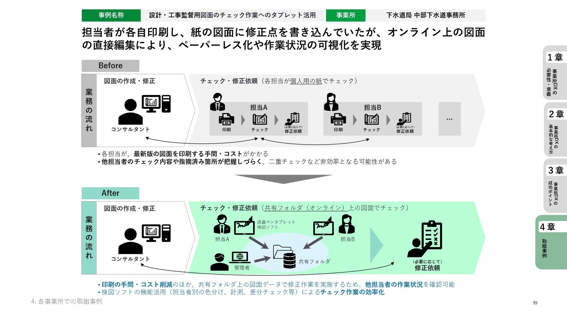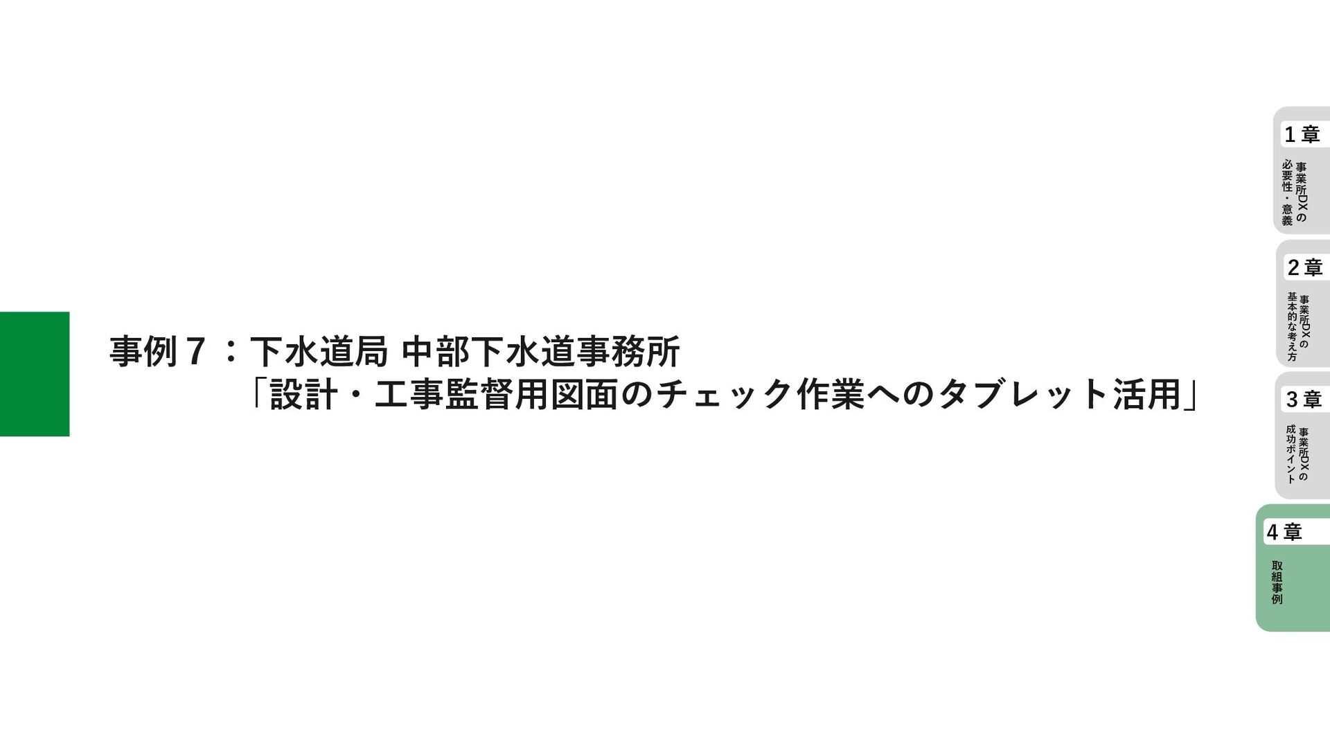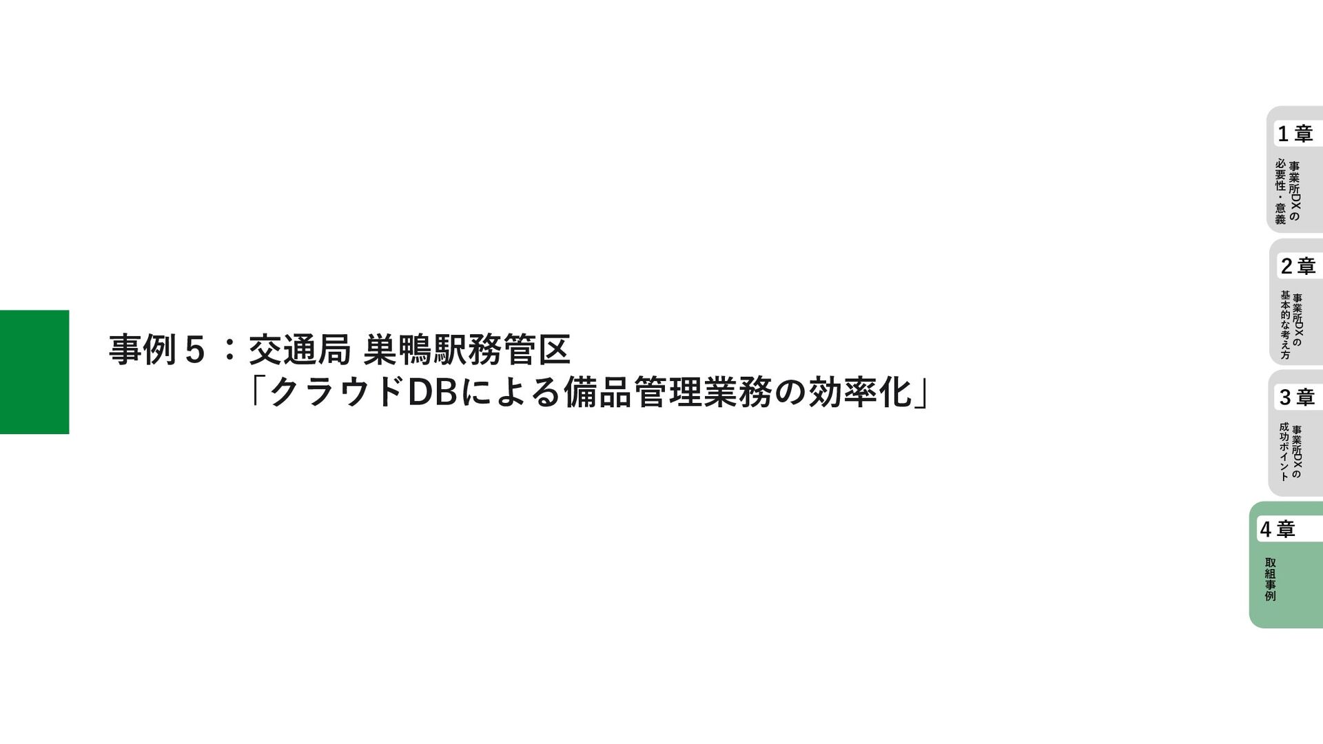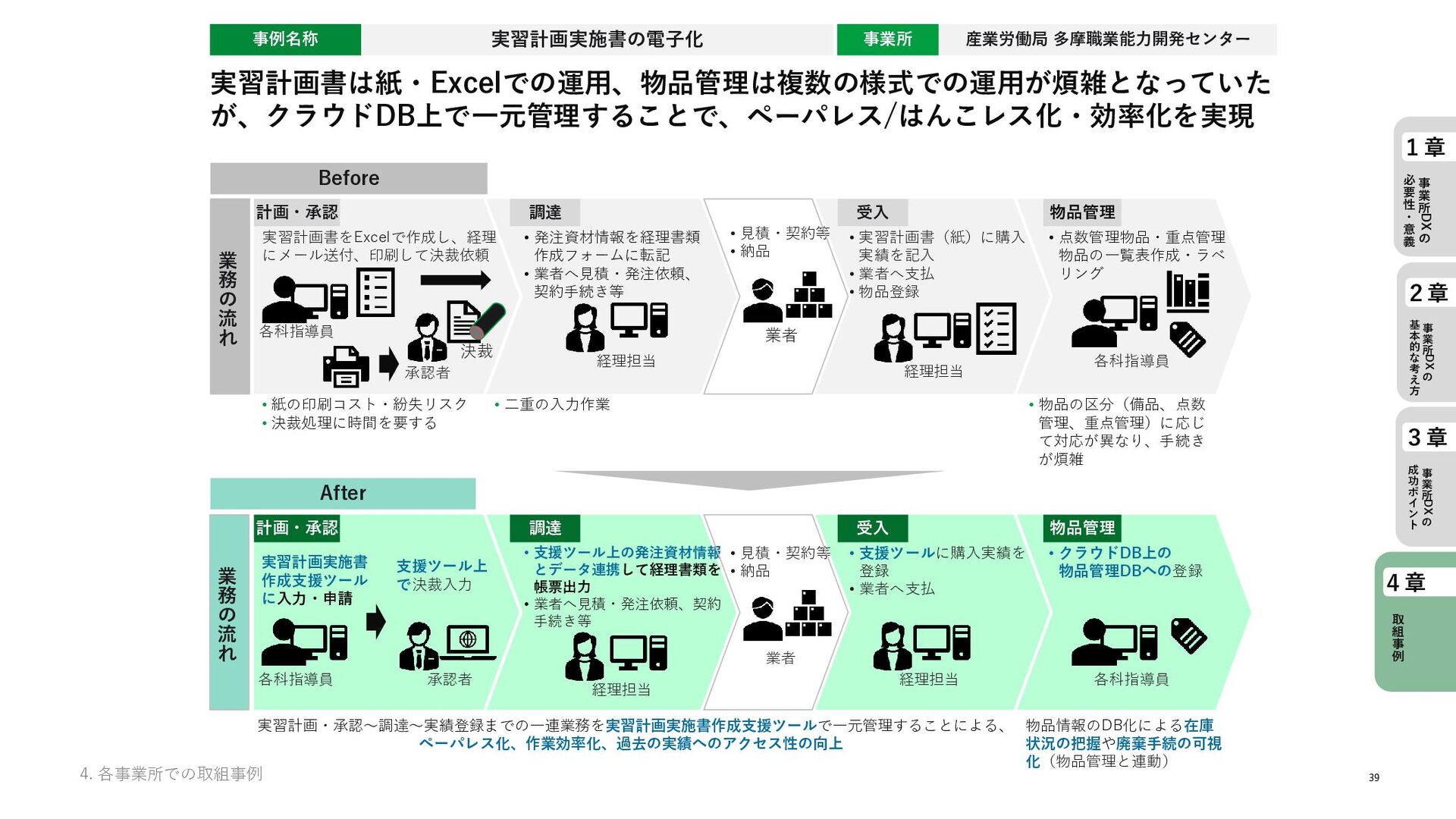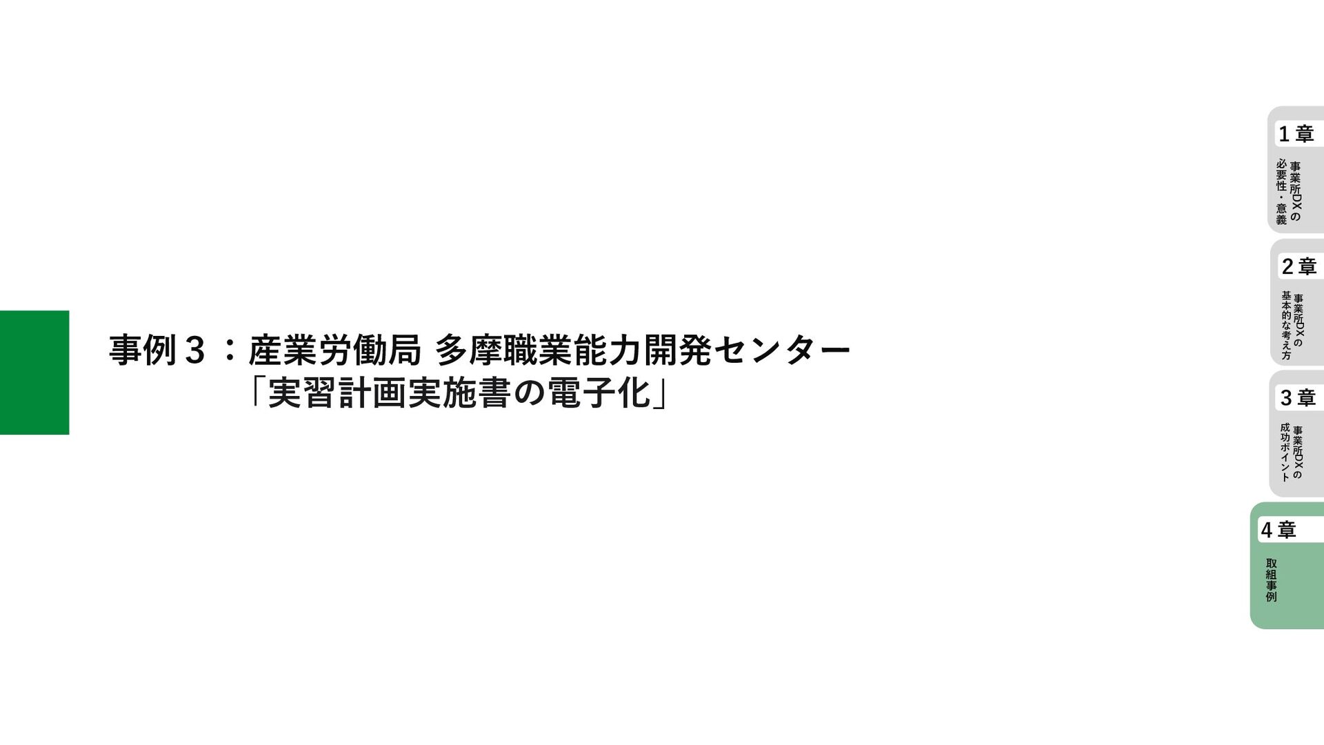 がある これまで紙を出力し所内で回付していた事務連絡とその添付資料について、ペーパレス化を実施 ・簡易決裁整理簿のExcelファイルを作成し、マクロ機能を利用した署名に変更 ・添付書類を共有フォルダに格納し、紙の保管を廃止。資料を共有サーバ上で確認する運用に変更 背景・業務 課題 対応策 実施効果 ✓ 膨大な量の紙書類を都度印 刷・管理するのにコスト・手 間がかかる ✓ 下駄印・承認印の運用による 押印の手間や、場所の制約が ある ✓ Excelマクロの簡易決裁整理 簿を作成し、添付資料と合わ せて所内NW上の共有フォル ダに格納。Excelで起案・承 認を行い、Excelのリンクか ら添付ファイルを確認する運 用に変更 ✓ マクロの処理は、生成AIによ りコード文を作成 ✓ ペーパレス化による、年間約 5,000枚分の紙の印刷・保管 コスト削減 ✓ 起案・承認のリモート化に加 え、データ管理による回覧状 況の把握等の活用に向けた利 便性性の向上 取組概要 プロセス類型 更新・閲覧 対象部署の概要 • SW:表計算ソフト (Excel※既存) • SaaS:生成AI • 他:共有フォルダ 調達項目 水道局南部支所庶務課では、事務連絡等の所内の回付・承認業務において、紙の運 用を廃止し、年間5,000枚の紙資料を削減 相談対応 申請・審査 現場業務 管理業務 業務類型 HW:ハードウェア SW:ソフトウェア 4. 各事業所での取組事例 簡易決裁業務へのExcel・マクロ活用によるペーパレス化 事例名称 水道局 南部支所 庶務課 事業所 取 組 事 例 4章 事 業 所 DX の 成 功 ポ イ ン ト 3章 事 業 所 DX の 必 要 性 ・ 意 義 1章 事 業 所 DX の 基 本 的 な 考 え 方 2章 支所(配水施設維持管理や断減水の応急措置、水道料金徴収等を行う)における • 文書の受発、編集及び保存、公印の管理業務 • 人事・給与・経理、固定資産業務 • 物件の調達、工事請負、物品購買その他の契約業務