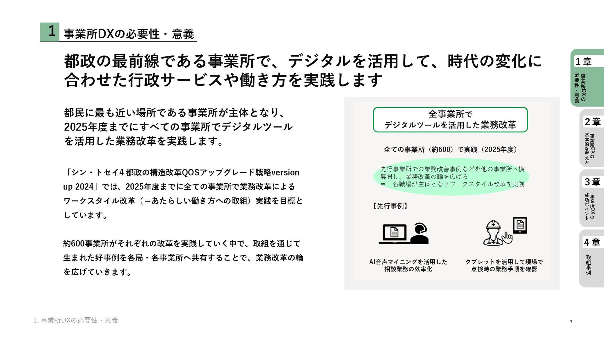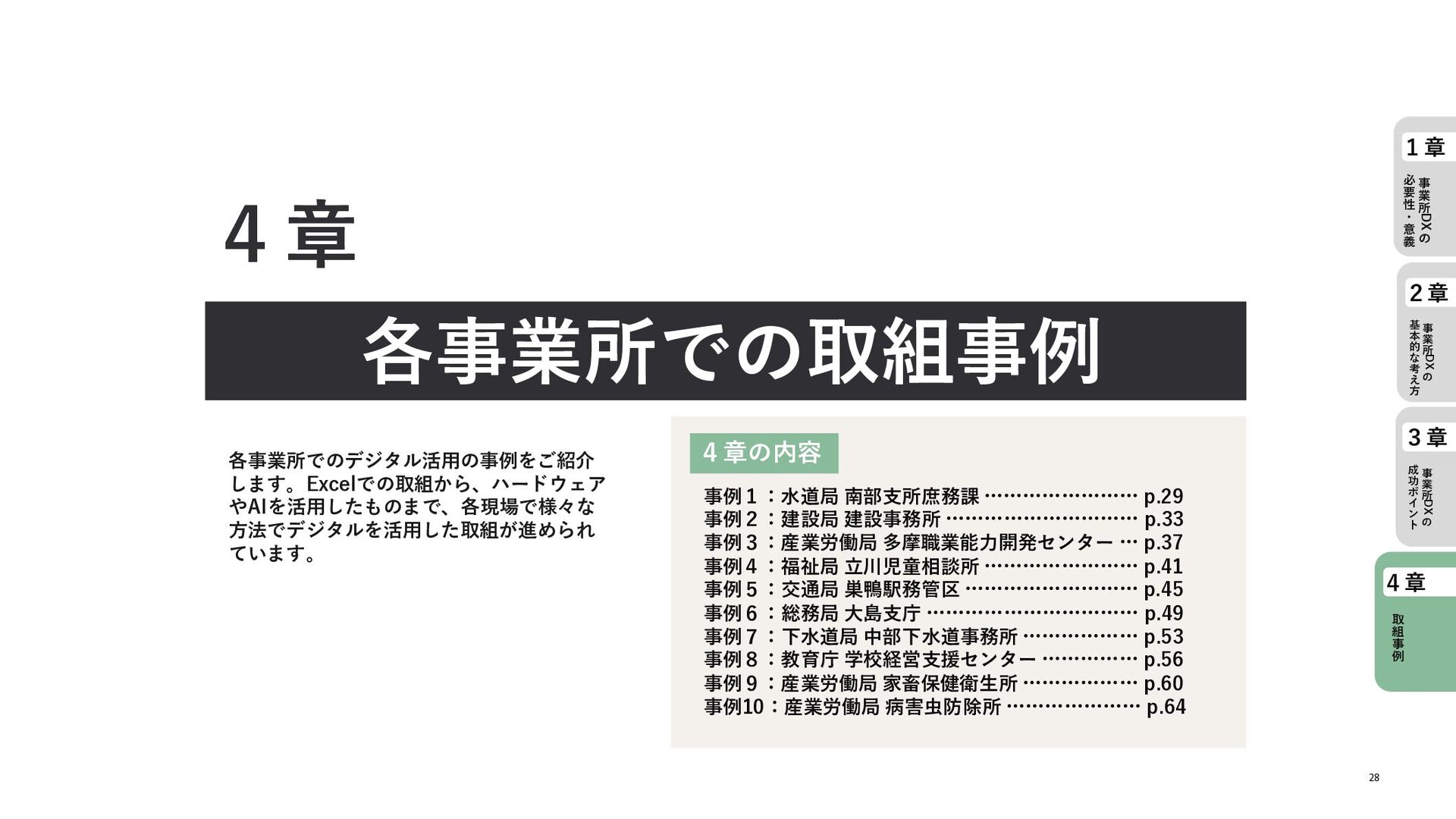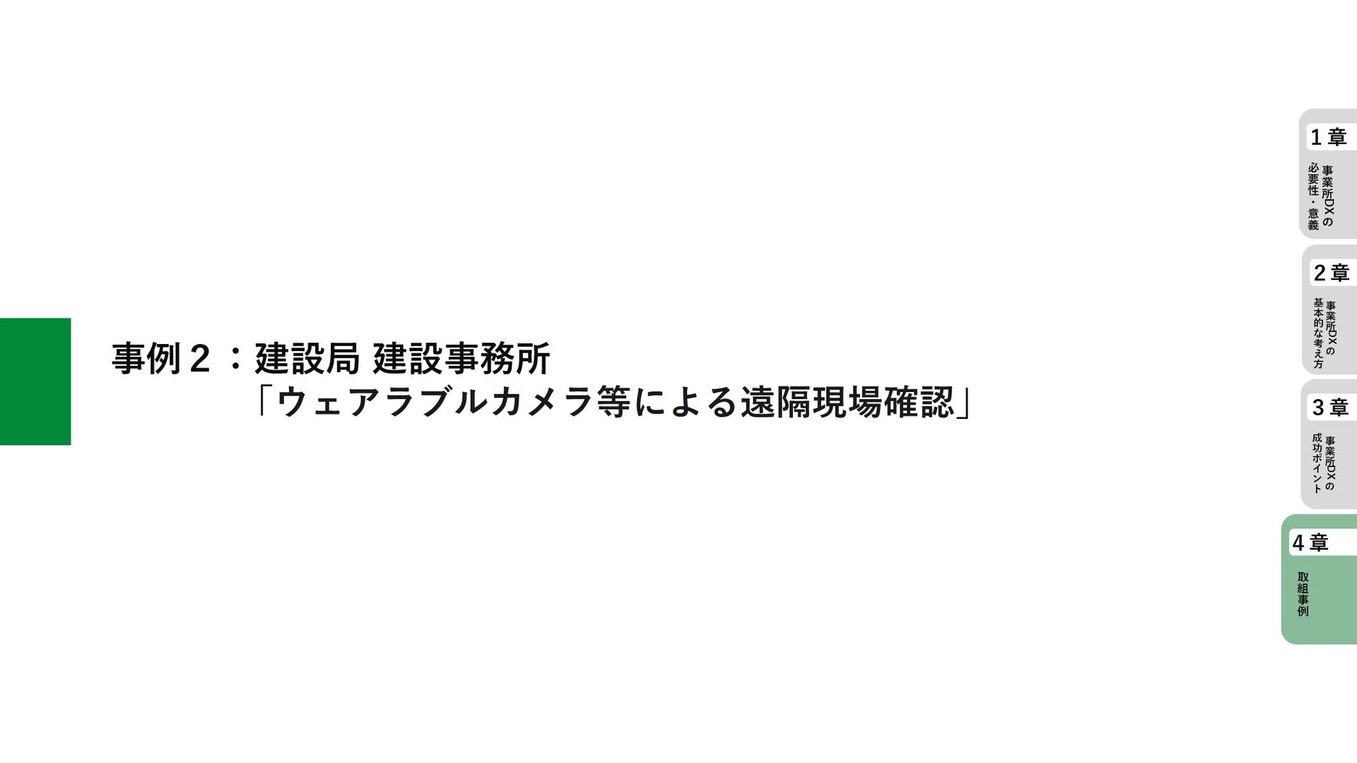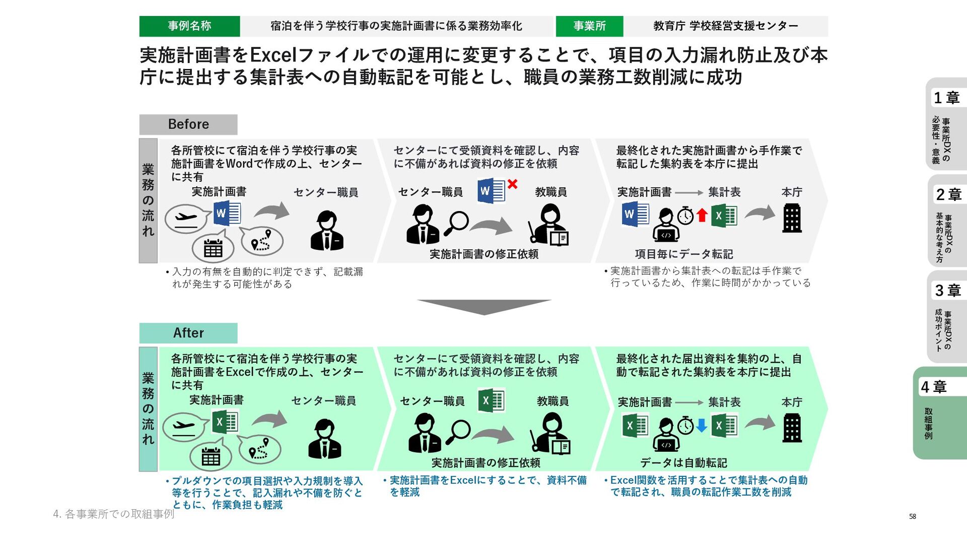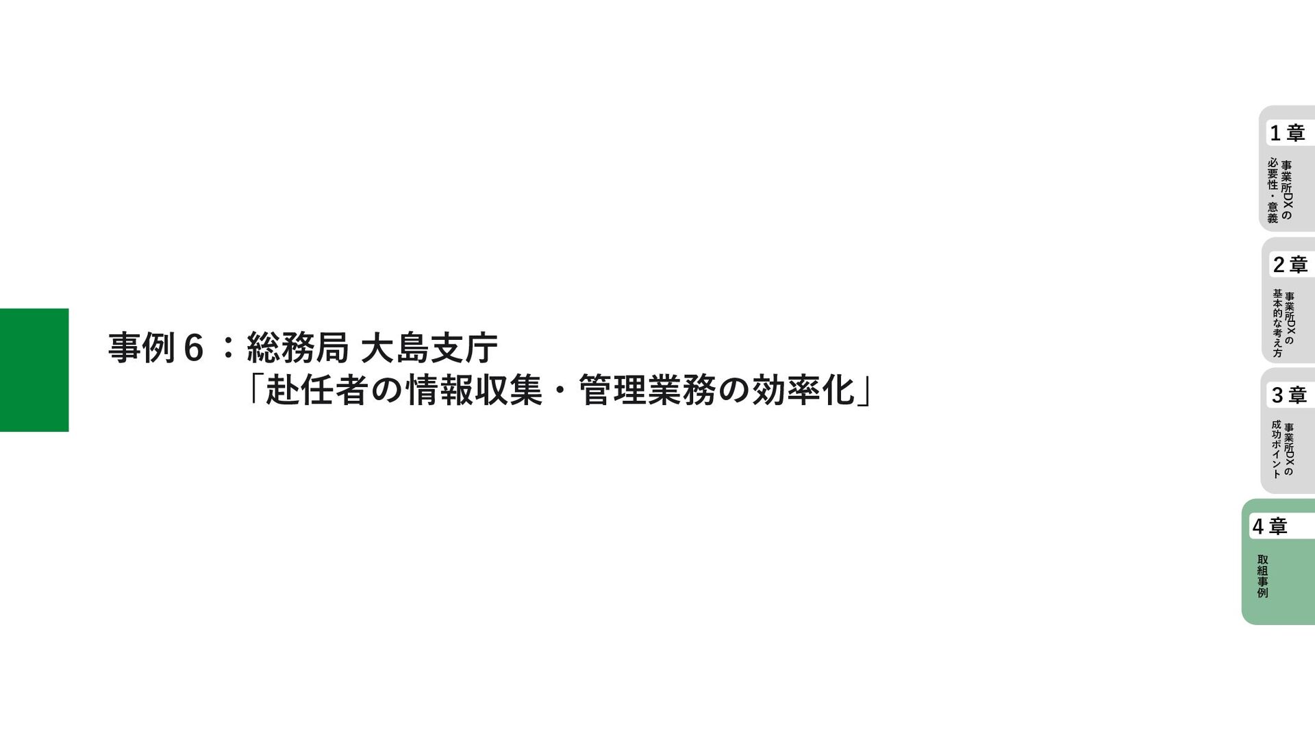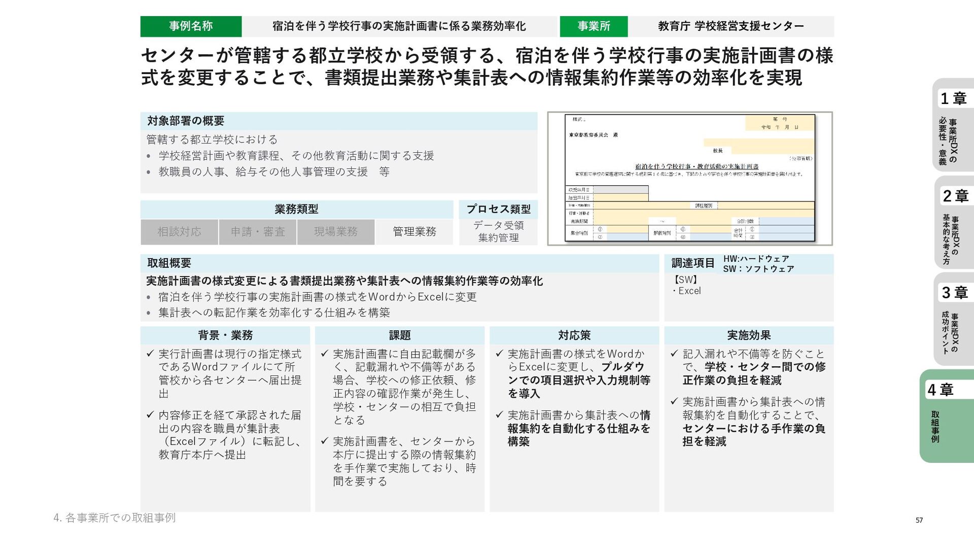 がある これまで紙を出力し所内で回付していた事務連絡とその添付資料について、ペーパレス化を実施 ・簡易決裁整理簿のExcelファイルを作成し、マクロ機能を利用した署名に変更 ・添付書類を共有フォルダに格納し、紙の保管を廃止。資料を共有サーバ上で確認する運用に変更 背景・業務 課題 対応策 実施効果 ✓ 膨大な量の紙書類を都度印 刷・管理するのにコスト・手 間がかかる ✓ 下駄印・承認印の運用による 押印の手間や、場所の制約が ある ✓ Excelマクロの簡易決裁整理 簿を作成し、添付資料と合わ せて所内NW上の共有フォル ダに格納。Excelで起案・承 認を行い、Excelのリンクか ら添付ファイルを確認する運 用に変更 ✓ マクロの処理は、生成AIによ りコード文を作成 ✓ ペーパレス化による、年間約 5,000枚分の紙の印刷・保管 コスト削減 ✓ 起案・承認のリモート化に加 え、データ管理による回覧状 況の把握等の活用に向けた利 便性性の向上 取組概要 プロセス類型 更新・閲覧 対象部署の概要 • SW:表計算ソフト (Excel※既存) • SaaS:生成AI • 他:共有フォルダ 調達項目 水道局南部支所庶務課では、事務連絡等の所内の回付・承認業務において、紙の運 用を廃止し、年間5,000枚の紙資料を削減 相談対応 申請・審査 現場業務 管理業務 業務類型 HW:ハードウェア SW:ソフトウェア 4. 各事業所での取組事例 簡易決裁業務へのExcel・マクロ活用によるペーパレス化 事例名称 水道局 南部支所 庶務課 事業所 取 組 事 例 4章 事 業 所 DX の 成 功 ポ イ ン ト 3章 事 業 所 DX の 必 要 性 ・ 意 義 1章 事 業 所 DX の 基 本 的 な 考 え 方 2章 支所(配水施設維持管理や断減水の応急措置、水道料金徴収等を行う)における • 文書の受発、編集及び保存、公印の管理業務 • 人事・給与・経理、固定資産業務 • 物件の調達、工事請負、物品購買その他の契約業務