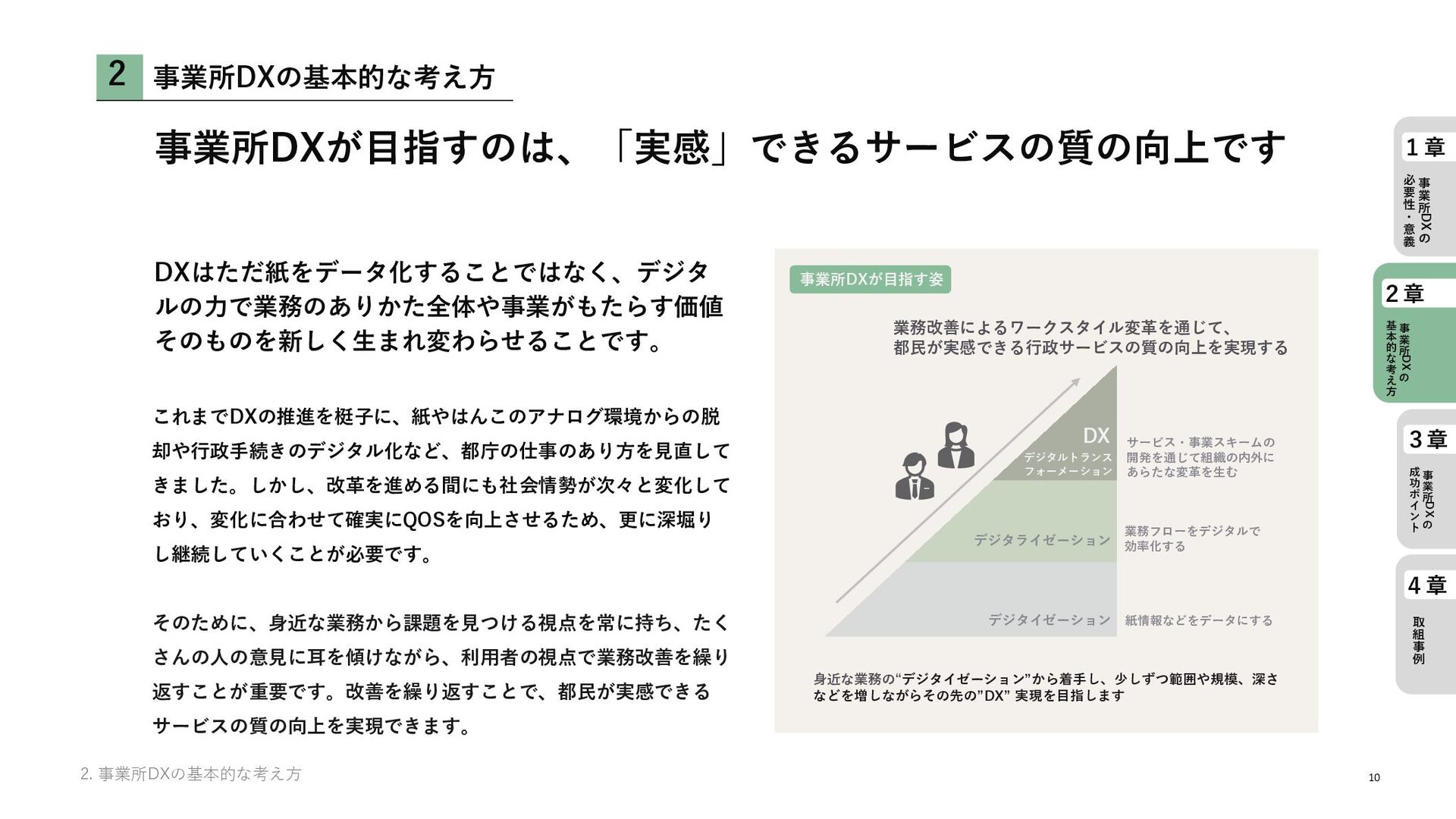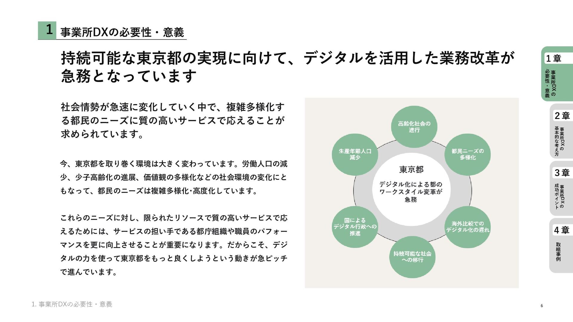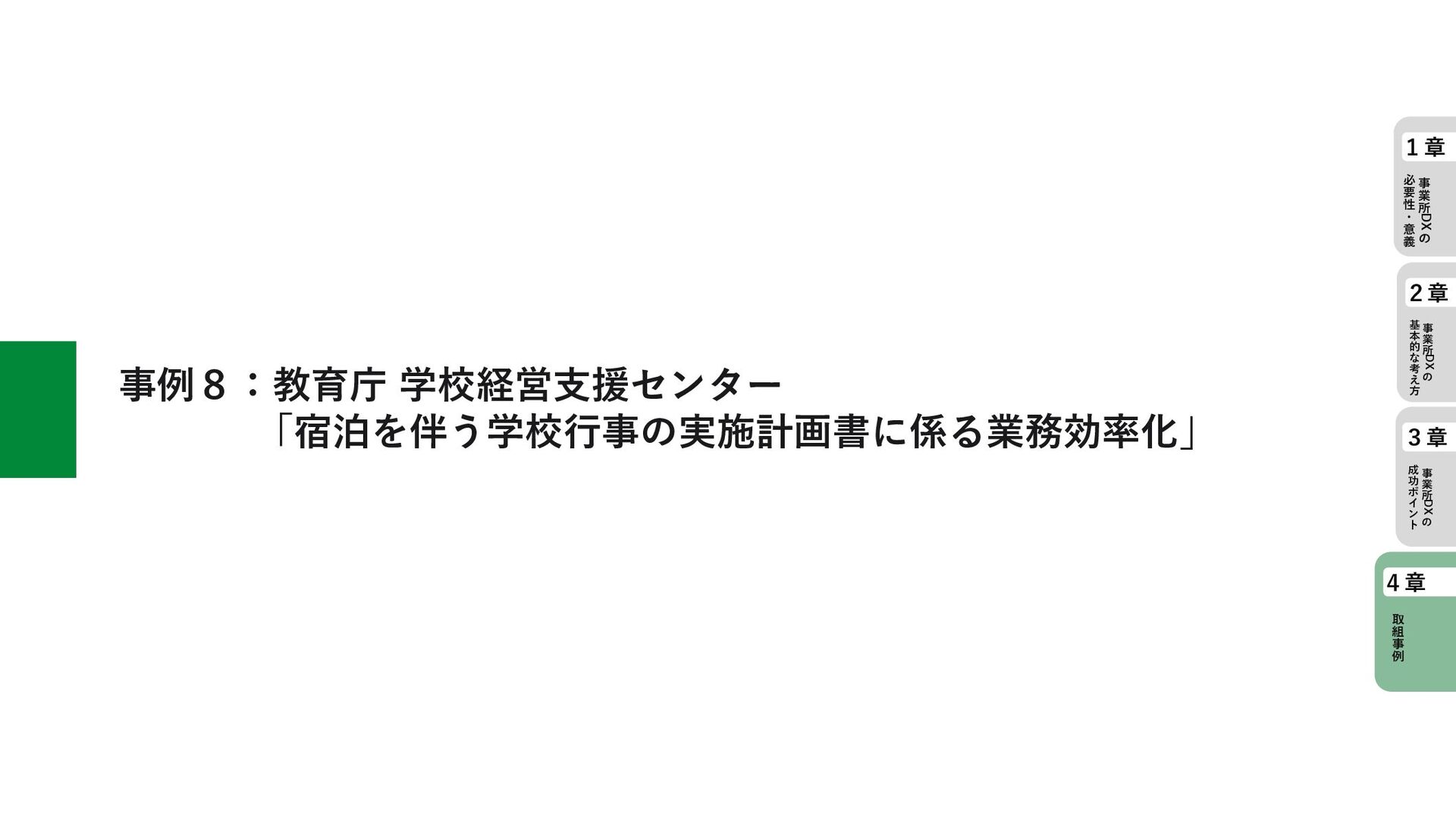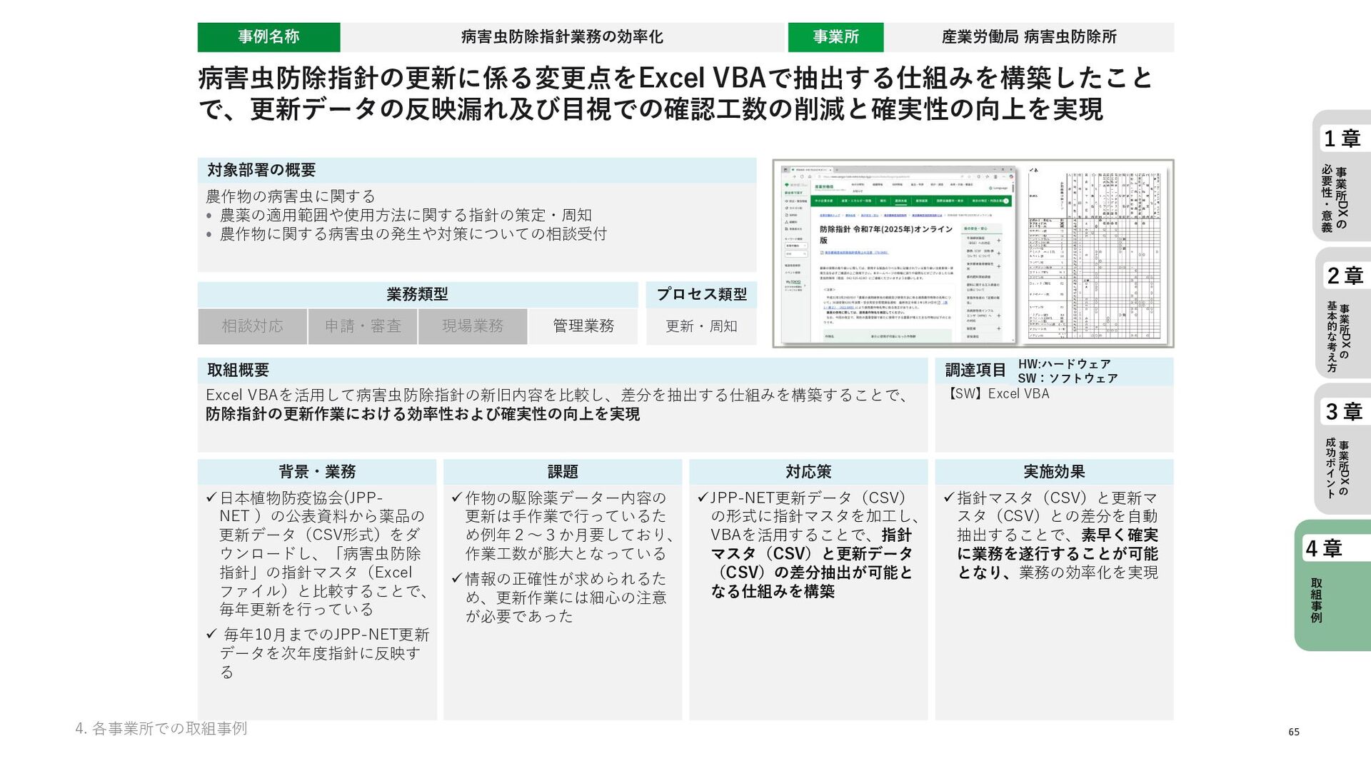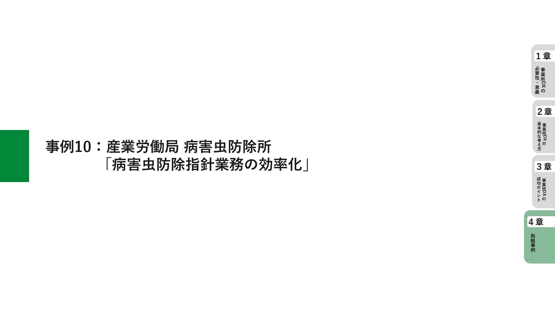 がある これまで紙を出力し所内で回付していた事務連絡とその添付資料について、ペーパレス化を実施 ・簡易決裁整理簿のExcelファイルを作成し、マクロ機能を利用した署名に変更 ・添付書類を共有フォルダに格納し、紙の保管を廃止。資料を共有サーバ上で確認する運用に変更 背景・業務 課題 対応策 実施効果 ✓ 膨大な量の紙書類を都度印 刷・管理するのにコスト・手 間がかかる ✓ 下駄印・承認印の運用による 押印の手間や、場所の制約が ある ✓ Excelマクロの簡易決裁整理 簿を作成し、添付資料と合わ せて所内NW上の共有フォル ダに格納。Excelで起案・承 認を行い、Excelのリンクか ら添付ファイルを確認する運 用に変更 ✓ マクロの処理は、生成AIによ りコード文を作成 ✓ ペーパレス化による、年間約 5,000枚分の紙の印刷・保管 コスト削減 ✓ 起案・承認のリモート化に加 え、データ管理による回覧状 況の把握等の活用に向けた利 便性性の向上 取組概要 プロセス類型 更新・閲覧 対象部署の概要 • SW:表計算ソフト (Excel※既存) • SaaS:生成AI • 他:共有フォルダ 調達項目 水道局南部支所庶務課では、事務連絡等の所内の回付・承認業務において、紙の運 用を廃止し、年間5,000枚の紙資料を削減 相談対応 申請・審査 現場業務 管理業務 業務類型 HW:ハードウェア SW:ソフトウェア 4. 各事業所での取組事例 簡易決裁業務へのExcel・マクロ活用によるペーパレス化 事例名称 水道局 南部支所 庶務課 事業所 取 組 事 例 4章 事 業 所 DX の 成 功 ポ イ ン ト 3章 事 業 所 DX の 必 要 性 ・ 意 義 1章 事 業 所 DX の 基 本 的 な 考 え 方 2章 支所(配水施設維持管理や断減水の応急措置、水道料金徴収等を行う)における • 文書の受発、編集及び保存、公印の管理業務 • 人事・給与・経理、固定資産業務 • 物件の調達、工事請負、物品購買その他の契約業務