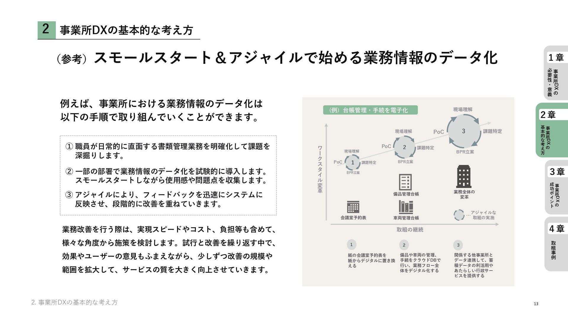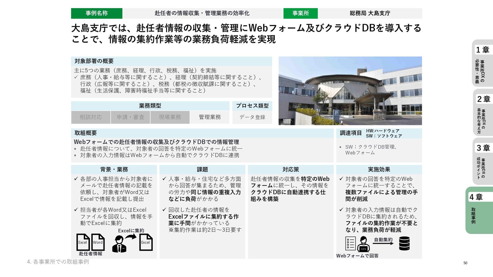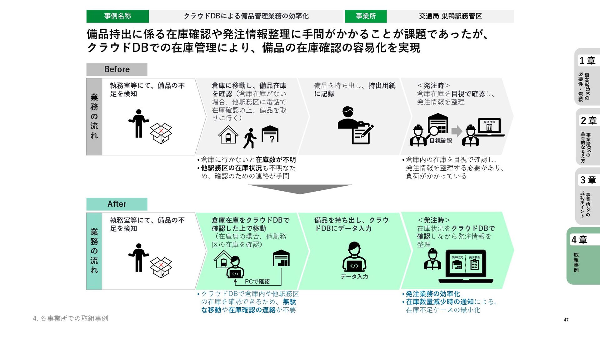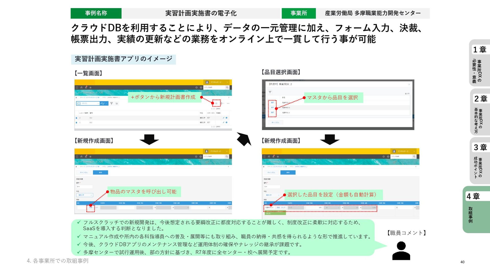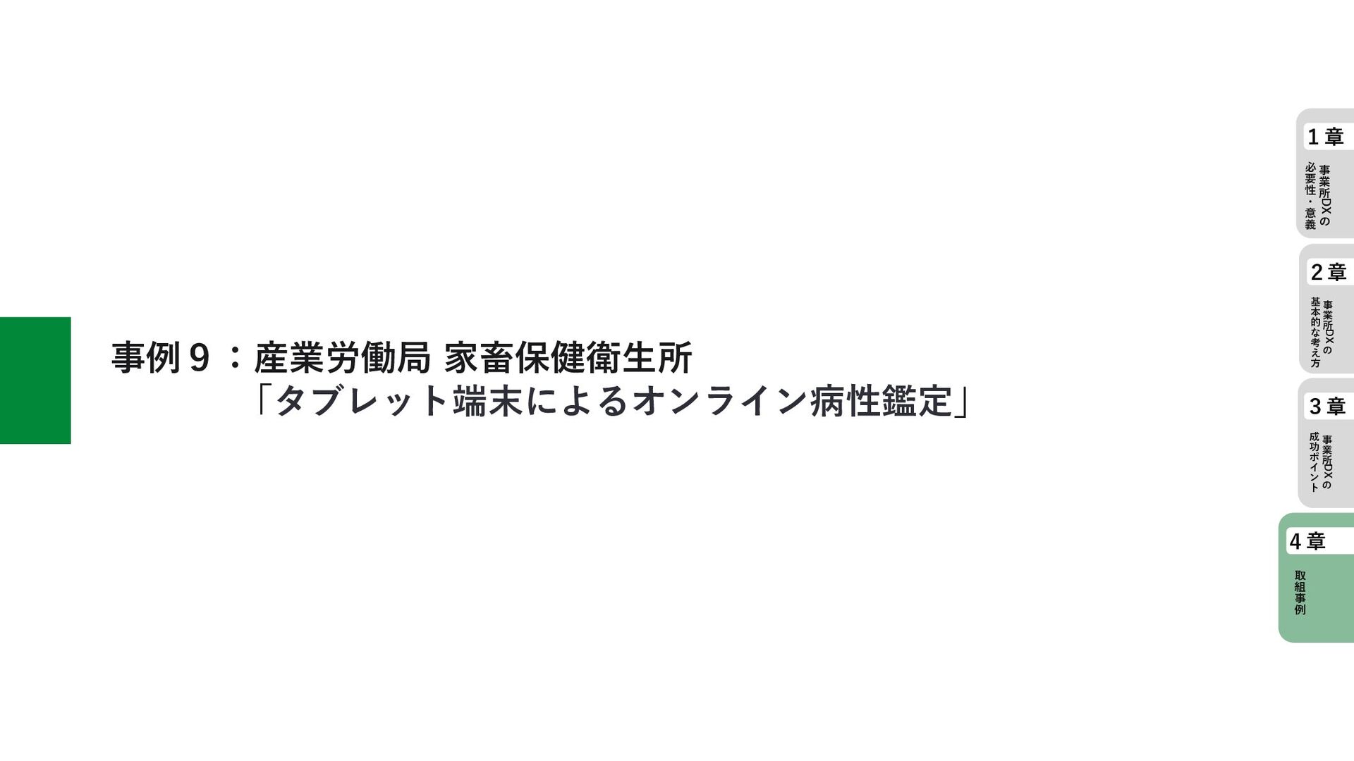 がある これまで紙を出力し所内で回付していた事務連絡とその添付資料について、ペーパレス化を実施 ・簡易決裁整理簿のExcelファイルを作成し、マクロ機能を利用した署名に変更 ・添付書類を共有フォルダに格納し、紙の保管を廃止。資料を共有サーバ上で確認する運用に変更 背景・業務 課題 対応策 実施効果 ✓ 膨大な量の紙書類を都度印 刷・管理するのにコスト・手 間がかかる ✓ 下駄印・承認印の運用による 押印の手間や、場所の制約が ある ✓ Excelマクロの簡易決裁整理 簿を作成し、添付資料と合わ せて所内NW上の共有フォル ダに格納。Excelで起案・承 認を行い、Excelのリンクか ら添付ファイルを確認する運 用に変更 ✓ マクロの処理は、生成AIによ りコード文を作成 ✓ ペーパレス化による、年間約 5,000枚分の紙の印刷・保管 コスト削減 ✓ 起案・承認のリモート化に加 え、データ管理による回覧状 況の把握等の活用に向けた利 便性性の向上 取組概要 プロセス類型 更新・閲覧 対象部署の概要 • SW:表計算ソフト (Excel※既存) • SaaS:生成AI • 他:共有フォルダ 調達項目 水道局南部支所庶務課では、事務連絡等の所内の回付・承認業務において、紙の運 用を廃止し、年間5,000枚の紙資料を削減 相談対応 申請・審査 現場業務 管理業務 業務類型 HW:ハードウェア SW:ソフトウェア 4. 各事業所での取組事例 簡易決裁業務へのExcel・マクロ活用によるペーパレス化 事例名称 水道局 南部支所 庶務課 事業所 取 組 事 例 4章 事 業 所 DX の 成 功 ポ イ ン ト 3章 事 業 所 DX の 必 要 性 ・ 意 義 1章 事 業 所 DX の 基 本 的 な 考 え 方 2章 支所(配水施設維持管理や断減水の応急措置、水道料金徴収等を行う)における • 文書の受発、編集及び保存、公印の管理業務 • 人事・給与・経理、固定資産業務 • 物件の調達、工事請負、物品購買その他の契約業務