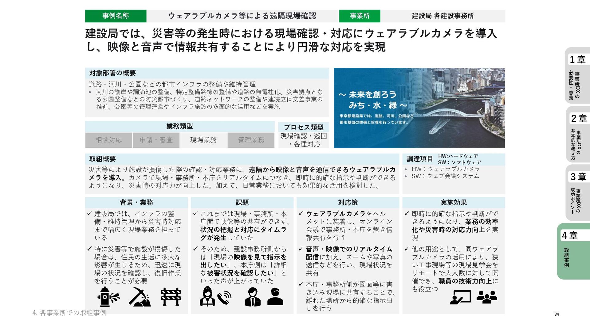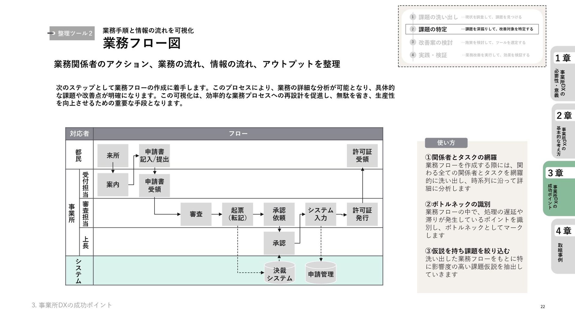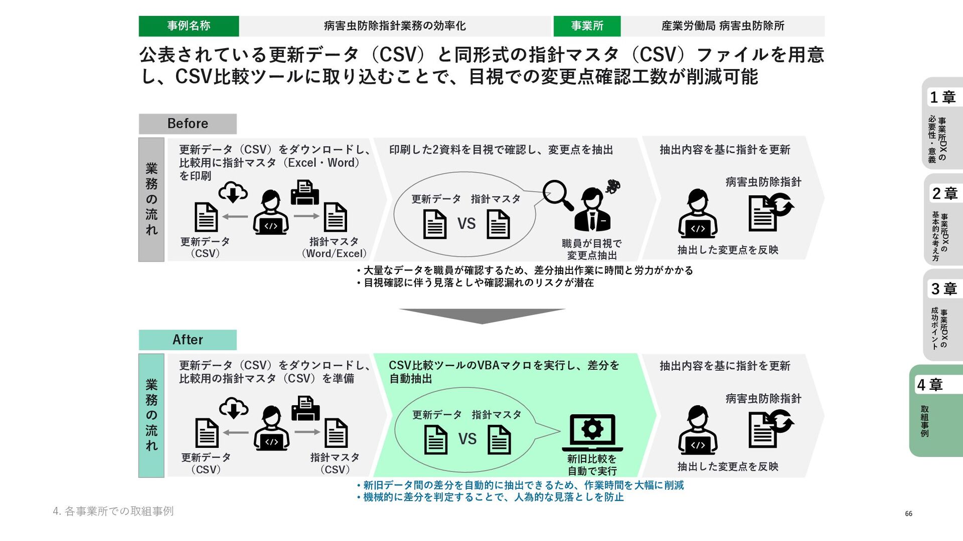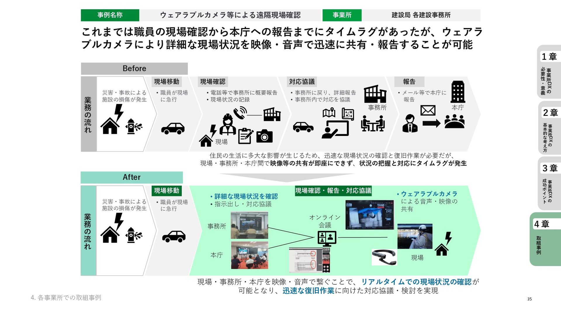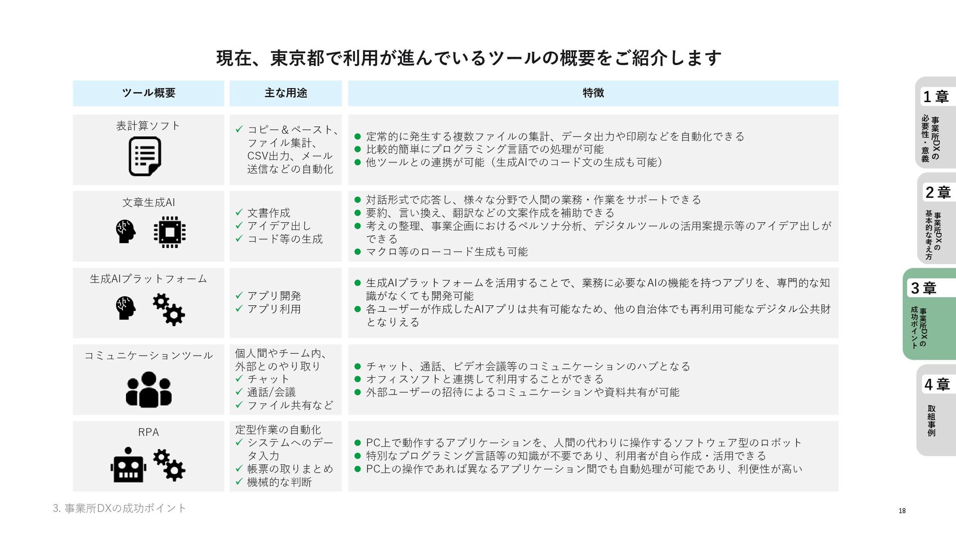 がある これまで紙を出力し所内で回付していた事務連絡とその添付資料について、ペーパレス化を実施 ・簡易決裁整理簿のExcelファイルを作成し、マクロ機能を利用した署名に変更 ・添付書類を共有フォルダに格納し、紙の保管を廃止。資料を共有サーバ上で確認する運用に変更 背景・業務 課題 対応策 実施効果 ✓ 膨大な量の紙書類を都度印 刷・管理するのにコスト・手 間がかかる ✓ 下駄印・承認印の運用による 押印の手間や、場所の制約が ある ✓ Excelマクロの簡易決裁整理 簿を作成し、添付資料と合わ せて所内NW上の共有フォル ダに格納。Excelで起案・承 認を行い、Excelのリンクか ら添付ファイルを確認する運 用に変更 ✓ マクロの処理は、生成AIによ りコード文を作成 ✓ ペーパレス化による、年間約 5,000枚分の紙の印刷・保管 コスト削減 ✓ 起案・承認のリモート化に加 え、データ管理による回覧状 況の把握等の活用に向けた利 便性性の向上 取組概要 プロセス類型 更新・閲覧 対象部署の概要 • SW:表計算ソフト (Excel※既存) • SaaS:生成AI • 他:共有フォルダ 調達項目 水道局南部支所庶務課では、事務連絡等の所内の回付・承認業務において、紙の運 用を廃止し、年間5,000枚の紙資料を削減 相談対応 申請・審査 現場業務 管理業務 業務類型 HW:ハードウェア SW:ソフトウェア 4. 各事業所での取組事例 簡易決裁業務へのExcel・マクロ活用によるペーパレス化 事例名称 水道局 南部支所 庶務課 事業所 取 組 事 例 4章 事 業 所 DX の 成 功 ポ イ ン ト 3章 事 業 所 DX の 必 要 性 ・ 意 義 1章 事 業 所 DX の 基 本 的 な 考 え 方 2章 支所(配水施設維持管理や断減水の応急措置、水道料金徴収等を行う)における • 文書の受発、編集及び保存、公印の管理業務 • 人事・給与・経理、固定資産業務 • 物件の調達、工事請負、物品購買その他の契約業務