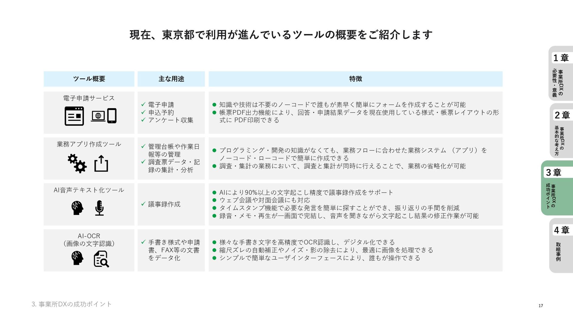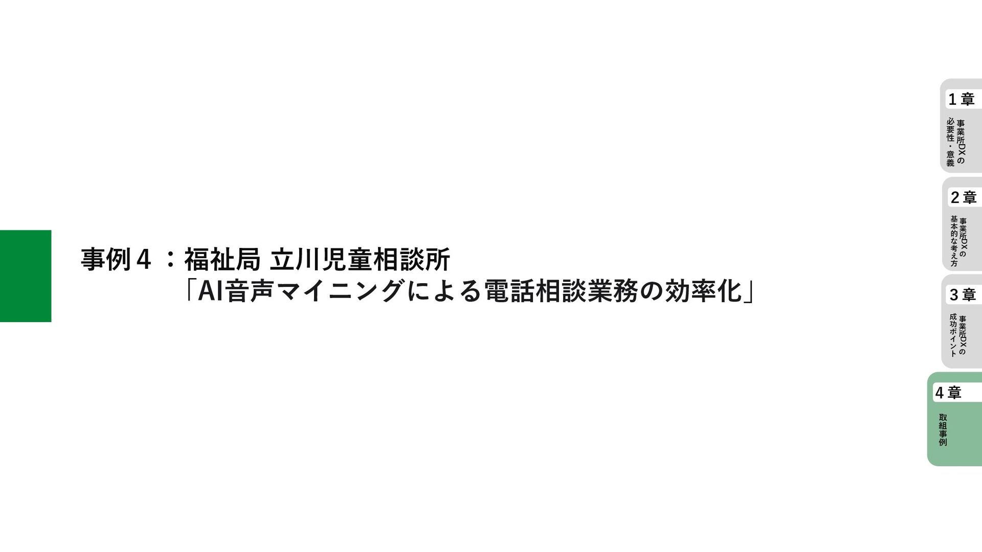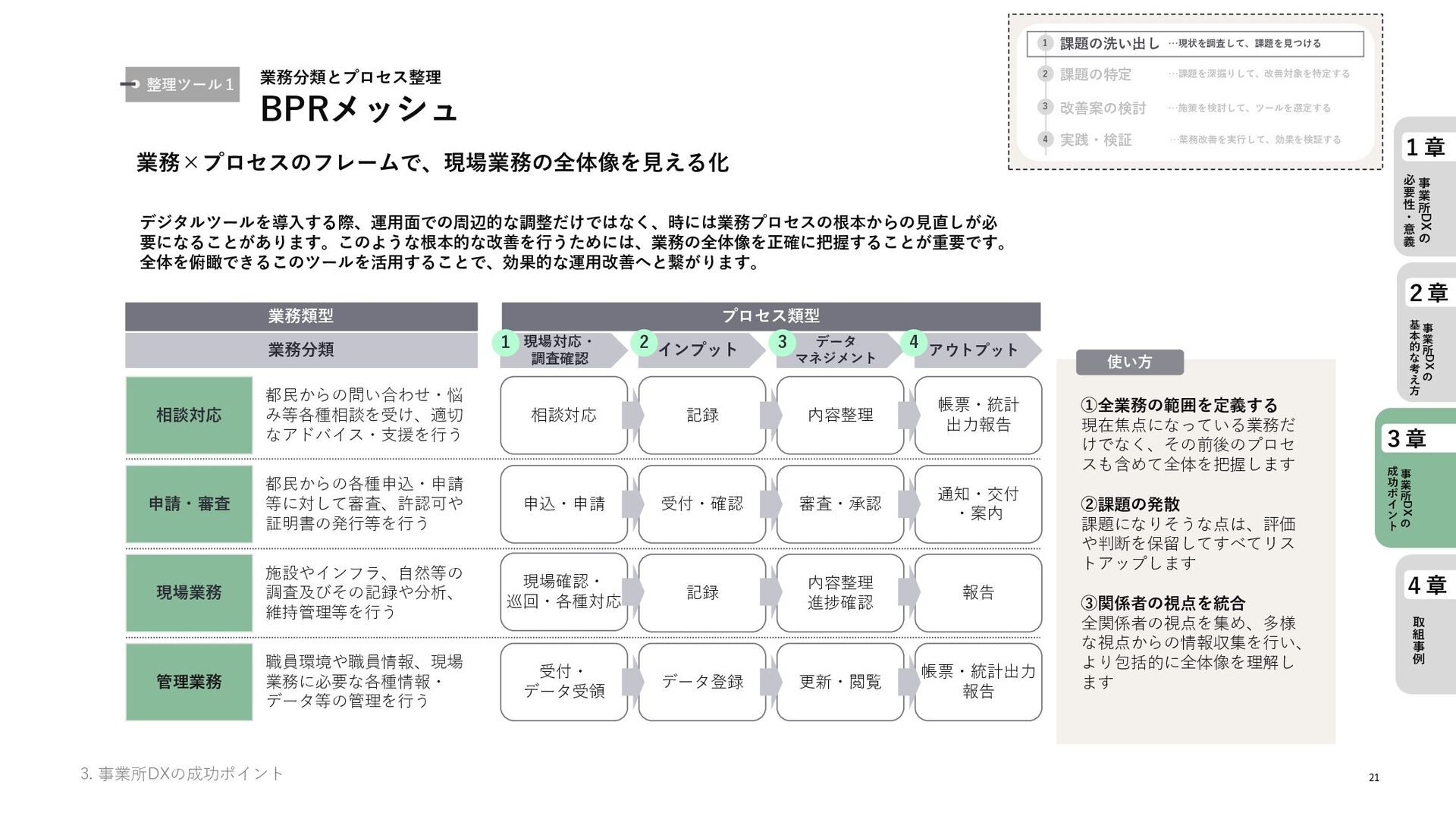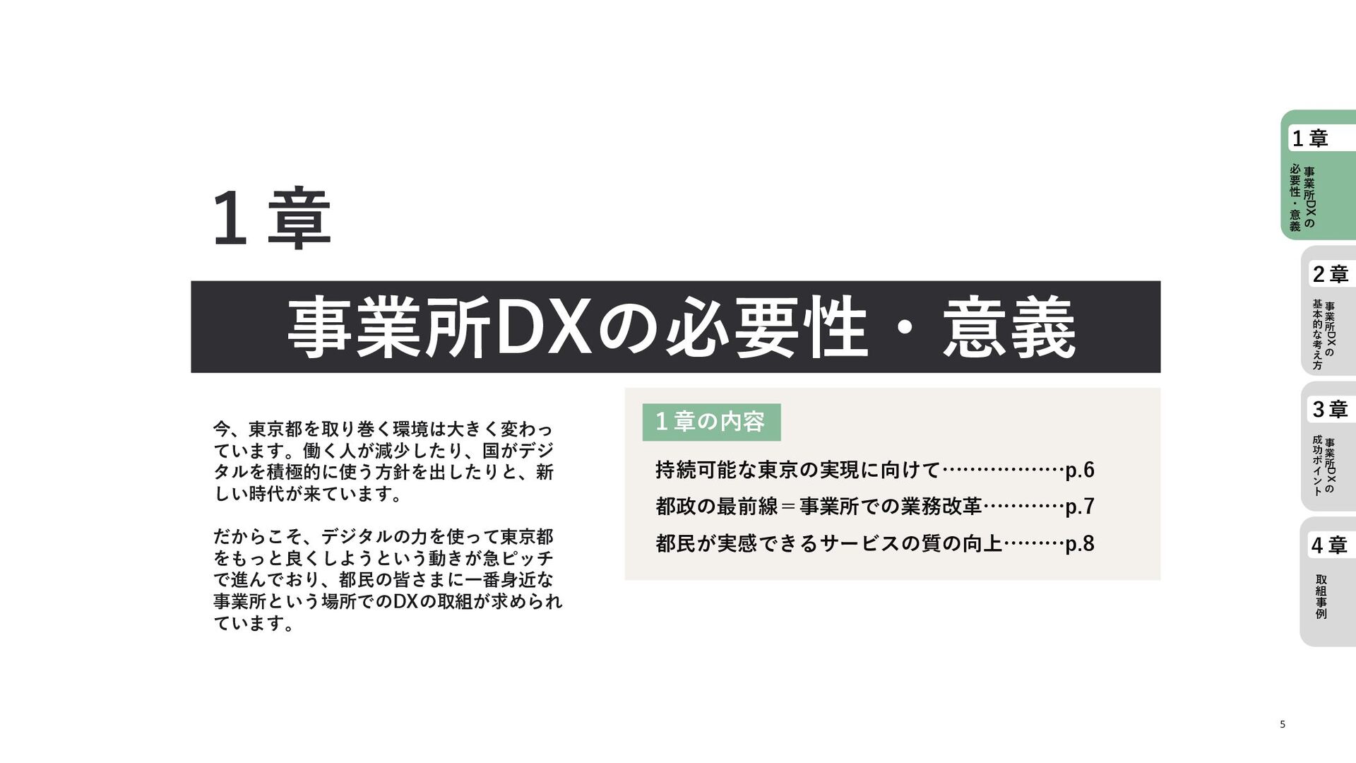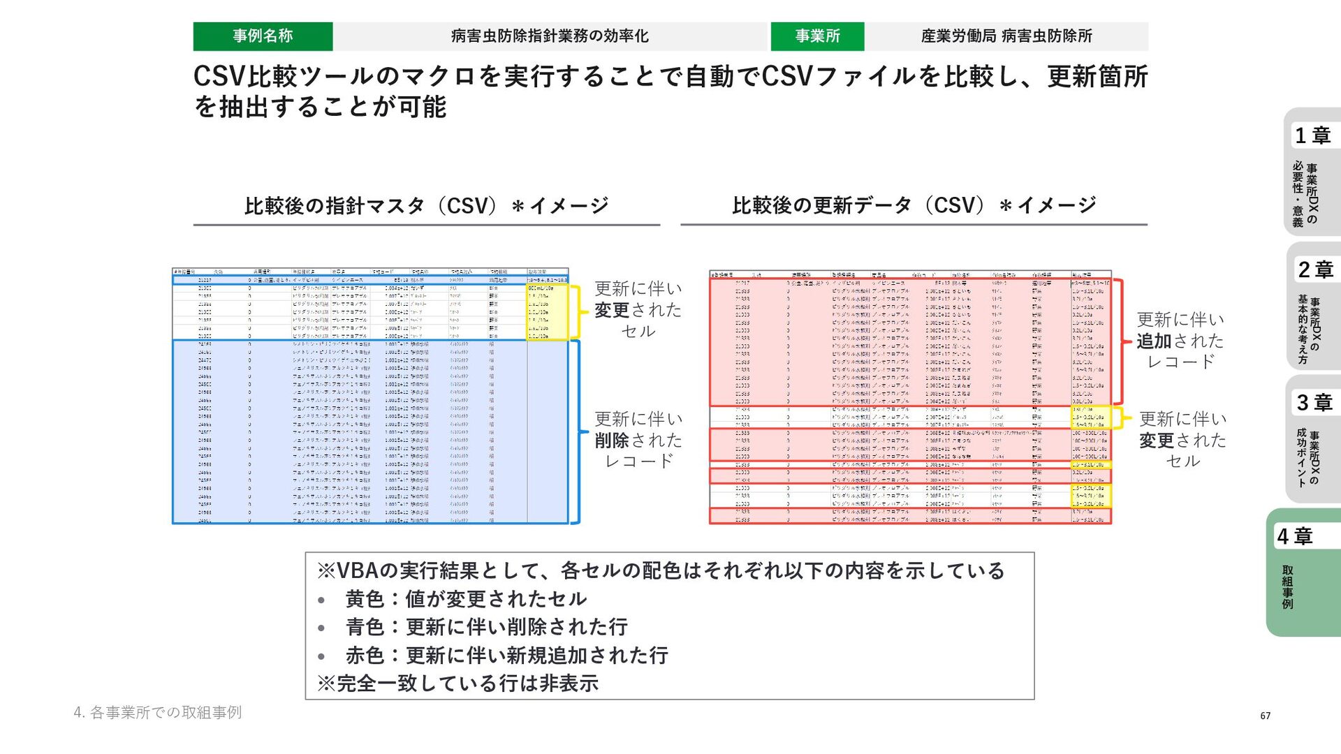 がある これまで紙を出力し所内で回付していた事務連絡とその添付資料について、ペーパレス化を実施 ・簡易決裁整理簿のExcelファイルを作成し、マクロ機能を利用した署名に変更 ・添付書類を共有フォルダに格納し、紙の保管を廃止。資料を共有サーバ上で確認する運用に変更 背景・業務 課題 対応策 実施効果 ✓ 膨大な量の紙書類を都度印 刷・管理するのにコスト・手 間がかかる ✓ 下駄印・承認印の運用による 押印の手間や、場所の制約が ある ✓ Excelマクロの簡易決裁整理 簿を作成し、添付資料と合わ せて所内NW上の共有フォル ダに格納。Excelで起案・承 認を行い、Excelのリンクか ら添付ファイルを確認する運 用に変更 ✓ マクロの処理は、生成AIによ りコード文を作成 ✓ ペーパレス化による、年間約 5,000枚分の紙の印刷・保管 コスト削減 ✓ 起案・承認のリモート化に加 え、データ管理による回覧状 況の把握等の活用に向けた利 便性性の向上 取組概要 プロセス類型 更新・閲覧 対象部署の概要 • SW:表計算ソフト (Excel※既存) • SaaS:生成AI • 他:共有フォルダ 調達項目 水道局南部支所庶務課では、事務連絡等の所内の回付・承認業務において、紙の運 用を廃止し、年間5,000枚の紙資料を削減 相談対応 申請・審査 現場業務 管理業務 業務類型 HW:ハードウェア SW:ソフトウェア 4. 各事業所での取組事例 簡易決裁業務へのExcel・マクロ活用によるペーパレス化 事例名称 水道局 南部支所 庶務課 事業所 取 組 事 例 4章 事 業 所 DX の 成 功 ポ イ ン ト 3章 事 業 所 DX の 必 要 性 ・ 意 義 1章 事 業 所 DX の 基 本 的 な 考 え 方 2章 支所(配水施設維持管理や断減水の応急措置、水道料金徴収等を行う)における • 文書の受発、編集及び保存、公印の管理業務 • 人事・給与・経理、固定資産業務 • 物件の調達、工事請負、物品購買その他の契約業務