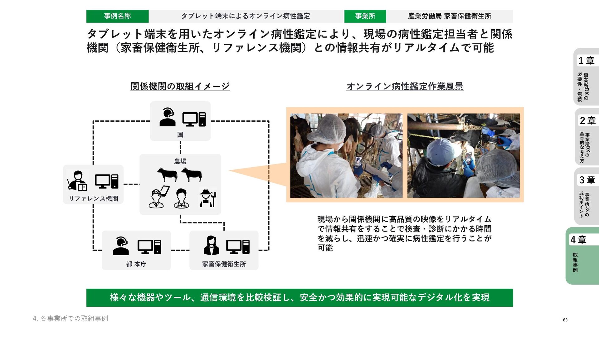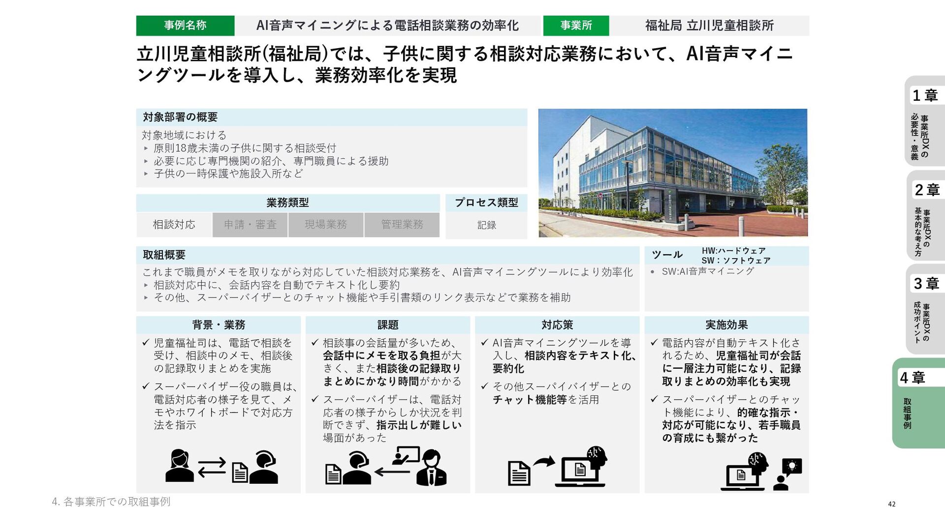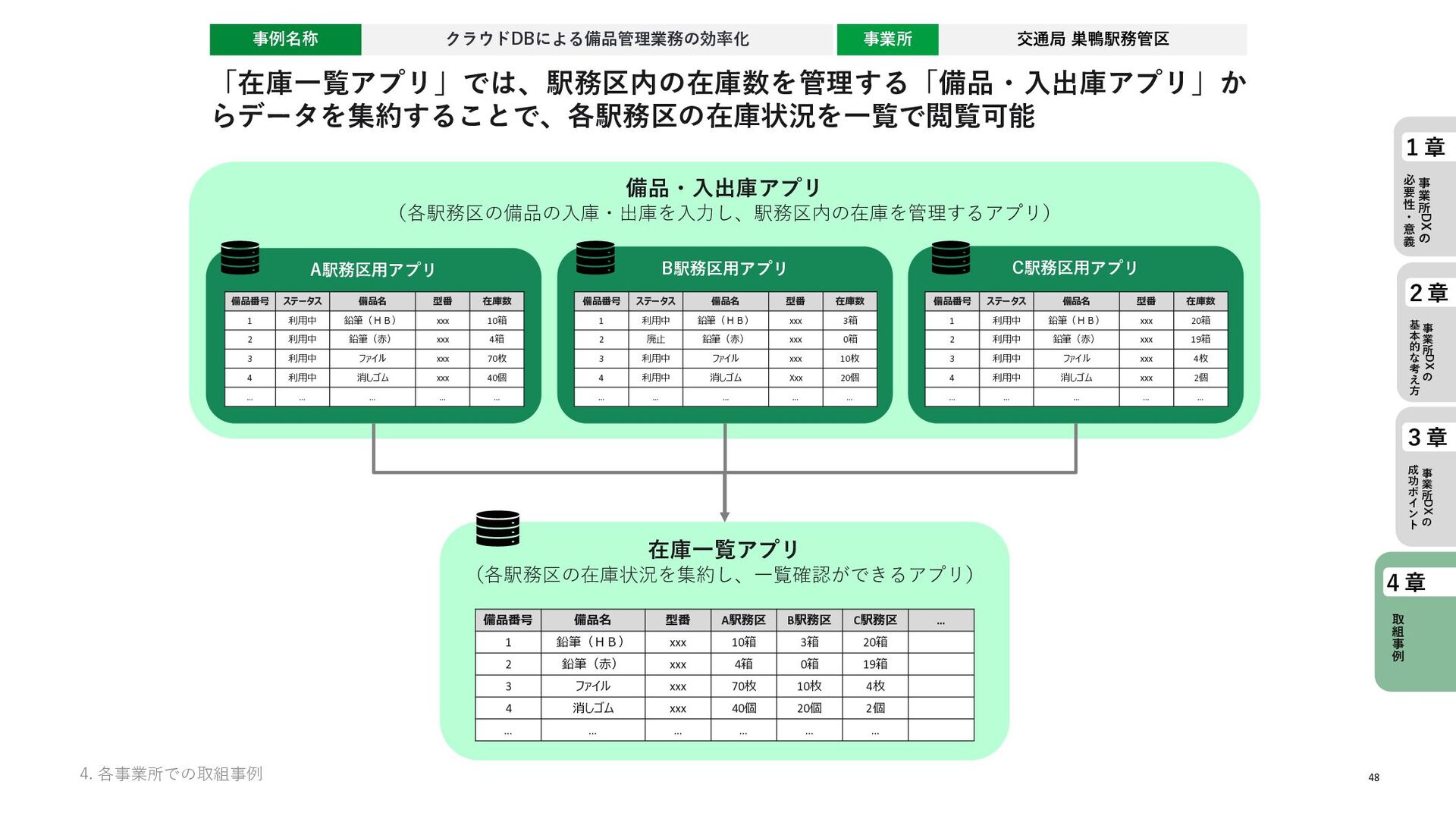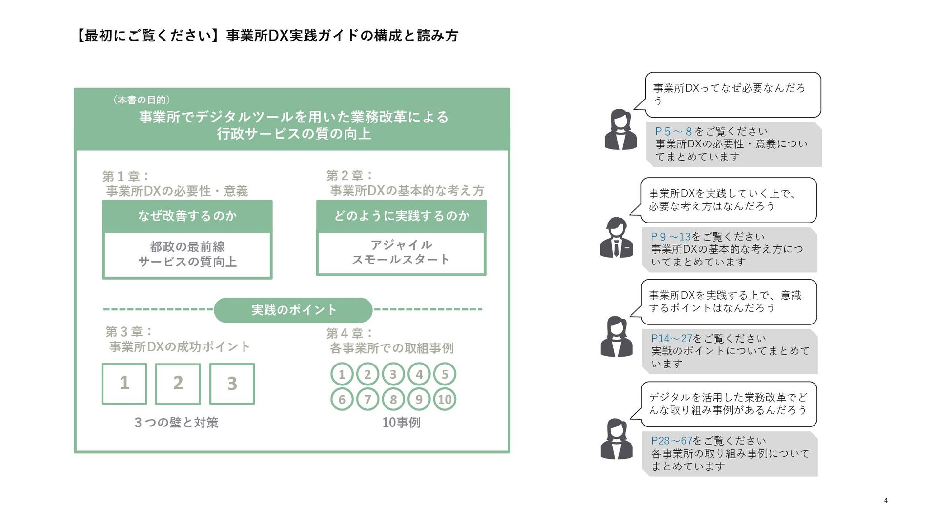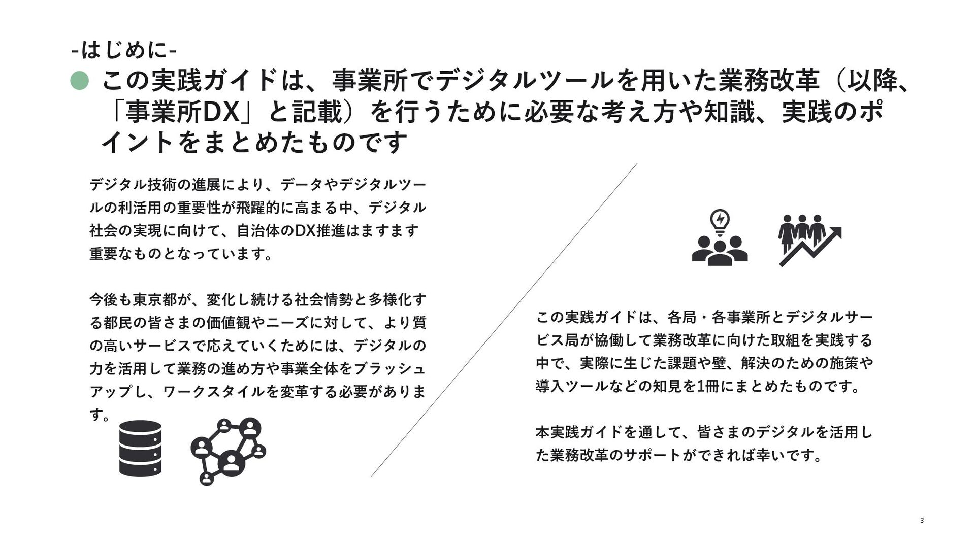 がある これまで紙を出力し所内で回付していた事務連絡とその添付資料について、ペーパレス化を実施 ・簡易決裁整理簿のExcelファイルを作成し、マクロ機能を利用した署名に変更 ・添付書類を共有フォルダに格納し、紙の保管を廃止。資料を共有サーバ上で確認する運用に変更 背景・業務 課題 対応策 実施効果 ✓ 膨大な量の紙書類を都度印 刷・管理するのにコスト・手 間がかかる ✓ 下駄印・承認印の運用による 押印の手間や、場所の制約が ある ✓ Excelマクロの簡易決裁整理 簿を作成し、添付資料と合わ せて所内NW上の共有フォル ダに格納。Excelで起案・承 認を行い、Excelのリンクか ら添付ファイルを確認する運 用に変更 ✓ マクロの処理は、生成AIによ りコード文を作成 ✓ ペーパレス化による、年間約 5,000枚分の紙の印刷・保管 コスト削減 ✓ 起案・承認のリモート化に加 え、データ管理による回覧状 況の把握等の活用に向けた利 便性性の向上 取組概要 プロセス類型 更新・閲覧 対象部署の概要 • SW:表計算ソフト (Excel※既存) • SaaS:生成AI • 他:共有フォルダ 調達項目 水道局南部支所庶務課では、事務連絡等の所内の回付・承認業務において、紙の運 用を廃止し、年間5,000枚の紙資料を削減 相談対応 申請・審査 現場業務 管理業務 業務類型 HW:ハードウェア SW:ソフトウェア 4. 各事業所での取組事例 簡易決裁業務へのExcel・マクロ活用によるペーパレス化 事例名称 水道局 南部支所 庶務課 事業所 取 組 事 例 4章 事 業 所 DX の 成 功 ポ イ ン ト 3章 事 業 所 DX の 必 要 性 ・ 意 義 1章 事 業 所 DX の 基 本 的 な 考 え 方 2章 支所(配水施設維持管理や断減水の応急措置、水道料金徴収等を行う)における • 文書の受発、編集及び保存、公印の管理業務 • 人事・給与・経理、固定資産業務 • 物件の調達、工事請負、物品購買その他の契約業務