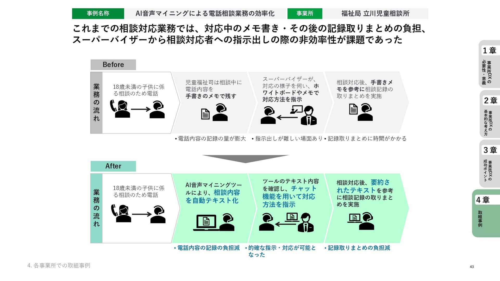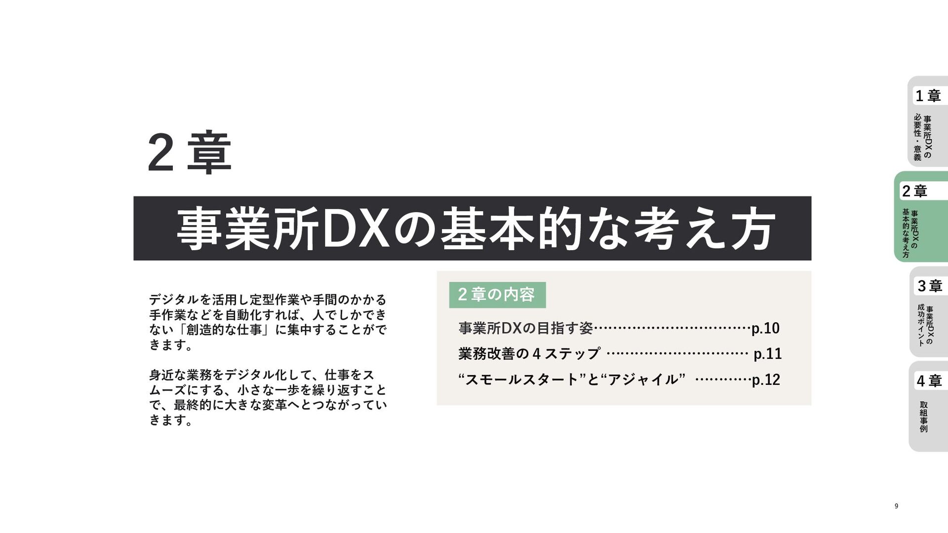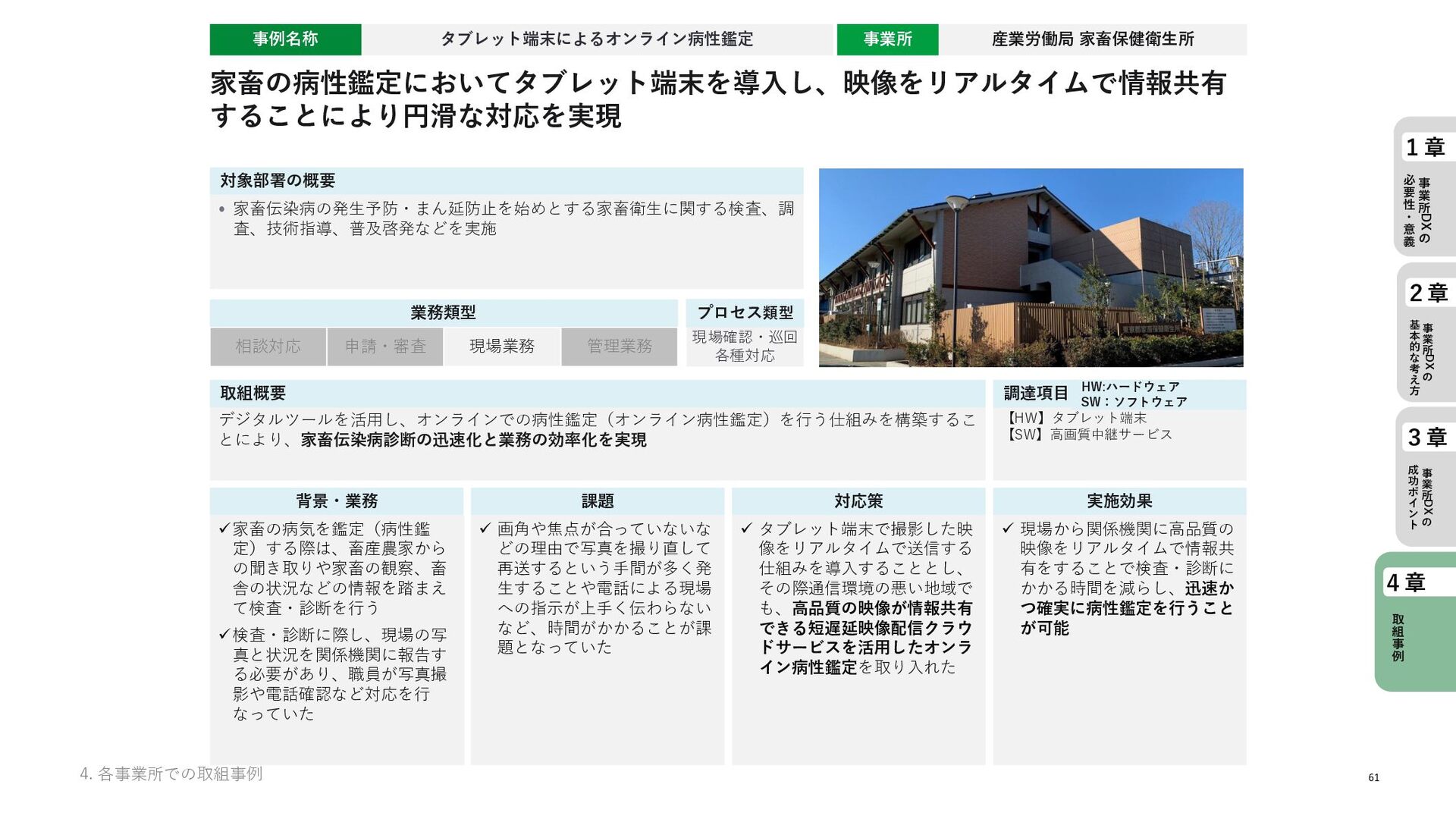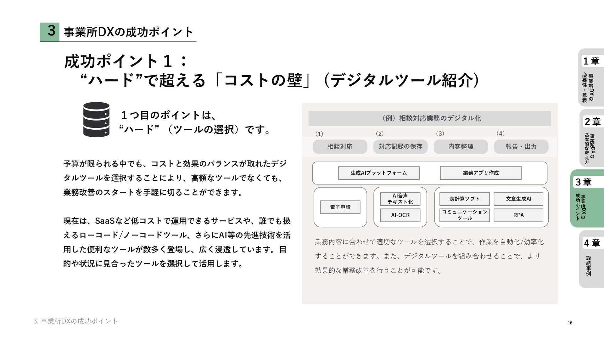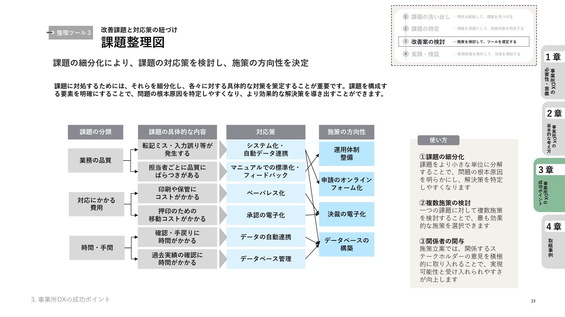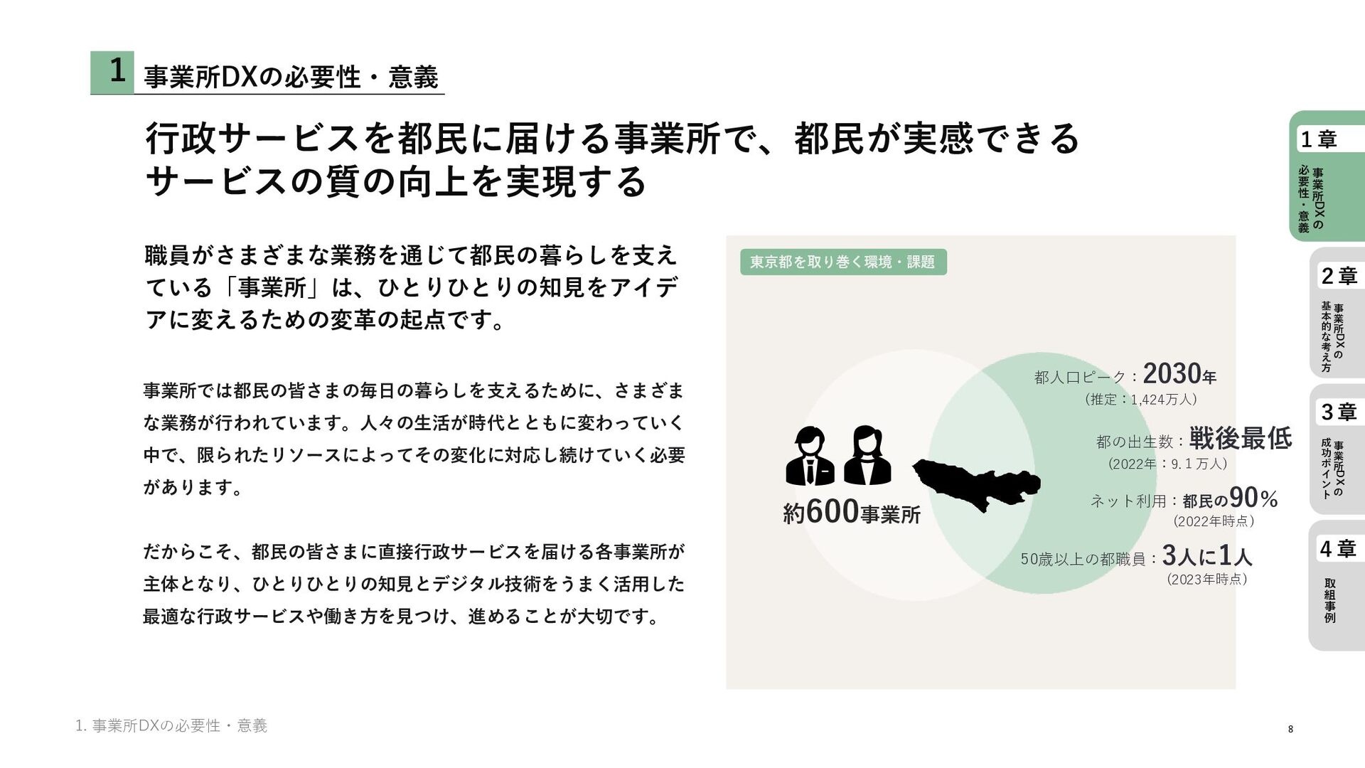 がある これまで紙を出力し所内で回付していた事務連絡とその添付資料について、ペーパレス化を実施 ・簡易決裁整理簿のExcelファイルを作成し、マクロ機能を利用した署名に変更 ・添付書類を共有フォルダに格納し、紙の保管を廃止。資料を共有サーバ上で確認する運用に変更 背景・業務 課題 対応策 実施効果 ✓ 膨大な量の紙書類を都度印 刷・管理するのにコスト・手 間がかかる ✓ 下駄印・承認印の運用による 押印の手間や、場所の制約が ある ✓ Excelマクロの簡易決裁整理 簿を作成し、添付資料と合わ せて所内NW上の共有フォル ダに格納。Excelで起案・承 認を行い、Excelのリンクか ら添付ファイルを確認する運 用に変更 ✓ マクロの処理は、生成AIによ りコード文を作成 ✓ ペーパレス化による、年間約 5,000枚分の紙の印刷・保管 コスト削減 ✓ 起案・承認のリモート化に加 え、データ管理による回覧状 況の把握等の活用に向けた利 便性性の向上 取組概要 プロセス類型 更新・閲覧 対象部署の概要 • SW:表計算ソフト (Excel※既存) • SaaS:生成AI • 他:共有フォルダ 調達項目 水道局南部支所庶務課では、事務連絡等の所内の回付・承認業務において、紙の運 用を廃止し、年間5,000枚の紙資料を削減 相談対応 申請・審査 現場業務 管理業務 業務類型 HW:ハードウェア SW:ソフトウェア 4. 各事業所での取組事例 簡易決裁業務へのExcel・マクロ活用によるペーパレス化 事例名称 水道局 南部支所 庶務課 事業所 取 組 事 例 4章 事 業 所 DX の 成 功 ポ イ ン ト 3章 事 業 所 DX の 必 要 性 ・ 意 義 1章 事 業 所 DX の 基 本 的 な 考 え 方 2章 支所(配水施設維持管理や断減水の応急措置、水道料金徴収等を行う)における • 文書の受発、編集及び保存、公印の管理業務 • 人事・給与・経理、固定資産業務 • 物件の調達、工事請負、物品購買その他の契約業務