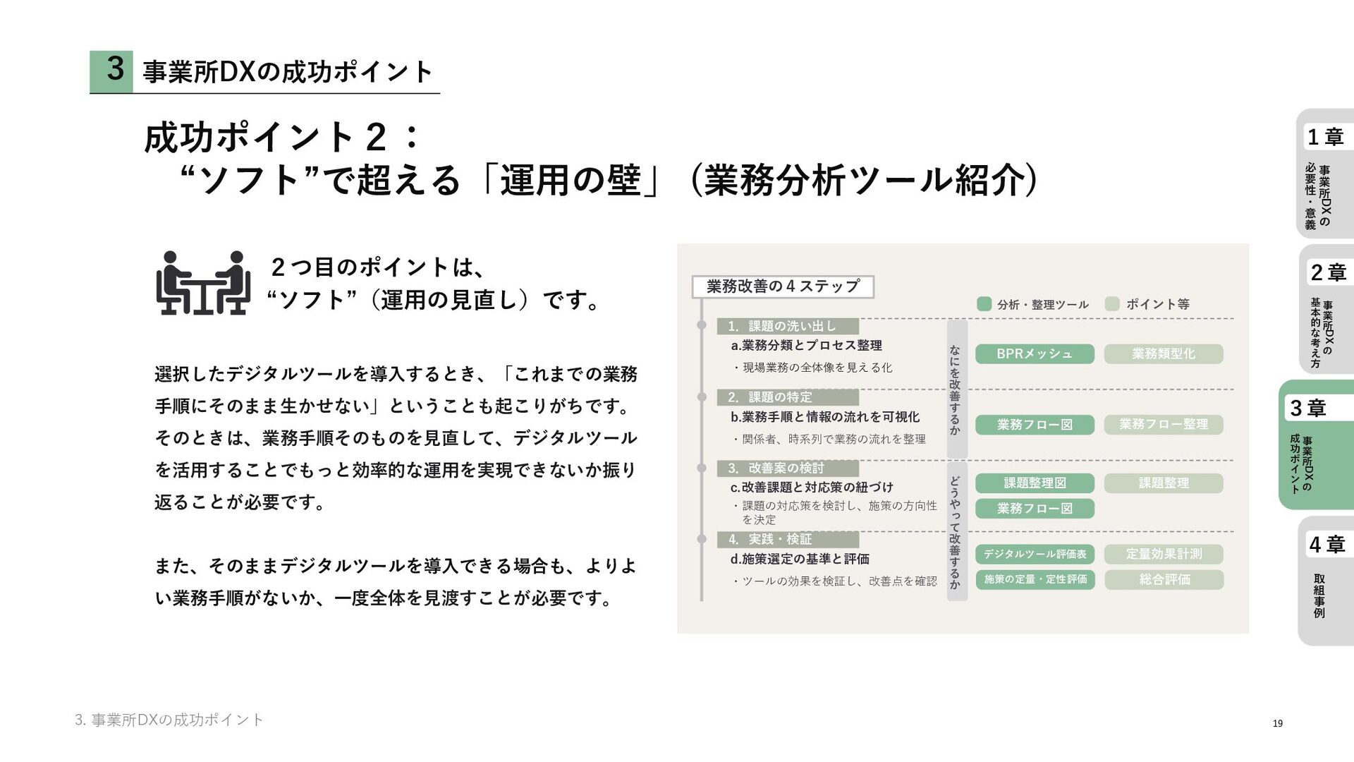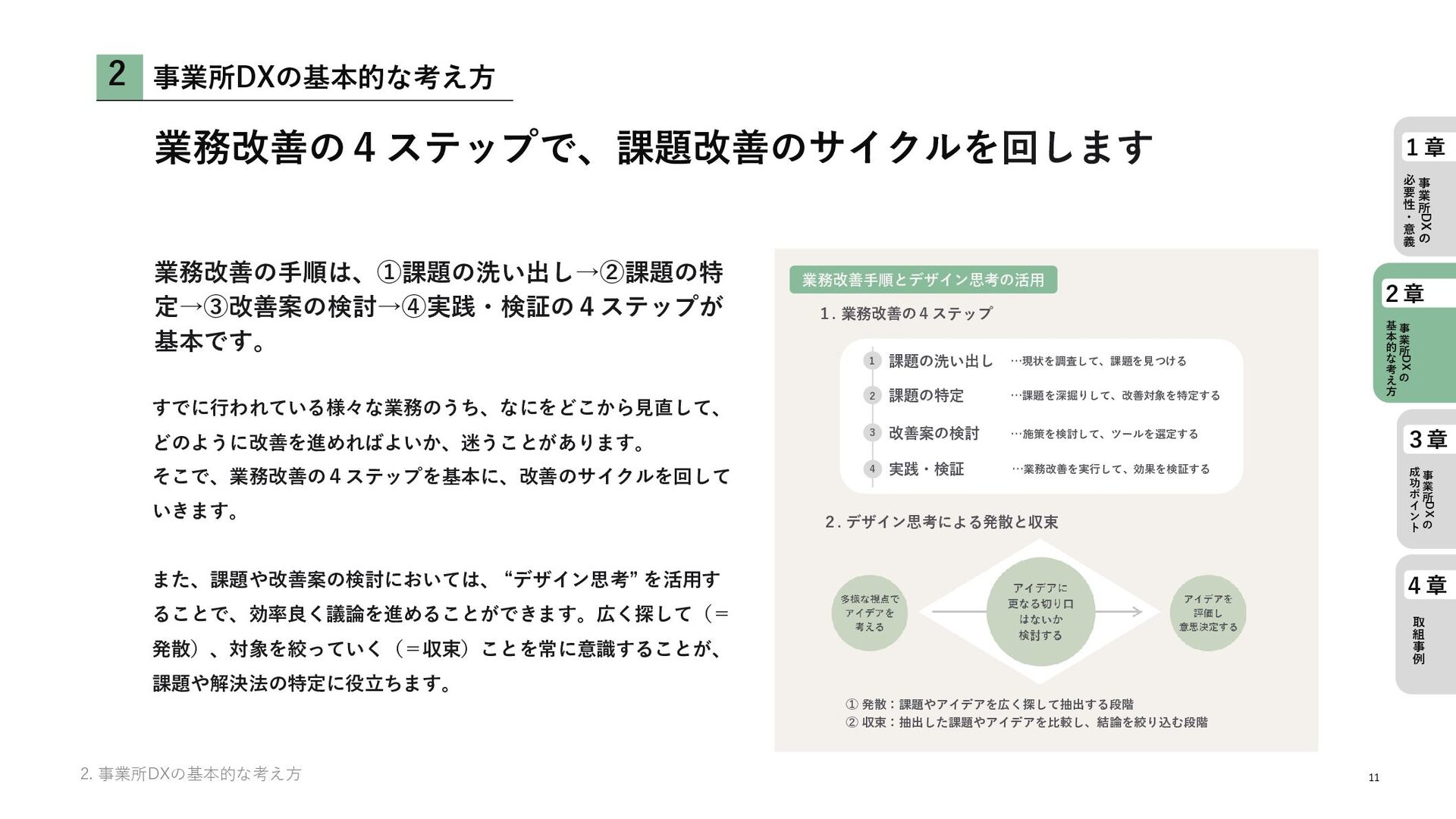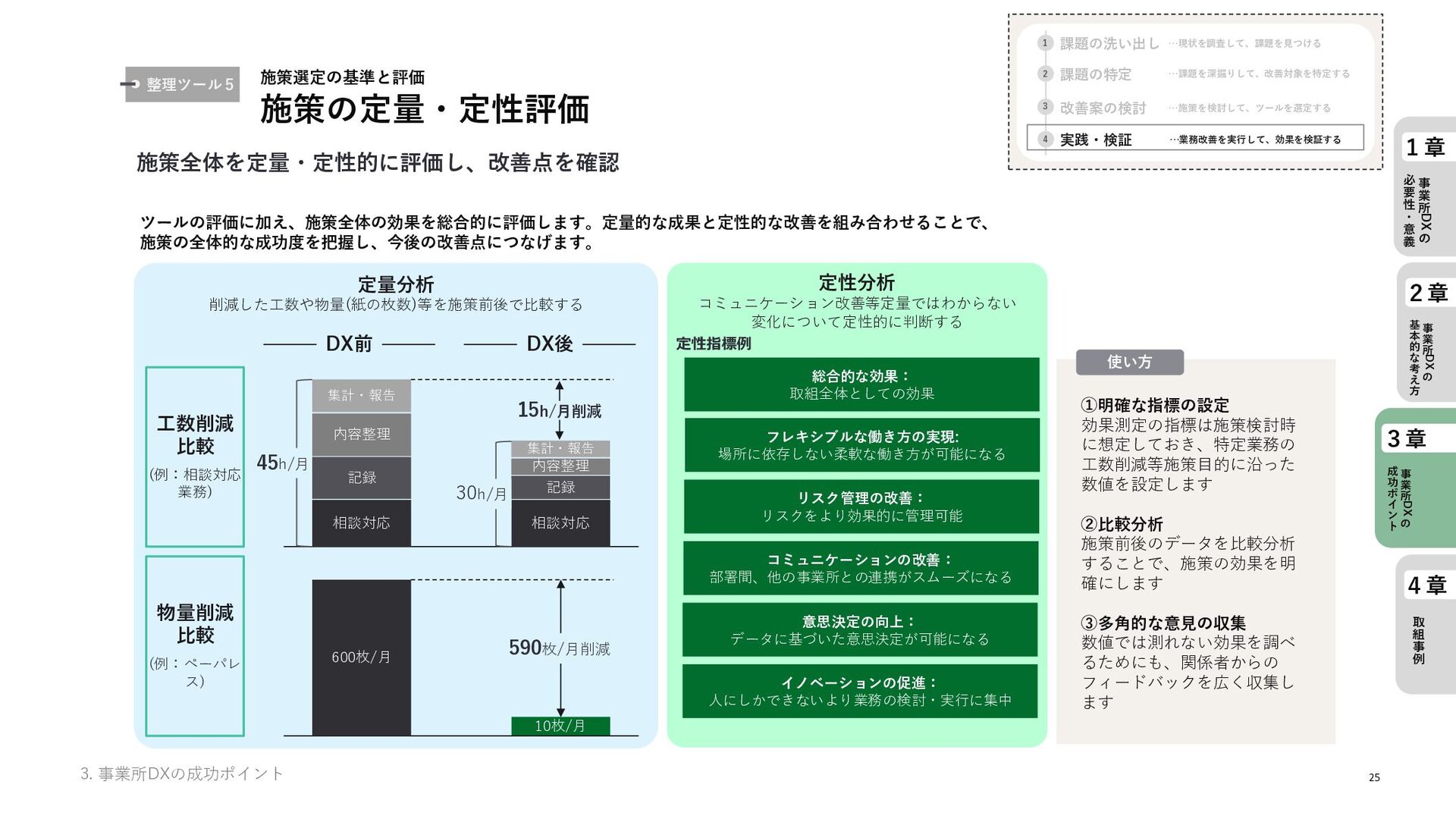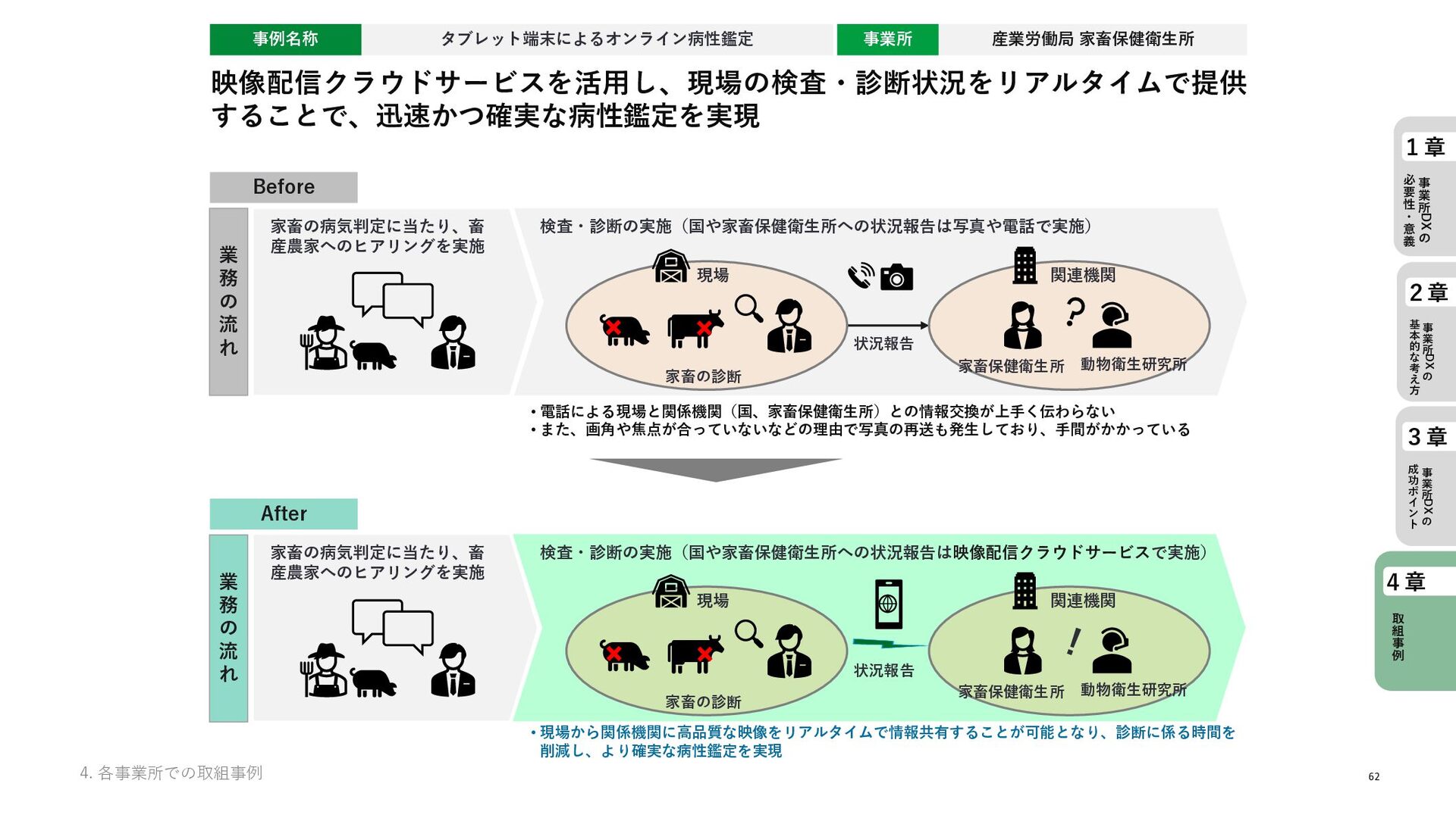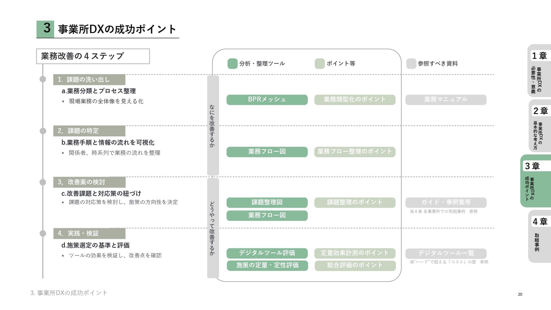 がある これまで紙を出力し所内で回付していた事務連絡とその添付資料について、ペーパレス化を実施 ・簡易決裁整理簿のExcelファイルを作成し、マクロ機能を利用した署名に変更 ・添付書類を共有フォルダに格納し、紙の保管を廃止。資料を共有サーバ上で確認する運用に変更 背景・業務 課題 対応策 実施効果 ✓ 膨大な量の紙書類を都度印 刷・管理するのにコスト・手 間がかかる ✓ 下駄印・承認印の運用による 押印の手間や、場所の制約が ある ✓ Excelマクロの簡易決裁整理 簿を作成し、添付資料と合わ せて所内NW上の共有フォル ダに格納。Excelで起案・承 認を行い、Excelのリンクか ら添付ファイルを確認する運 用に変更 ✓ マクロの処理は、生成AIによ りコード文を作成 ✓ ペーパレス化による、年間約 5,000枚分の紙の印刷・保管 コスト削減 ✓ 起案・承認のリモート化に加 え、データ管理による回覧状 況の把握等の活用に向けた利 便性性の向上 取組概要 プロセス類型 更新・閲覧 対象部署の概要 • SW:表計算ソフト (Excel※既存) • SaaS:生成AI • 他:共有フォルダ 調達項目 水道局南部支所庶務課では、事務連絡等の所内の回付・承認業務において、紙の運 用を廃止し、年間5,000枚の紙資料を削減 相談対応 申請・審査 現場業務 管理業務 業務類型 HW:ハードウェア SW:ソフトウェア 4. 各事業所での取組事例 簡易決裁業務へのExcel・マクロ活用によるペーパレス化 事例名称 水道局 南部支所 庶務課 事業所 取 組 事 例 4章 事 業 所 DX の 成 功 ポ イ ン ト 3章 事 業 所 DX の 必 要 性 ・ 意 義 1章 事 業 所 DX の 基 本 的 な 考 え 方 2章 支所(配水施設維持管理や断減水の応急措置、水道料金徴収等を行う)における • 文書の受発、編集及び保存、公印の管理業務 • 人事・給与・経理、固定資産業務 • 物件の調達、工事請負、物品購買その他の契約業務