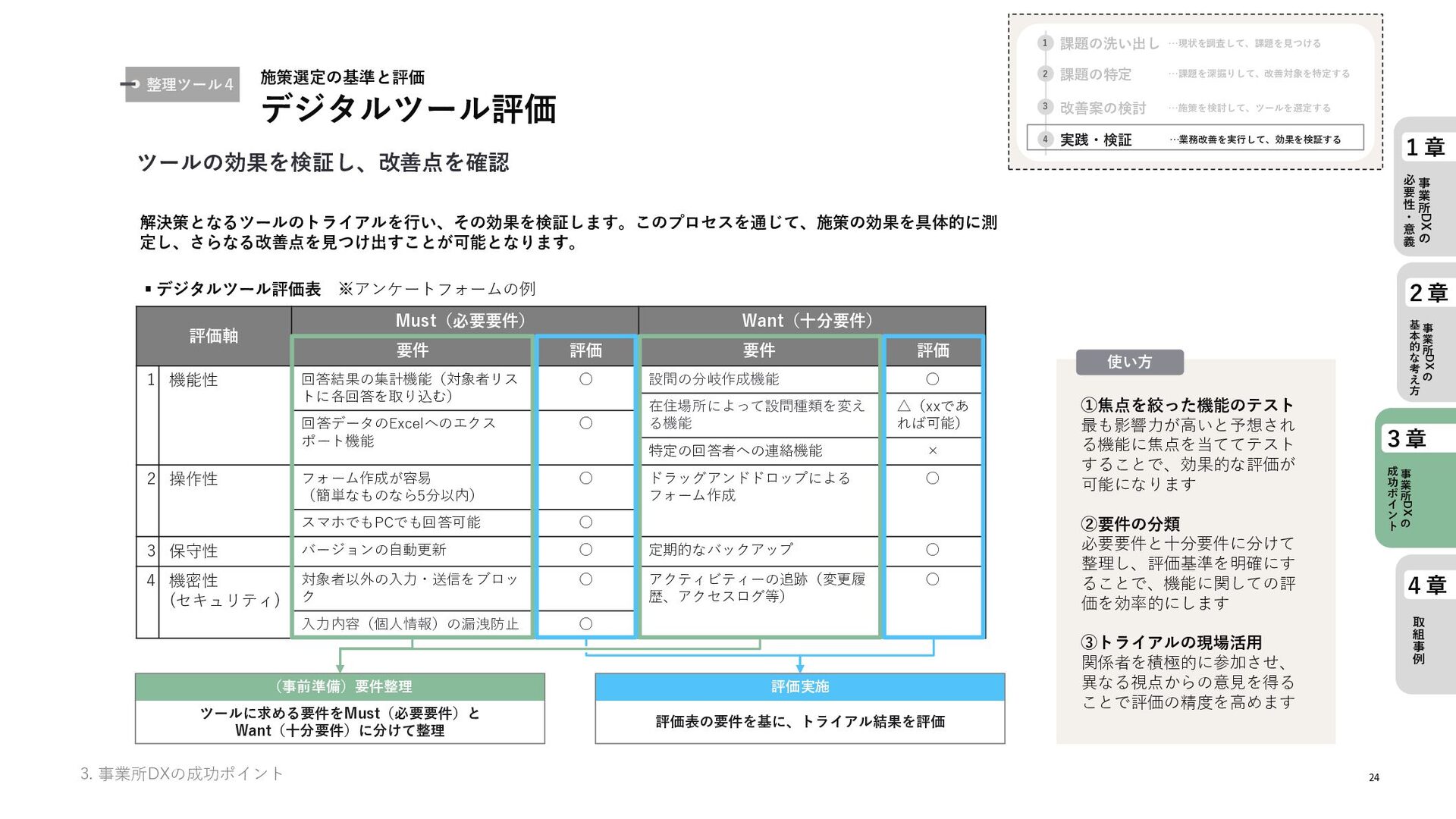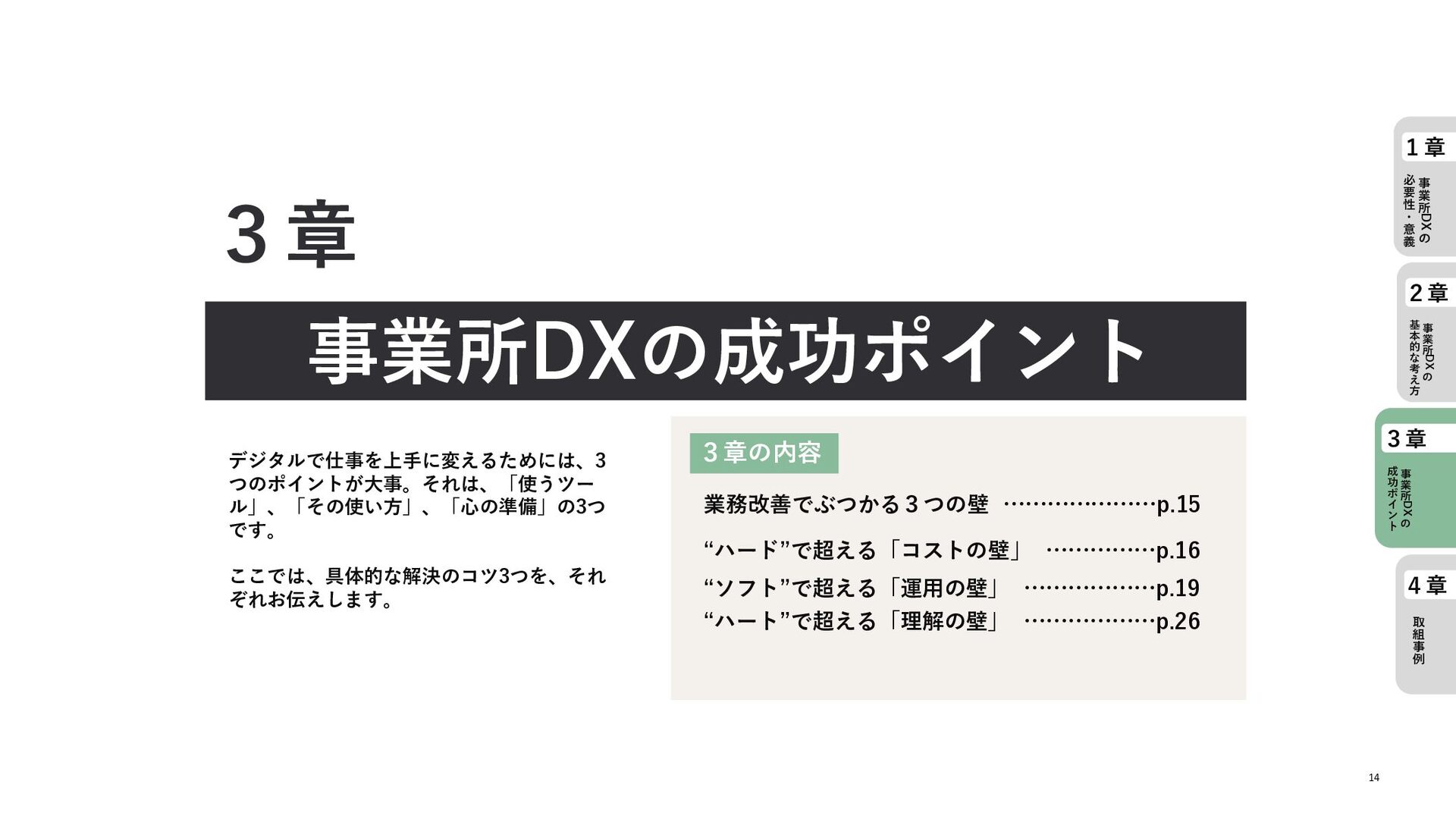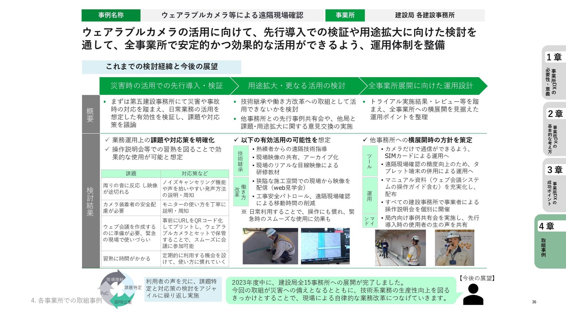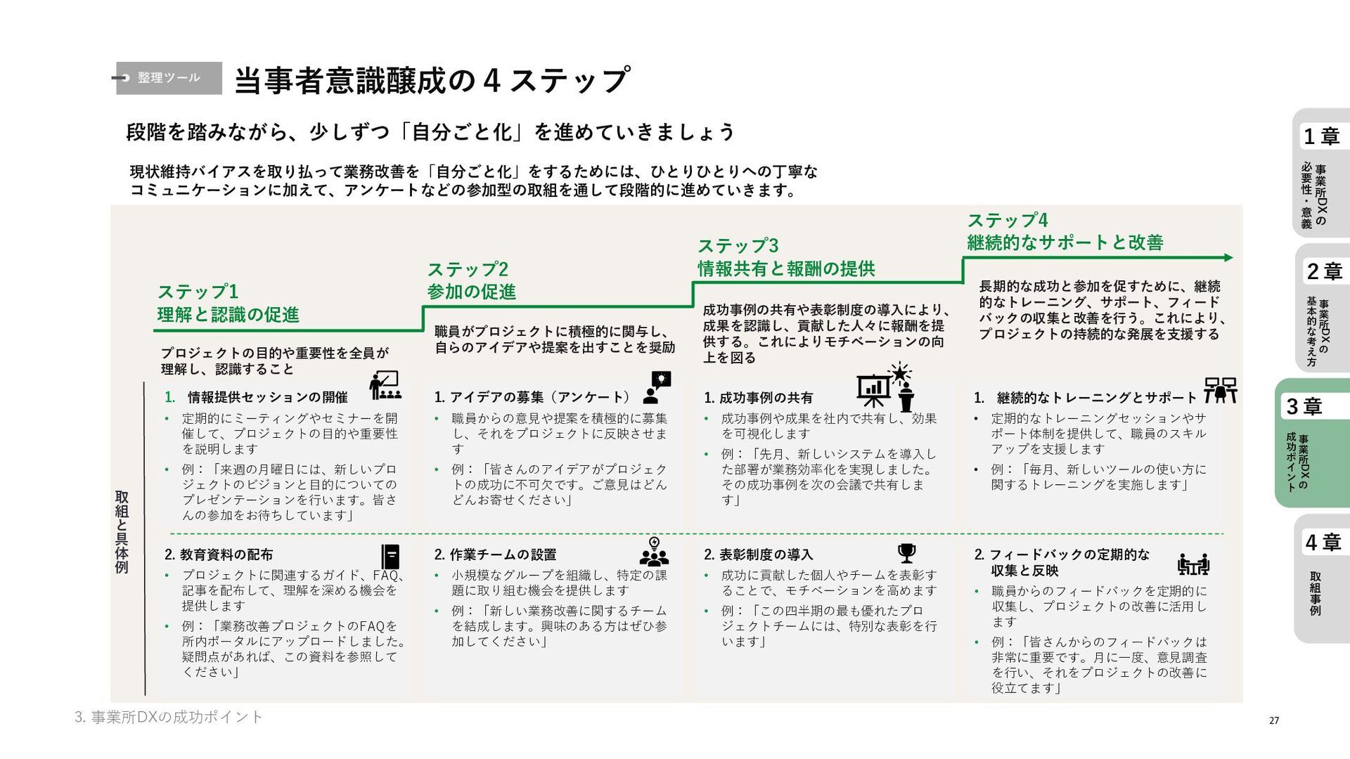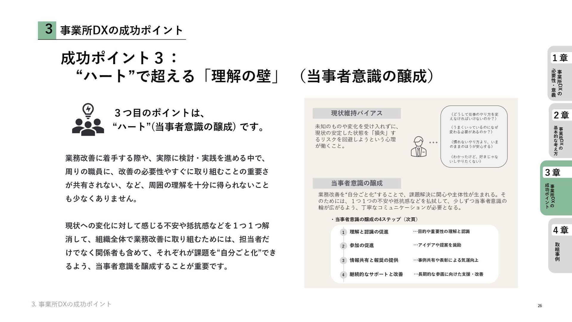がある これまで紙を出力し所内で回付していた事務連絡とその添付資料について、ペーパレス化を実施 ・簡易決裁整理簿のExcelファイルを作成し、マクロ機能を利用した署名に変更 ・添付書類を共有フォルダに格納し、紙の保管を廃止。資料を共有サーバ上で確認する運用に変更 背景・業務 課題 対応策 実施効果 ✓ 膨大な量の紙書類を都度印 刷・管理するのにコスト・手 間がかかる ✓ 下駄印・承認印の運用による 押印の手間や、場所の制約が ある ✓ Excelマクロの簡易決裁整理 簿を作成し、添付資料と合わ せて所内NW上の共有フォル ダに格納。Excelで起案・承 認を行い、Excelのリンクか ら添付ファイルを確認する運 用に変更 ✓ マクロの処理は、生成AIによ りコード文を作成 ✓ ペーパレス化による、年間約 5,000枚分の紙の印刷・保管 コスト削減 ✓ 起案・承認のリモート化に加 え、データ管理による回覧状 況の把握等の活用に向けた利 便性性の向上 取組概要 プロセス類型 更新・閲覧 対象部署の概要 • SW:表計算ソフト (Excel※既存) • SaaS:生成AI • 他:共有フォルダ 調達項目 水道局南部支所庶務課では、事務連絡等の所内の回付・承認業務において、紙の運 用を廃止し、年間5,000枚の紙資料を削減 相談対応 申請・審査 現場業務 管理業務 業務類型 HW:ハードウェア SW:ソフトウェア 4. 各事業所での取組事例 簡易決裁業務へのExcel・マクロ活用によるペーパレス化 事例名称 水道局 南部支所 庶務課 事業所 取 組 事 例 4章 事 業 所 DX の 成 功 ポ イ ン ト 3章 事 業 所 DX の 必 要 性 ・ 意 義 1章 事 業 所 DX の 基 本 的 な 考 え 方 2章 支所(配水施設維持管理や断減水の応急措置、水道料金徴収等を行う)における • 文書の受発、編集及び保存、公印の管理業務 • 人事・給与・経理、固定資産業務 • 物件の調達、工事請負、物品購買その他の契約業務
