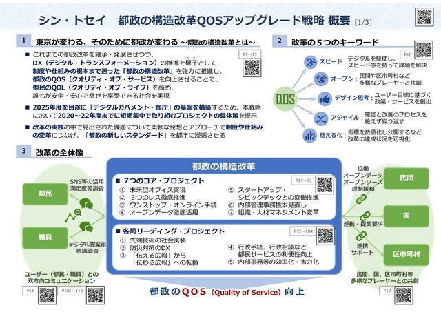7つのコア・プロジェクト 各局リーディング・プロジェクト ① 未来型オフィス実現 ② 5つのレス徹底推進 ③ ワンストップ・オンライン手続 ④ オープンデータ徹底活用 ⑤ スタートアップ・ シビックテックとの協働推進 ⑥ 内部管理事務抜本見直し ⑦ 組織・人材マネジメント変革 ① 先端技術の社会実装 ② 防災対策のDX ③ 「伝える広報」から 「伝わる広報」への転換 ④ 行政手続、行政相談など 都民サービスの利便性向上 ⑤ 内部事務等の効率化・省力化 都政の構造改革 都民 職員 民間 国 区市町村 都 政 の Q O S (Quality of Service)向 上 これまでの都政改革を継承・発展させつつ、 DX(デジタル・トランスフォーメーション)の推進を梃子として 制度や仕組みの根本まで遡った「都政の構造改革」を強力に推進し、 都政のQOS(クオリティ・オブ・サービス)を向上させることで、 都民のQOL(クオリティ・オブ・ライフ)を高め、 誰もが安全・安心で幸せを享受できる社会を実現 2025年度を目途に「デジタルガバメント・都庁」の基盤を構築するため、本戦略 において2020~22年度までに短期集中で取り組むプロジェクトの具体策を提示 改革の実践の中で見出された課題について柔軟な発想とアプローチで制度や仕組み の変革につなげ、「都政の新しいスタンダード」を都庁に浸透させる 1 2 3 QOS デジタルを駆使し、 スピード感を持って課題を解決 民間や区市町村など 多様なプレーヤーと共創 確認と改善のプロセスを 絶えず繰り返す 指標を数値化し公開するなど 改革の達成状況を可視化 ユーザー目線に基づく 政策・サービスを創出 スピード: オープン: アジャイル: 見える化: デザイン思考: SNS等の活用 満足度等調査 デジタル提案箱 意識調査 協働 オープンデータ オープンソース 規制緩和 連携・提案要求 連携 サポート ユーザー(都民・職員)との 双方向コミュニケーション 民間、国、区市町村等 多様なプレーヤーとの共創 て こ P5~15 P17~73 P10 P75~104 P11 P12 P105~119