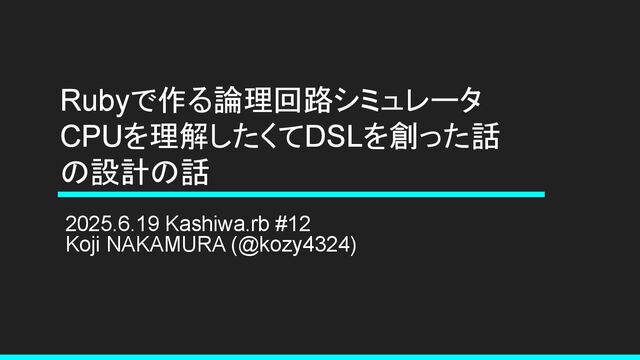 Rubyで作る論理回路シミュレータ CPUを理解したくてDSLを創った話 の設計の話 2025.6.19 Kashiwa.rb #12 Koji NAKAMURA (@kozy4324)