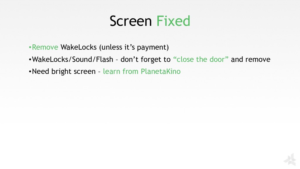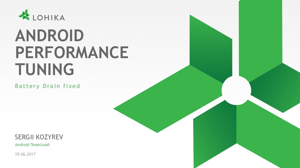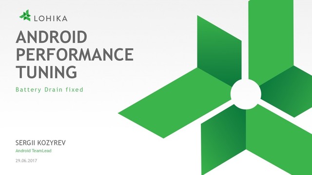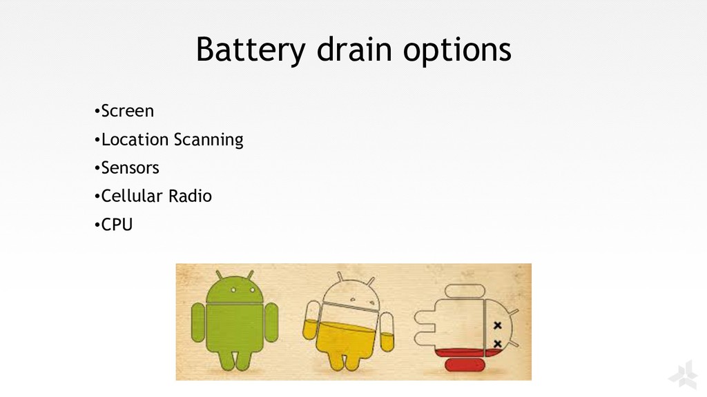 This presentation uncovers what are the main battery drain reasons and how to overcome them. Second part of the presentation gives useful tips and tricks how to develop an app keeping battery performance in mind.