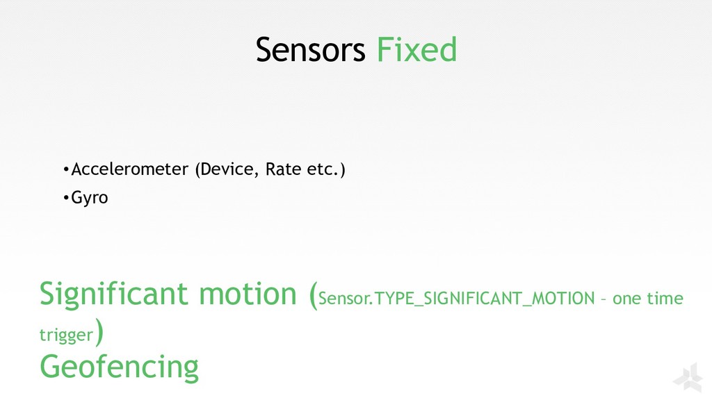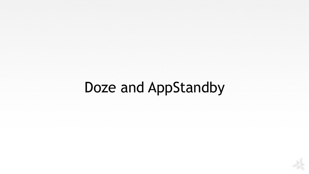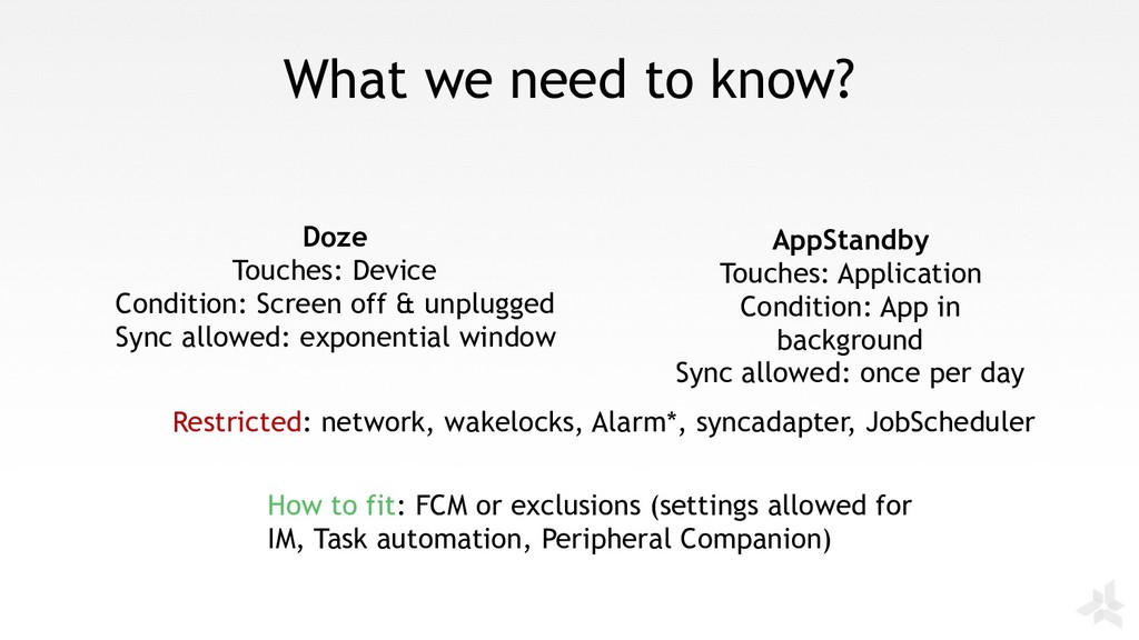 in background Sync allowed: once per day Doze Touches: Device Condition: Screen off & unplugged Sync allowed: exponential window Restricted: network, wakelocks, Alarm*, syncadapter, JobScheduler How to fit: FCM or exclusions (settings allowed for IM, Task automation, Peripheral Companion)