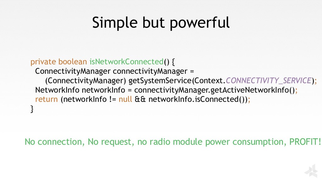 (ConnectivityManager) getSystemService(Context.CONNECTIVITY_SERVICE); NetworkInfo networkInfo = connectivityManager.getActiveNetworkInfo(); return (networkInfo != null && networkInfo.isConnected()); } No connection, No request, no radio module power consumption, PROFIT!
