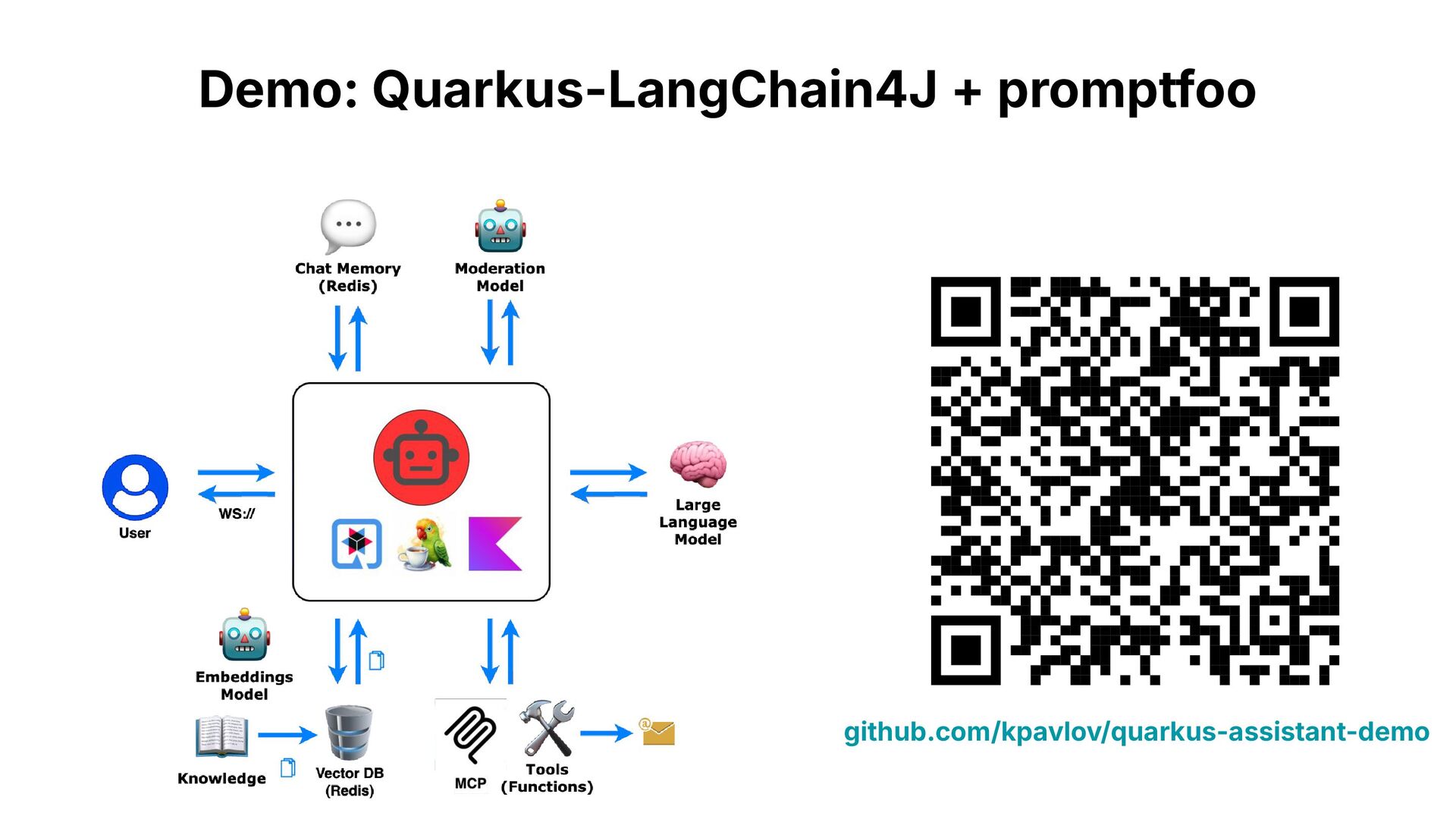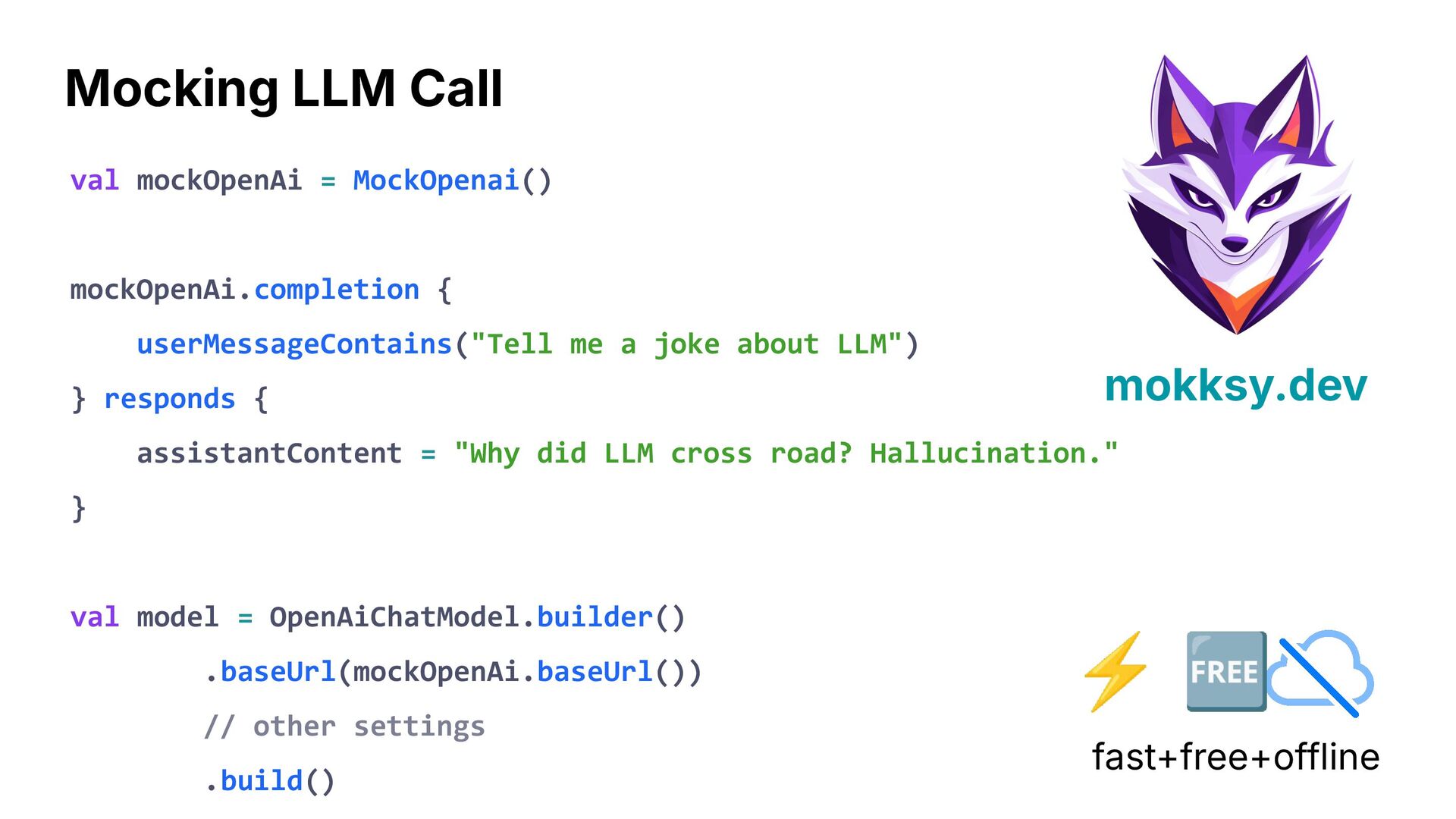 As LLMs reshape software development, Java and Kotlin developers face unique challenges when integrating these powerful AI models into production applications. This talk demonstrates how to build AI-powered applications using LangChain4j, Quarkus and Kotlin. We'll explore how Kotlin's expressive syntax and coroutines transform complex asynchronous Java code intoclean, maintainable code on Kotlin. Through a practical example, you'll see LangChain4j's capabilities for RAG, function calling, Model Context Protocol, and request moderation. The heart of this presentation addresses the testing challenge: how do you verify AI integrations without unpredictable responses, high costs, or rate limits? I'll introduce Mokksy, a testing library that enables deterministic, fast, and reliable tests for AI integrations. You'll learn practical patterns for mocking and evaluating LLMs responses. Who is this talk for? Java and Kotlin developers looking to integrate LLMs into production systems, teams struggling with testing AI components, and engineers seeking practical strategies for maintaining reliability in AI applications. Attendees will leave with code examples and approaches they can immediately apply to their projects.