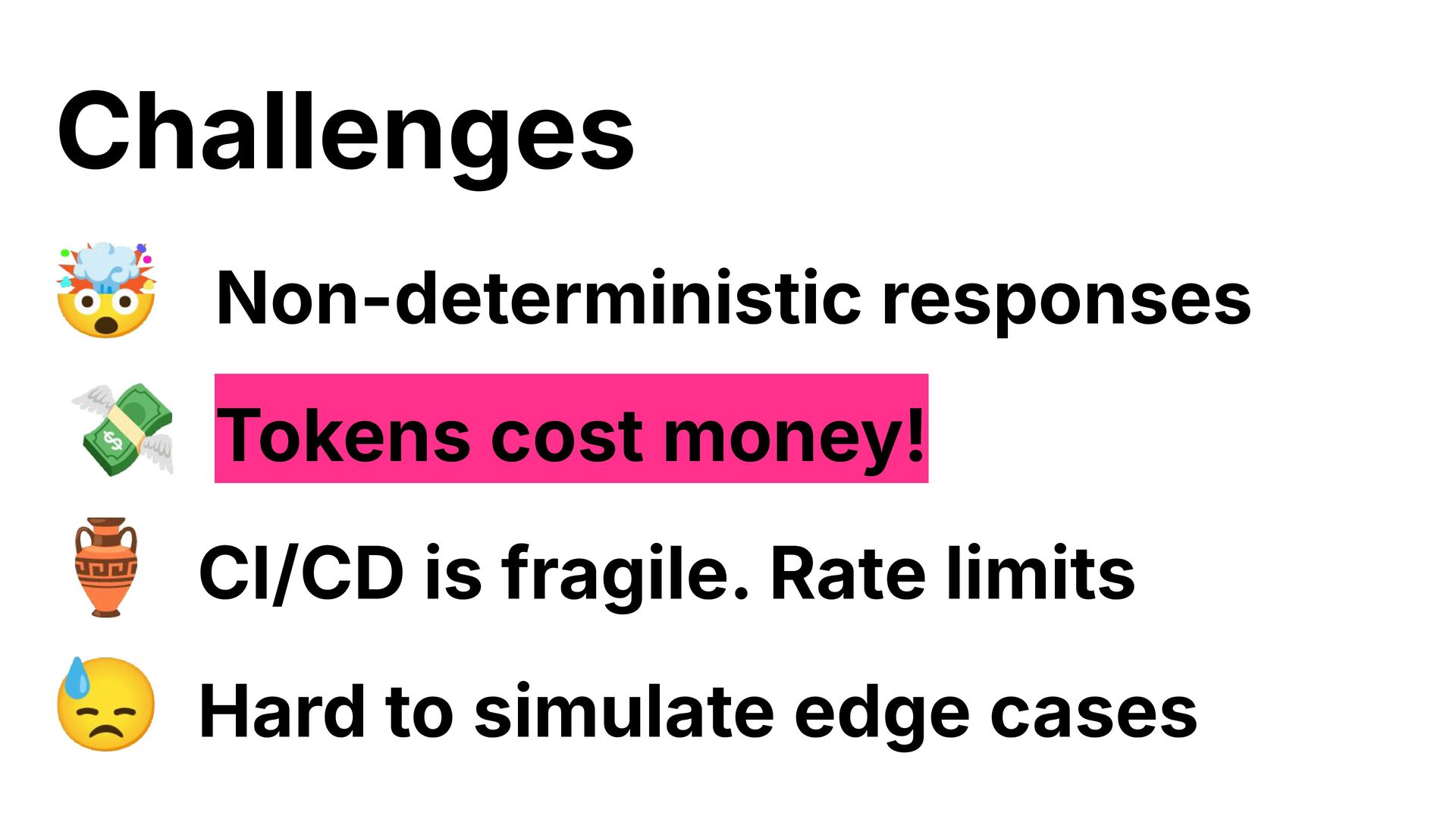 6. Challenges 🤯 Non-deterministic responses 💸 Tokens cost money! 🏺 CI/CD