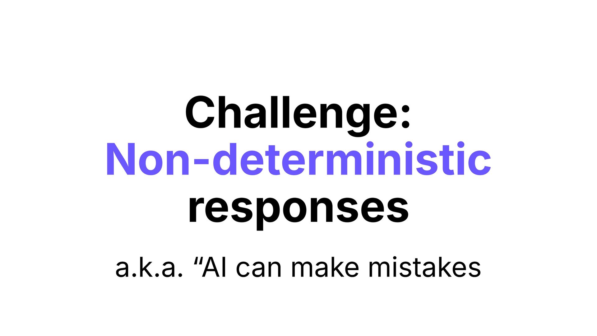 It highlights the challenges of testing AI-generated code, including non-deterministic responses and slow LLMs.