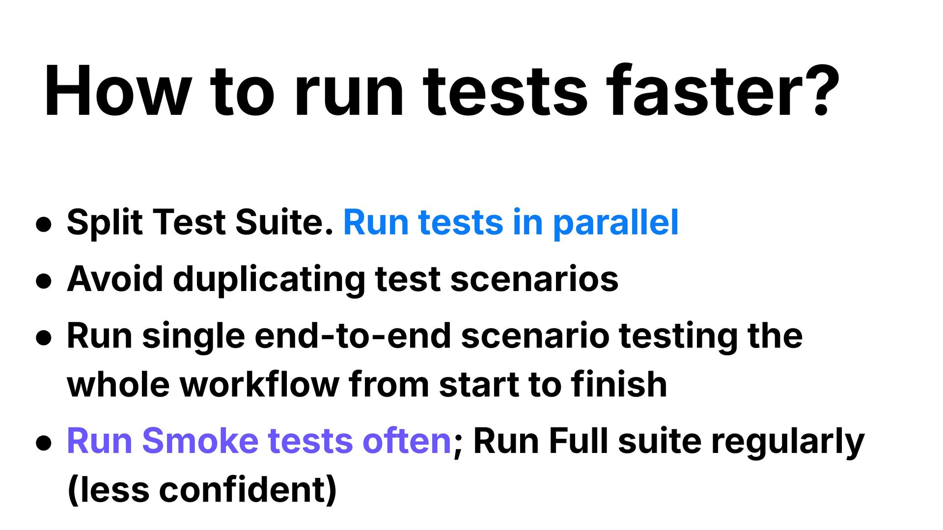 duplicating test scenarios • Run single end-to-end scenario testing the whole workflow from start to finish • Run Smoke tests often; Run Full suite regularly (less confident) How to run tests faster?