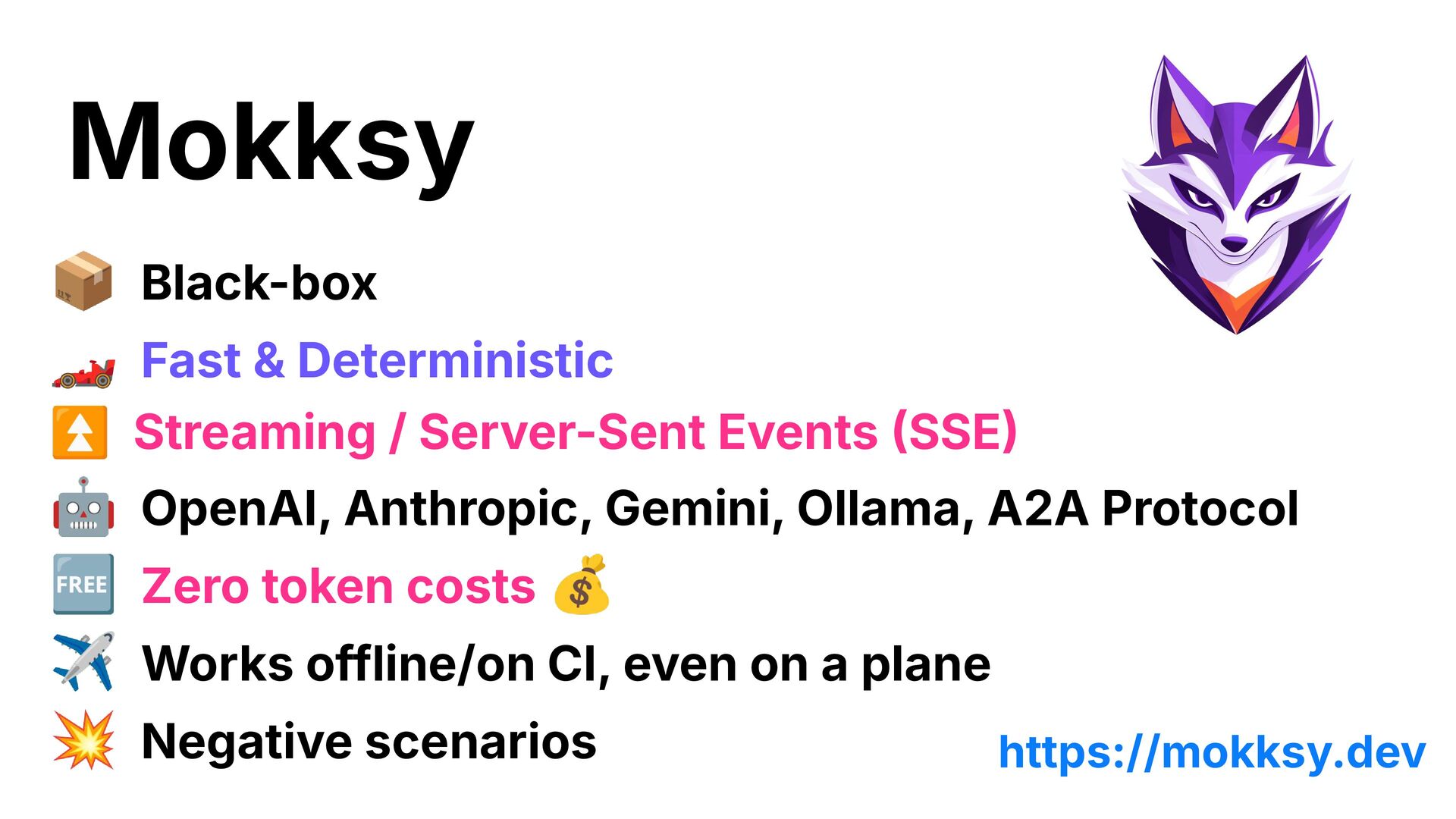 Server-Sent Events SSE 🤖 OpenAI, Anthropic, Gemini, Ollama, A2A Protocol 🆓 Zero token costs 💰 ✈ Works offline/on CI, even on a plane 💥 Negative scenarios https://mokksy.dev