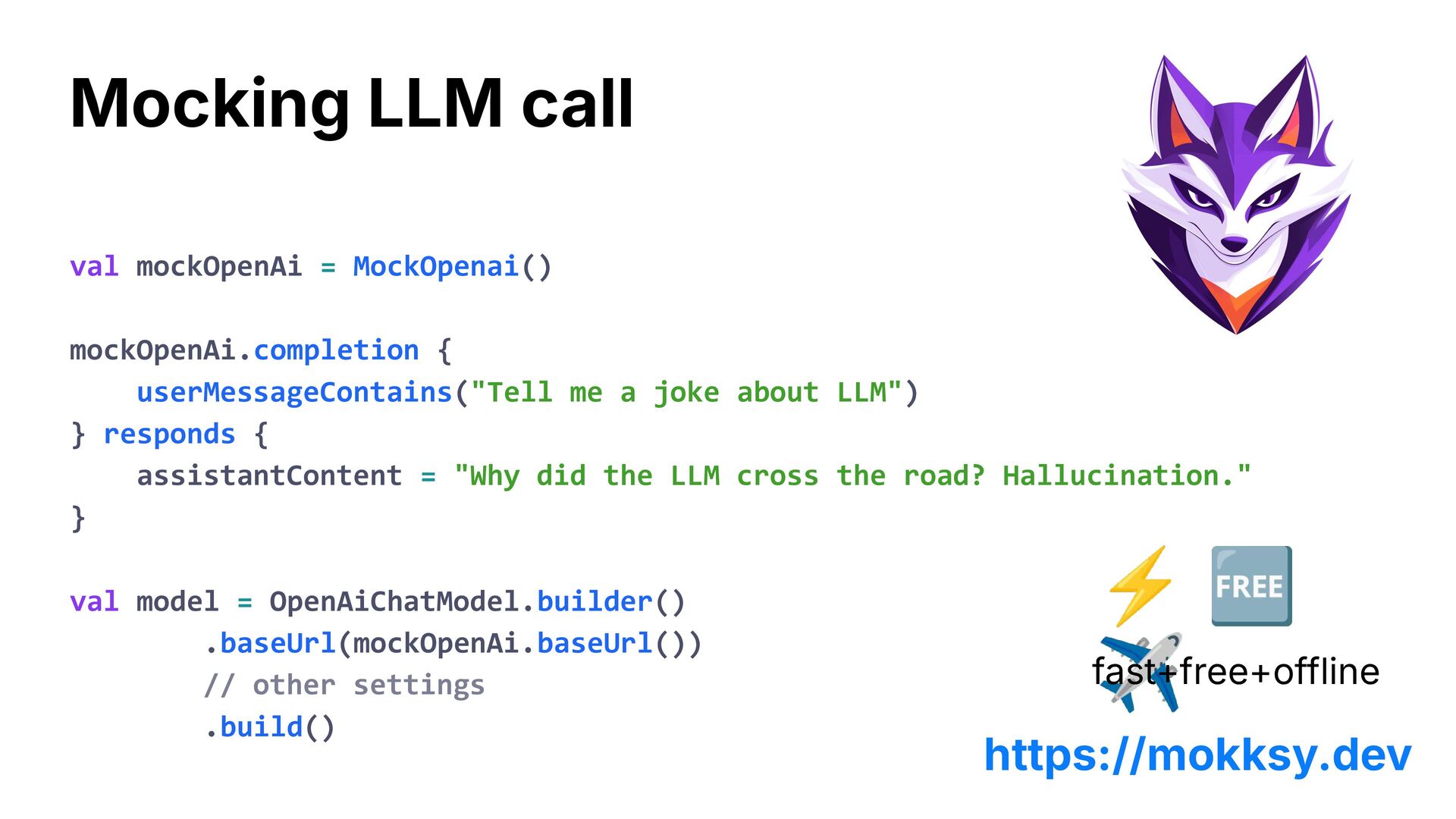 about LLM") } responds { assistantContent = "Why did the LLM cross the road? Hallucination." } val model = OpenAiChatModel.builder() .baseUrl(mockOpenAi.baseUrl()) // other settings .build() Mocking LLM call ⚡ 🆓 ✈ fast+free+offline https://mokksy.dev
