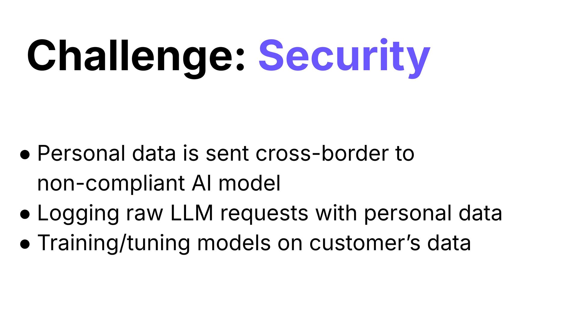 • Logging raw LLM requests with personal data • Training/tuning models on customerʼs data Challenge: Security