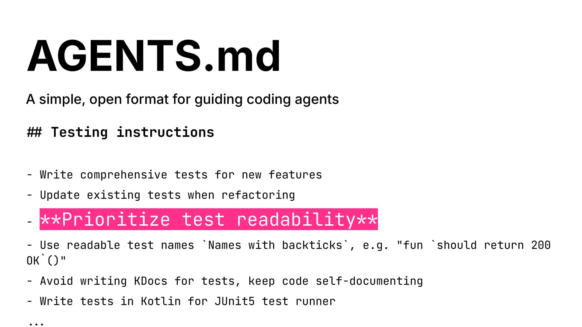 Testing instructions - Write comprehensive tests for new features - Update existing tests when refactoring - **Prioritize test readability** - Use readable test names `Names with backticks`, e.g. "fun `should return 200 OK`()" - Avoid writing KDocs for tests, keep code self-documenting - Write tests in Kotlin for JUnit5 test runner ...