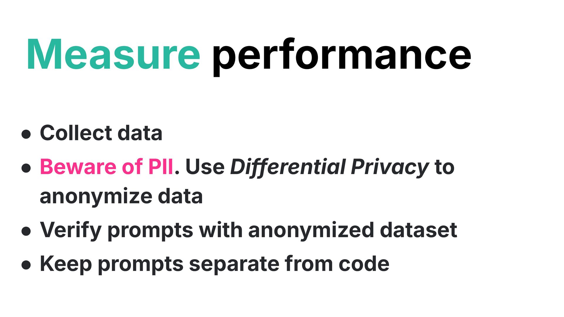 to anonymize data • Verify prompts with anonymized dataset • Keep prompts separate from code Measure performance