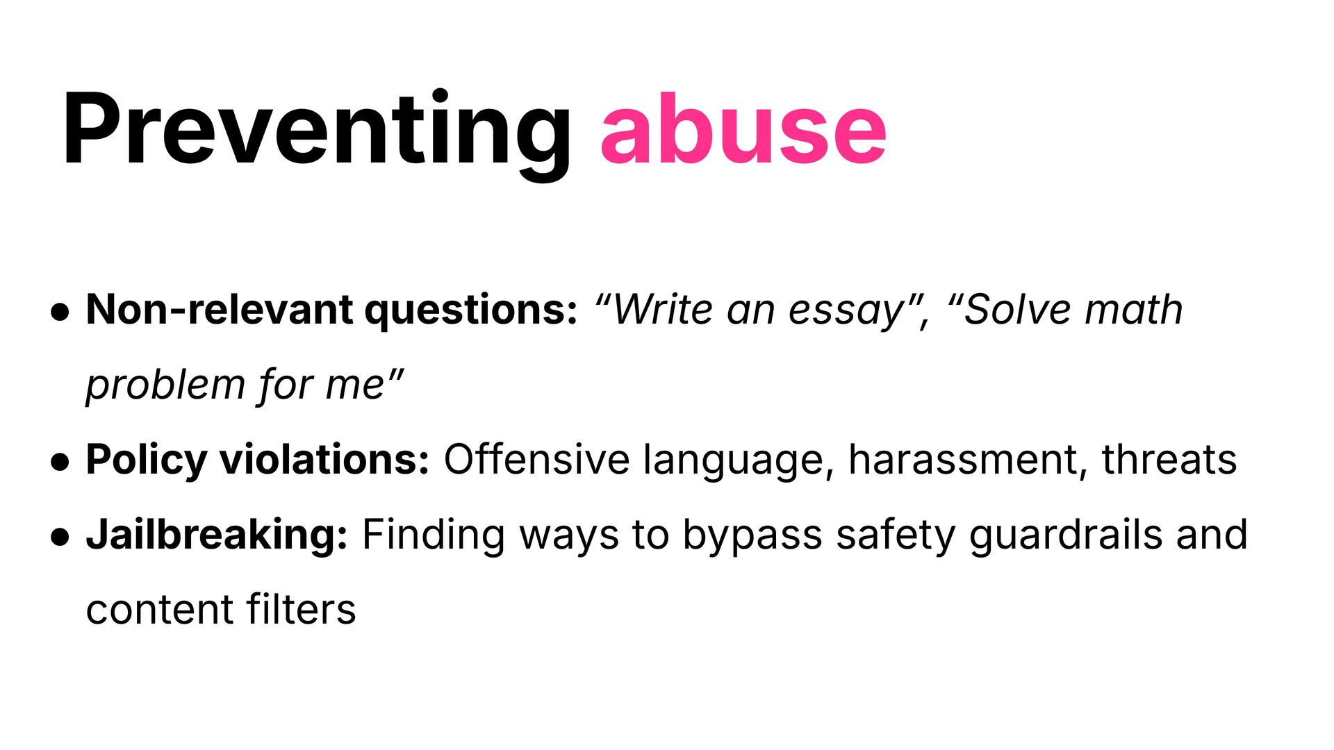 meˮ • Policy violations: Offensive language, harassment, threats • Jailbreaking: Finding ways to bypass safety guardrails and content filters Preventing abuse