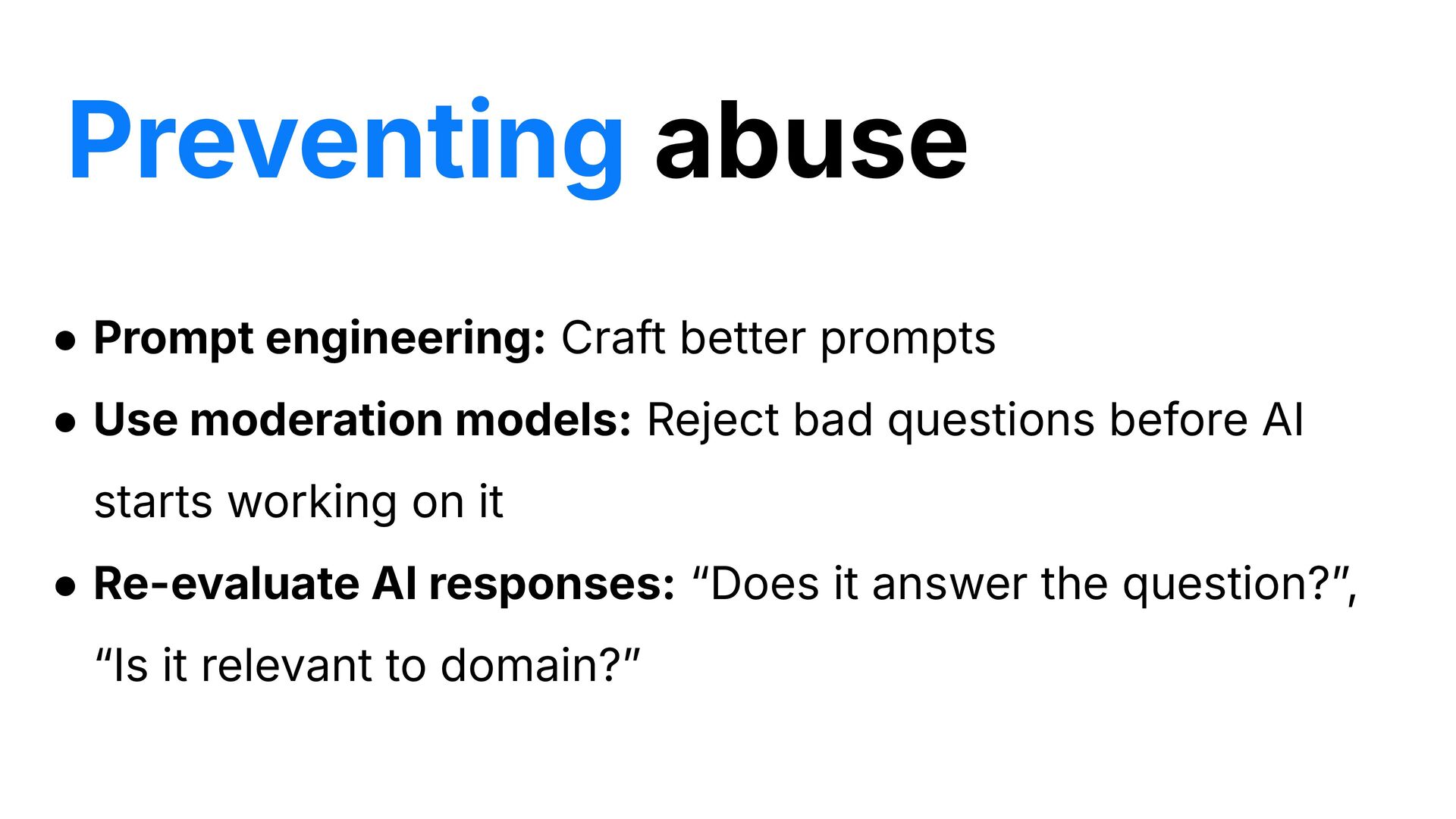 Reject bad questions before AI starts working on it • Re-evaluate AI responses: “Does it answer the question?ˮ, “Is it relevant to domain?ˮ Preventing abuse