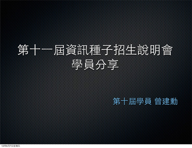 第十⼀一屆資訊種子招生說明會 學員分享 第十屆學員 曾建勳 13年6月7日星期五
