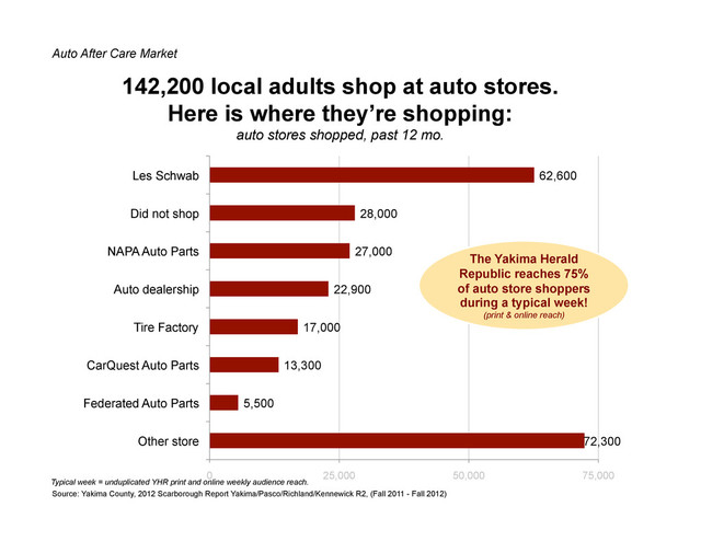 for local consumers. auto service or repair, past 12 mo. 12,900 8,400 9,200 11,100 16,000 16,700 18,300 33,600 43,700 44,400 48,800 52,200 77,700 141,900 0 25,000 50,000 75,000 100,000 125,000 150,000 None Muffler Shocks/struts Car radio/stereo equipment Transmission repair Paint/body work Auto glass replacement/repair Other car repair Brake repair Car battery Tune-up/spark plugs Anti-freeze/coolant New tires Oil filter/oil change Auto After Care Market Source: Yakima County, 2012 Scarborough Report Yakima/Pasco/Richland/Kennewick R2, (Fall 2011 - Fall 2012)