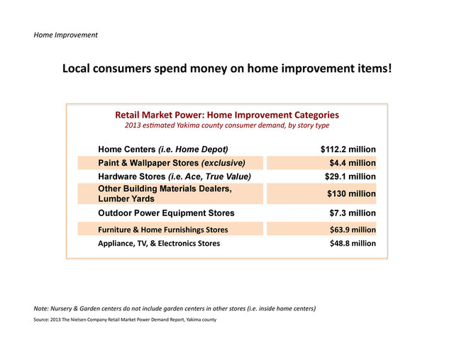 Improvement Home Centers (i.e. Home Depot) $112.2 million Paint & Wallpaper Stores (exclusive) $4.4 million Hardware Stores (i.e. Ace, True Value) $29.1 million Other Building Materials Dealers, Lumber Yards $130 million Outdoor Power Equipment Stores $7.3 million Furniture & Home Furnishings Stores $63.9 million Appliance, TV, & Electronics Stores $48.8 million Retail Market Power: Home Improvement Categories 2013 es1mated Yakima county consumer demand, by story type Source: 2013 The Nielsen Company Retail Market Power Demand Report, Yakima county Note: Nursery & Garden centers do not include garden centers in other stores (i.e. inside home centers)