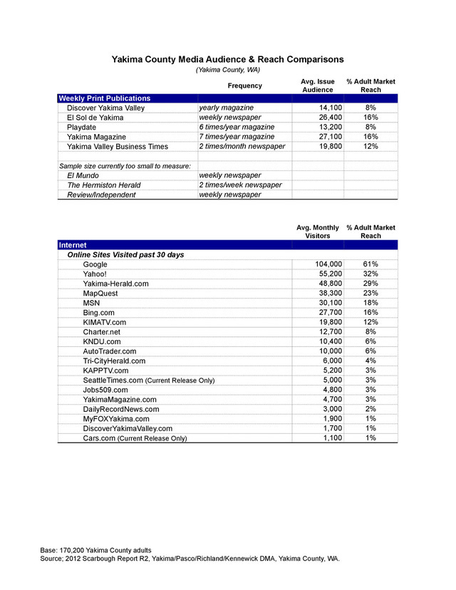 Yakima/Pasco/Richland/Kennewick DMA, Yakima County, WA. Avg. Issue Audience % Adult Market Reach Weekly Print Publications Discover Yakima Valley 14,100 8% El Sol de Yakima 26,400 16% Playdate 13,200 8% Yakima Magazine 27,100 16% Yakima Valley Business Times 19,800 12% Sample size currently too small to measure: El Mundo The Hermiston Herald Review/Independent Avg. Monthly Visitors % Adult Market Reach 104,000 61% 55,200 32% 48,800 29% 38,300 23% 30,100 18% 27,700 16% 19,800 12% 12,700 8% 10,400 6% 10,000 6% 6,000 4% 5,200 3% 5,000 3% 4,800 3% 4,700 3% 3,000 2% 1,900 1% 1,700 1% 1,100 1% Bing.com KIMATV.com Yakima County Media Audience & Reach Comparisons (Yakima County, WA) Online Sites Visited past 30 days yearly magazine weekly newspaper 6 times/year magazine 7 times/year magazine 2 times/month newspaper Frequency MapQuest MSN 2 times/week newspaper weekly newspaper weekly newspaper DiscoverYakimaValley.com Cars.com (Current Release Only) Internet SeattleTimes.com (Current Release Only) Jobs509.com YakimaMagazine.com DailyRecordNews.com MyFOXYakima.com Charter.net KNDU.com AutoTrader.com Tri-CityHerald.com KAPPTV.com Google Yahoo! Yakima-Herald.com