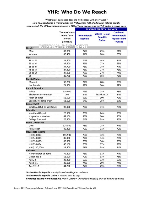 2 and 2011/2012 combined, Yakima County, WA Yakima County Adults (local market poten.al) Yakima Herald Republic Yakima Herald Republic Online Combined Yakima Herald Republic Print + Online Gender Men 83,800 77% 29% 81% Women 86,400 64% 28% 65% Age 18 to 24 21,600 74% 44% 74% 25 to 34 27,500 66% 27% 69% 35 to 44 34,700 73% 28% 77% 45 to 54 27,800 75% 27% 76% 55 to 64 27,900 73% 27% 74% 65+ 30,700 70% 15% 72% Marital Status Married 98,700 72% 28% 73% Not Married 71,500 69% 30% 72% Race & Ethnicity White 114,000 72% 28% 73% Black/African-‐American 700 24% less than 1% 24% Asian or other 55,500 69% 30% 72% Spanish/Hispanic origin 63,600 64% 25% 67% Employment Employed (full or part-‐Rme) 98,000 75% 31% 78% EducaBon less than HS grad 26,500 70% 24% 70% HS grad or equivelant 67,200 66% 20% 70% College Educated 76,500 74% 38% 76% Home Ownership Own 124,800 71% 28% 74% Rent/other 45,400 70% 31% 70% Household Income HHI $30,000+ 115,900 73% 32% 76% HHI $40,000+ 85,900 72% 34% 76% HHI $50,000+ 68,500 76% 36% 78% HHI 75,000+ 40,100 70% 37% 73% HHI $100,000+ 22,500 71% 38% 74% Children Have children at home 79,800 75% 31% 77% Under age 2 16,100 70% 33% 73% Age 2-‐5 22,200 69% 33% 69% Age 6-‐11 39,100 74% 29% 74% Age 12-‐17 41,700 77% 29% 78% Yakima Herald Republic = unduplicated weekly print audience Yakima Herald Republic Online = visitors, past 30 days Combined Yakima Herald Republic Print + Online = unduplicated weekly print and online audience What target audiences does the YHR engage with every week? How to read: During a typical week, the YHR reaches 77% of all men in Yakima County. How to read: The YHR reaches home owners. 71% of home owners read the YHR during a typical week. REACH OF TARGET AUDIENCES