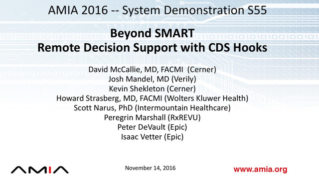 around standard-based APIs CDS Hooks Project overview and technical details CDS Hooks Demo Prototype work from EHR vendors and CDS service providers What’s Next Future challenges and Q&A