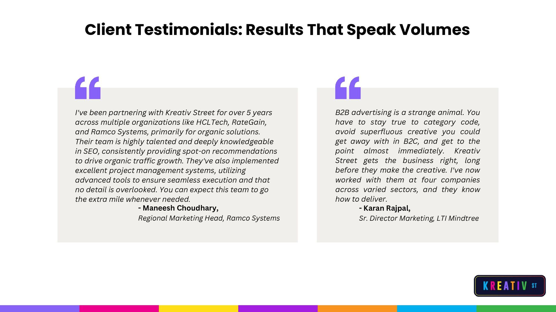 across multiple organizations like HCLTech, RateGain, and Ramco Systems, primarily for organic solutions. Their team is highly talented and deeply knowledgeable in SEO, consistently providing spot-on recommendations to drive organic traffic growth. They've also implemented excellent project management systems, utilizing advanced tools to ensure seamless execution and that no detail is overlooked. You can expect this team to go the extra mile whenever needed. - Maneesh Choudhary, Regional Marketing Head, Ramco Systems B2B advertising is a strange animal. You have to stay true to category code, avoid superfluous creative you could get away with in B2C, and get to the point almost immediately. Kreativ Street gets the business right, long before they make the creative. I've now worked with them at four companies across varied sectors, and they know how to deliver. - Karan Rajpal, Sr. Director Marketing, LTI Mindtree Client Testimonials: Results That Speak Volumes